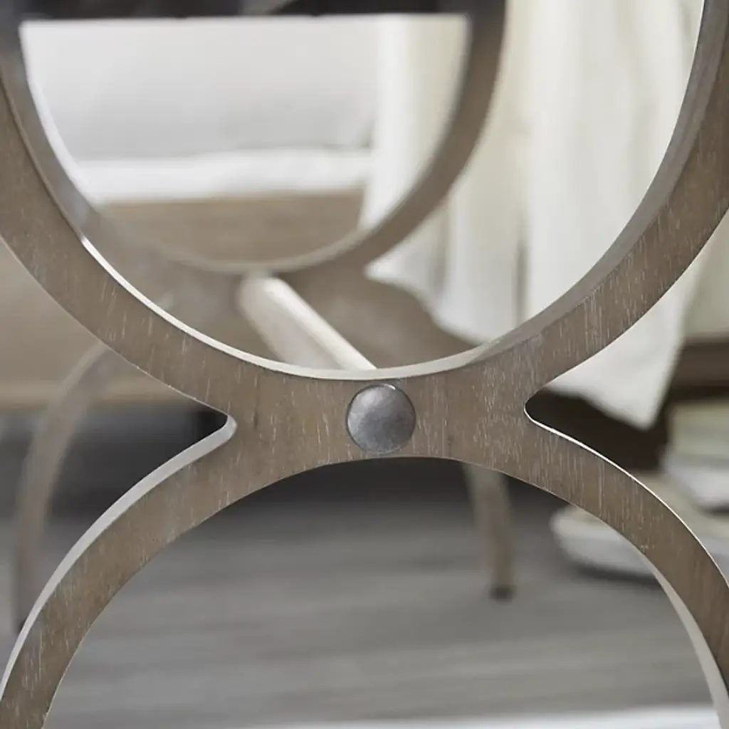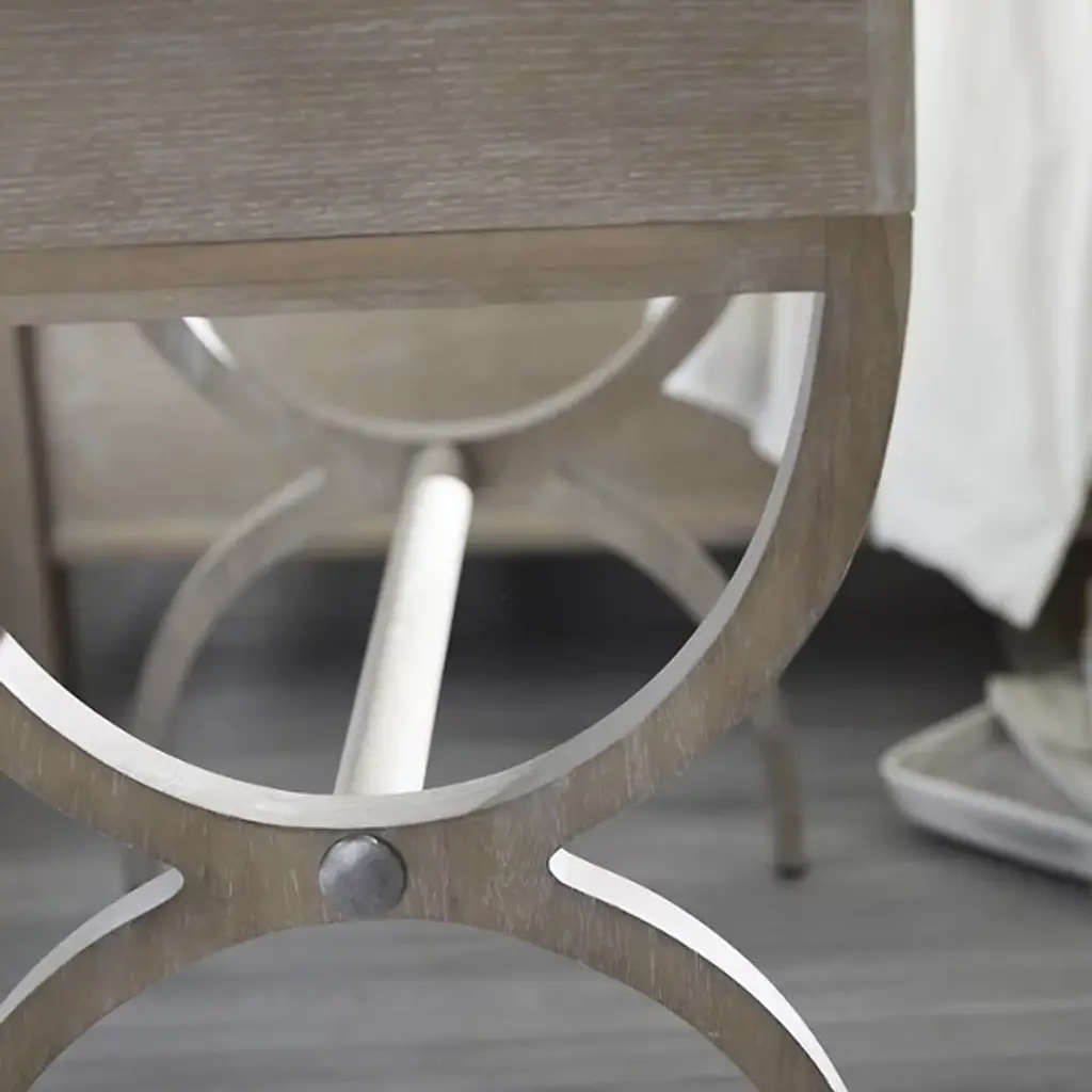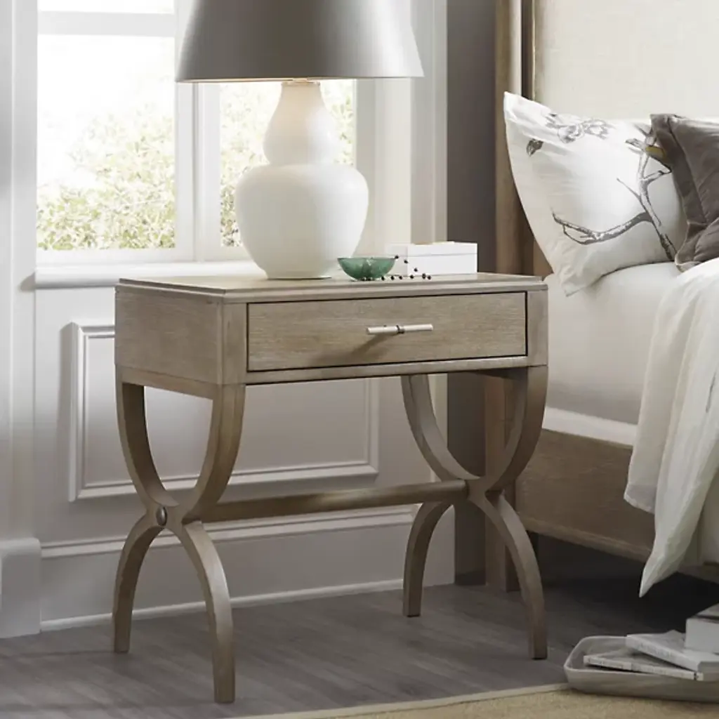 The Affinity Nightstand from Hooker Furniture features a curving, open structure that supports a slim, rectangular top. The textured surface lends a rustic presence to the form, complemented by a wire-brushed gray oak veneer that adds depth and character. Downward-curving legs contrast with upward-arcing supports, braced by a central crossbar that elevates the tabletop while holding a central drawer that offers small-accessory storage and shows off a slender crossbar-style pull that contrasts with the wood veneer.