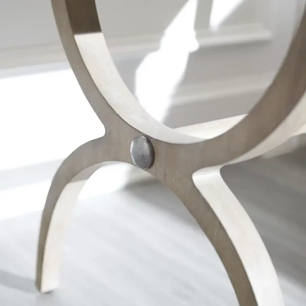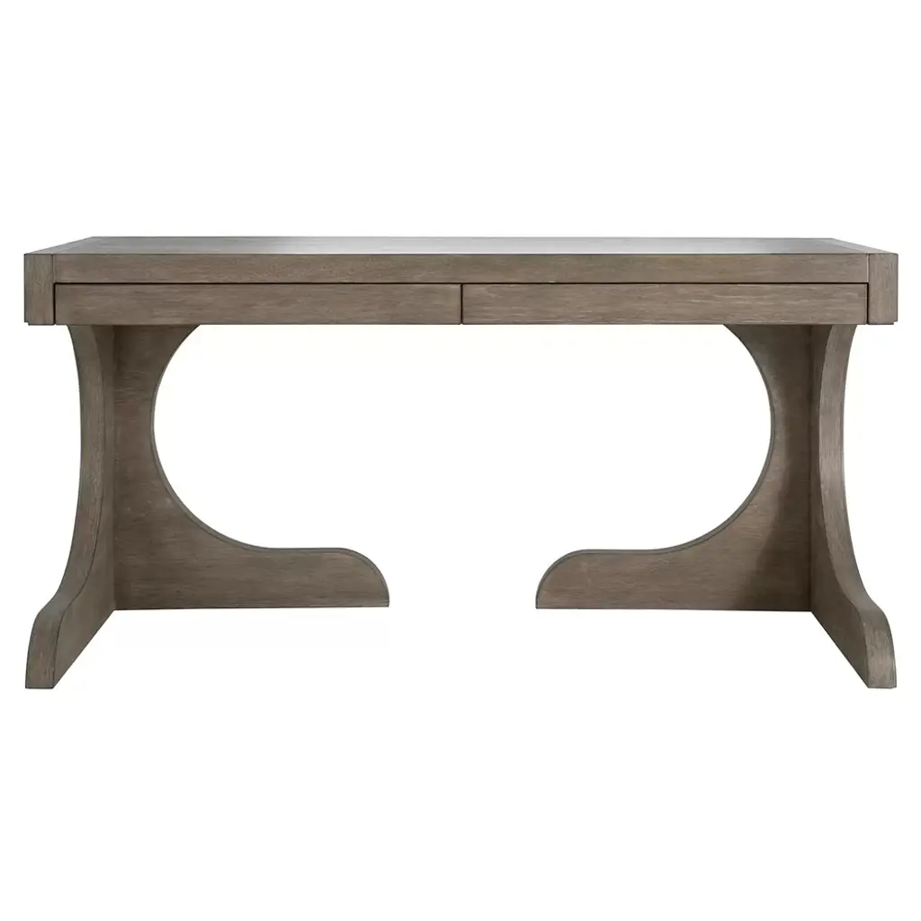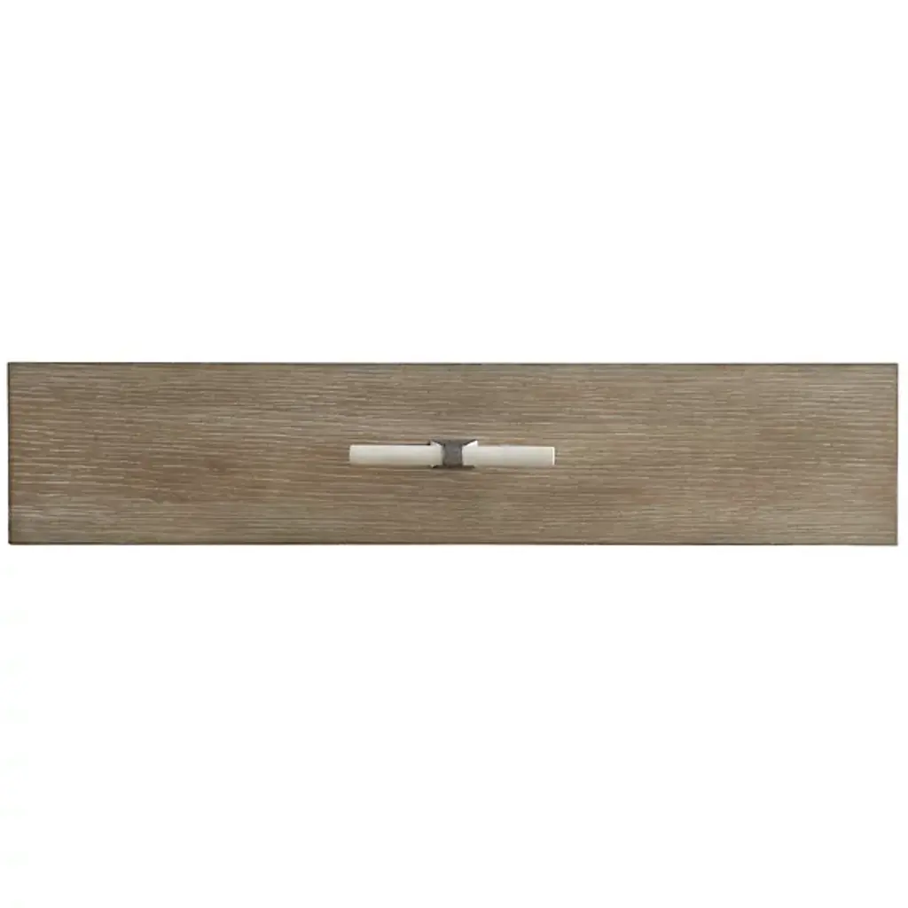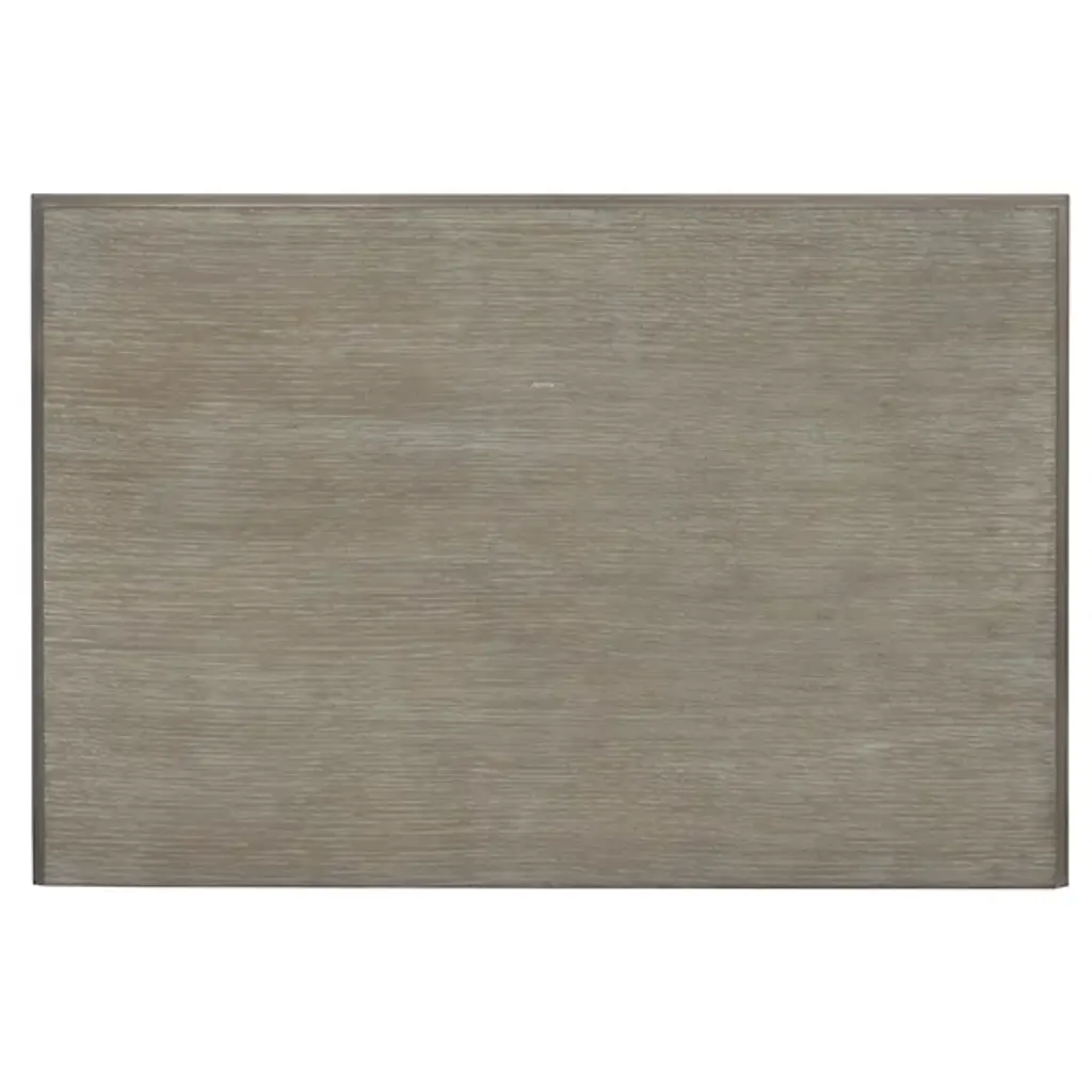 The Affinity Nightstand from Hooker Furniture features a curving, open structure that supports a slim, rectangular top. The textured surface lends a rustic presence to the form, complemented by a wire-brushed gray oak veneer that adds depth and character. Downward-curving legs contrast with upward-arcing supports, braced by a central crossbar that elevates the tabletop while holding a central drawer that offers small-accessory storage and shows off a slender crossbar-style pull that contrasts with the wood veneer.