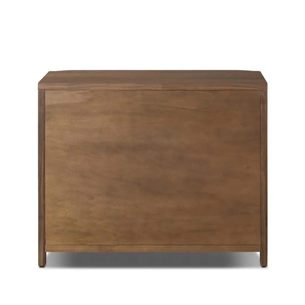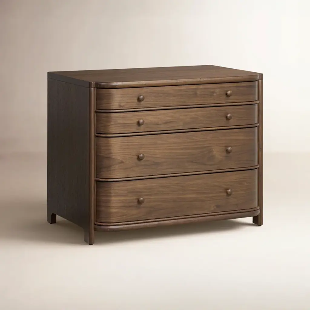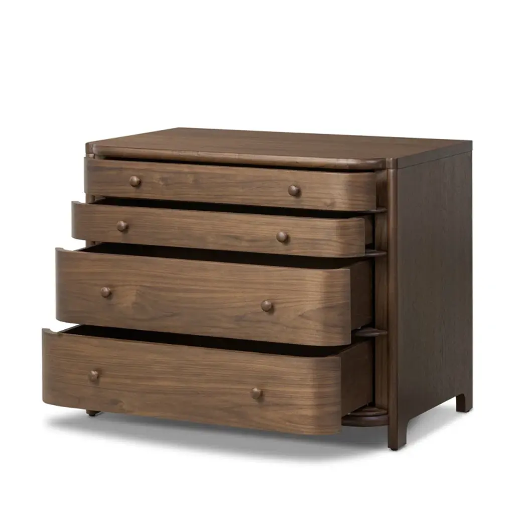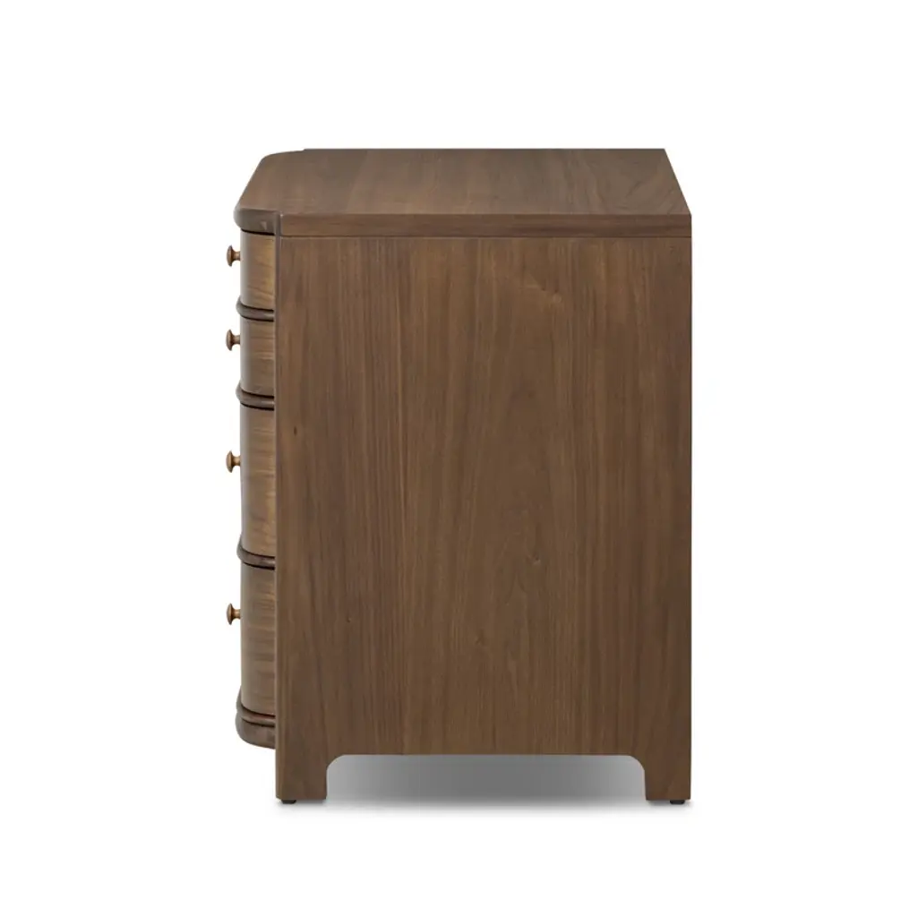 A design collaboration by Amber Lewis and Four Hands. Bring warmth, character, and extra storage to a room with this quiet stunner. Crafted from rich, dark brown walnut, this spacious nightstand features curved front drawers for extra movement throughout. Finished with wooden knobs and paddle leg detailing.