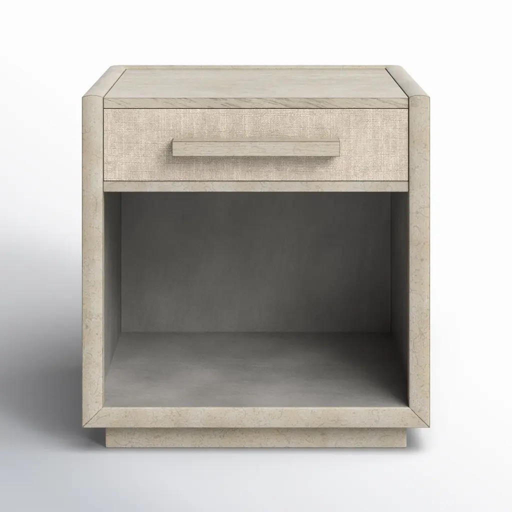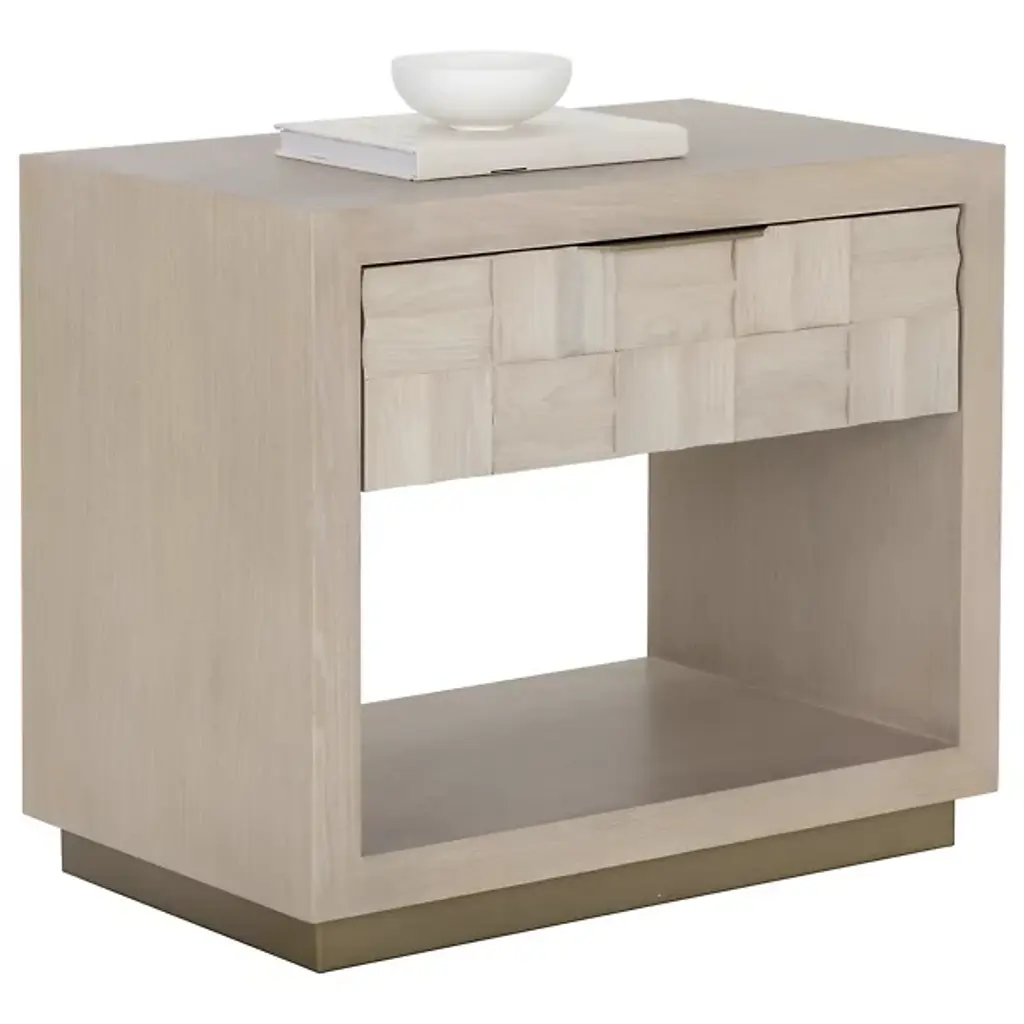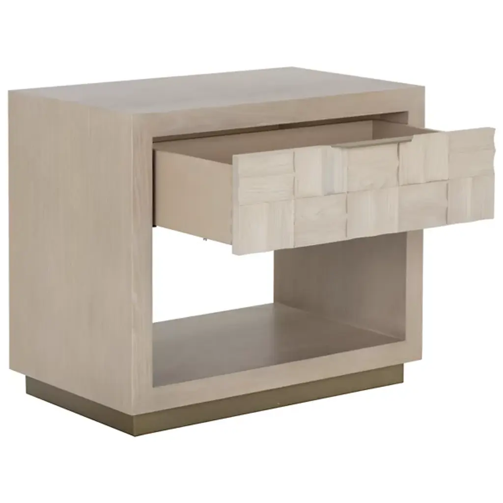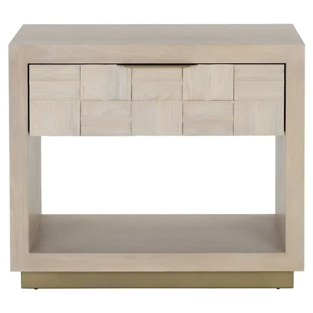 The Akava Nightstand from Sunpan adds a refined touch to any bedside. Its open, streamlined design is crafted from oak veneer, featuring a minimalist frame that creates modern elegance. Textured wood tiling on the front drawer introduces visual interest, while an aluminum handle and a steel base complete the sophisticated look. The natural variations in wood texture and color make each piece one-of-a-kind, perfectly capturing the essence of mid-century modern character.