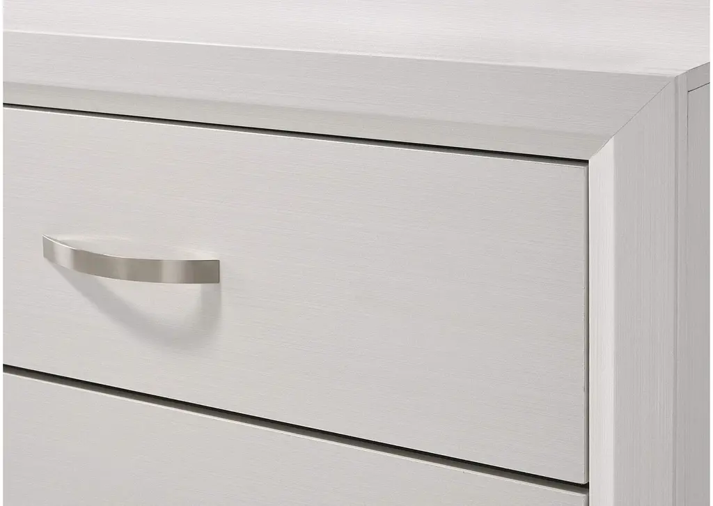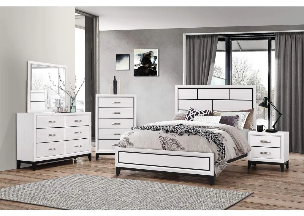 This contemporary bedroom set presents a crisp, clean look with its white finish and contrasting dark accents. The simple, straight lines and subtle details give it a modern edge. The bed features a paneled headboard that makes a statement without overwhelming the space. The accompanying pieces, including a six-drawer dresser, a five-drawer chest, and a two-drawer nightstand, provide ample storage with a streamlined silhouette. A matching mirror adds functionality and completes the look, creating a cohesive and stylish bedroom environment. This set is perfect for those who appreciate understated style and practical design. Weight 48.400 lbs. (21.78kgs.)