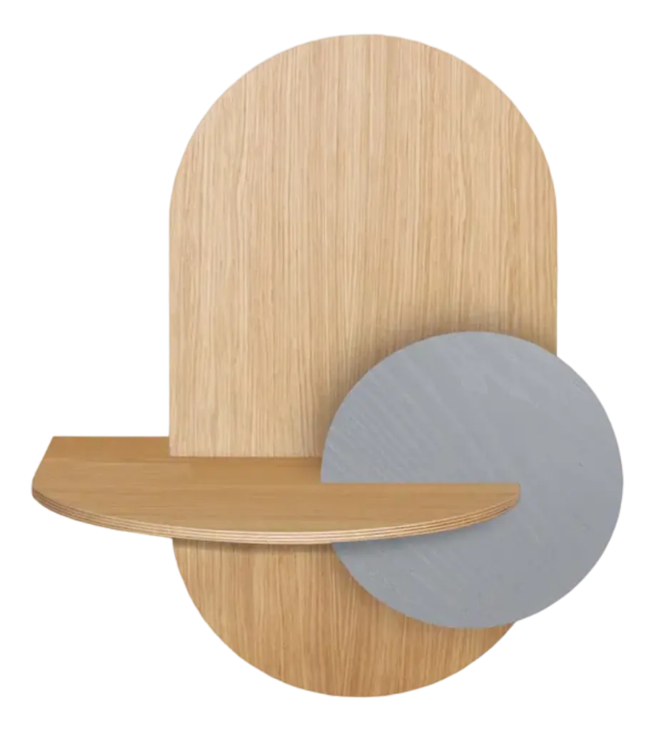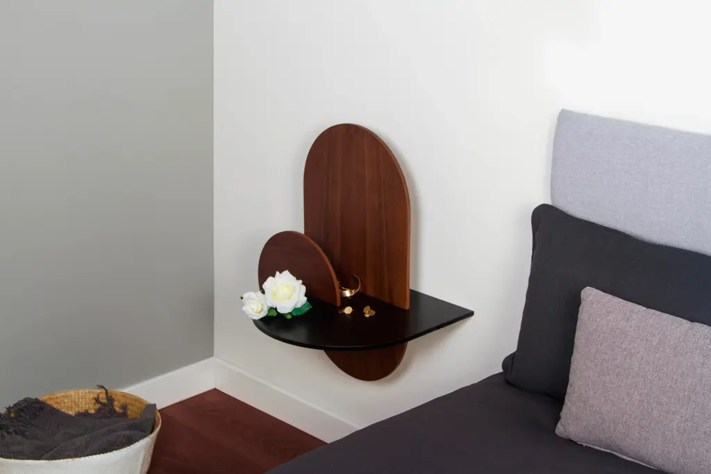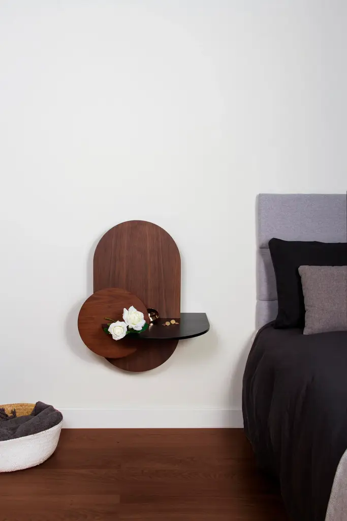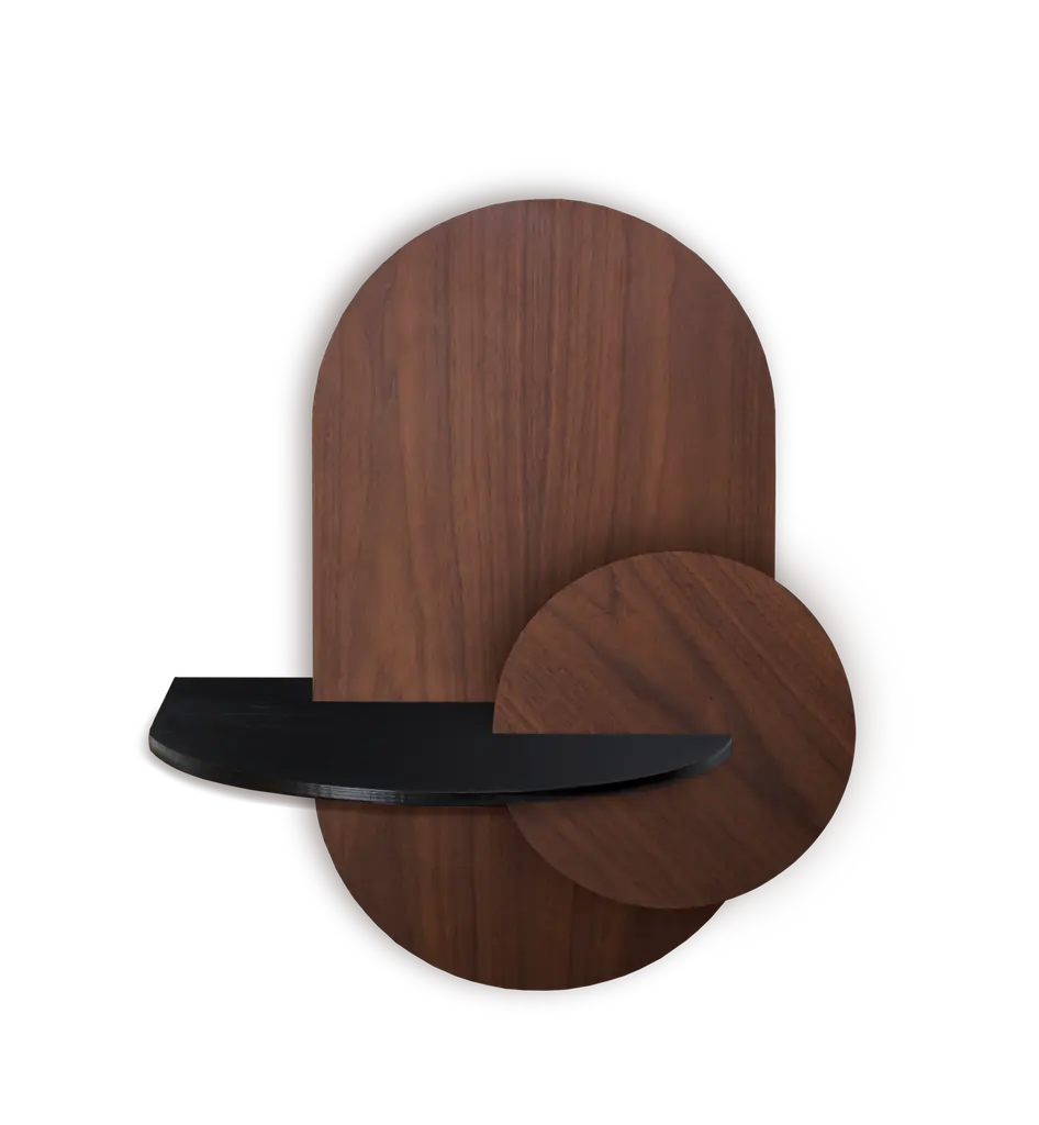 Alba is a versatile product that can be used as a wall shelf with hidden storage and as a bedside table with concealed storage. Alba means “sunrise” in Spanish, hence its name, since the two front pieces of the product simulate the sun and the moon reflecting in the water when a new day dawns. Alba is basically composed of 3 flat pieces of Plywood and a metal bracket that is fixed on the wall. The arrangement of these pieces in the space gives the product the ability to hide objects behind the vertical pieces since there is a separation between them. In the night table version (L), we have a backspace, behind the bottom piece, which allows us to hide larger objects such as books, tablets, etc. Also, there is a hidden hole in the base that allows us to feed the cable to charge our devices. It weighs 7 kg. There is 2 color combination you can choose from: - Walnut back panel, Black table cover, Walnut Circle front panel - Walnut back panel, Grey table cover, Black Circle front panel