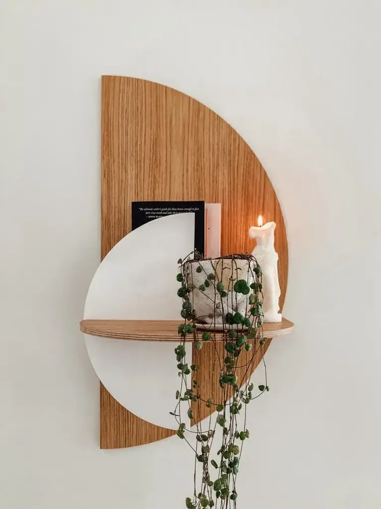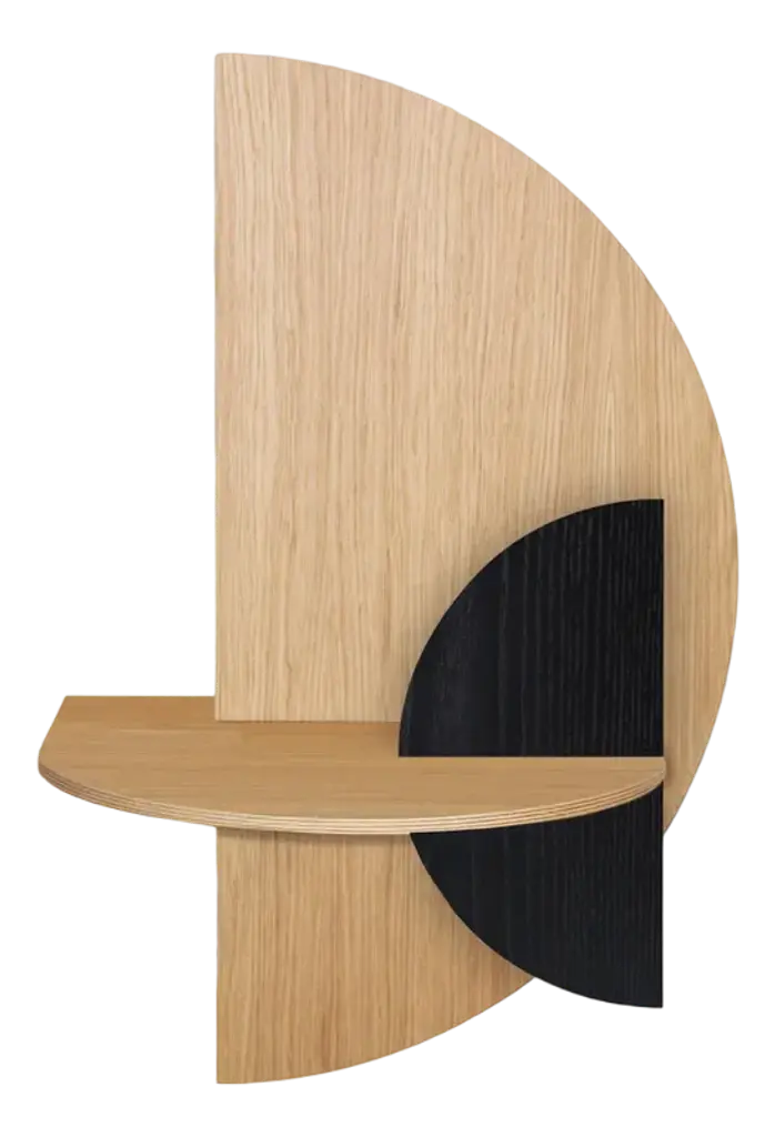 A versatile narrow bedside table with concealed storage. Alba means “sunrise” in Spanish, hence its name, since the two front pieces of the product simulate the sun and the moon reflecting in the water when a new day dawns. Composed of 3 flat pieces of Plywood and a metal bracket that is fixed on the wall. The arrangement of these pieces in the space gives the product the ability to hide objects behind the vertical pieces, since there is a separation between them. In the night table version (L), we have a back space, behind the bottom piece, which allows us to hide larger objects such as books, tablets, etc.