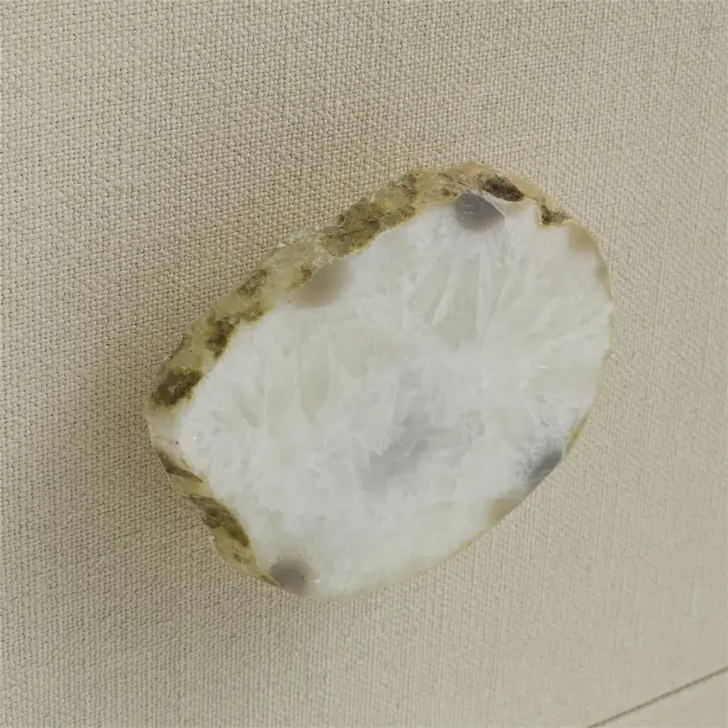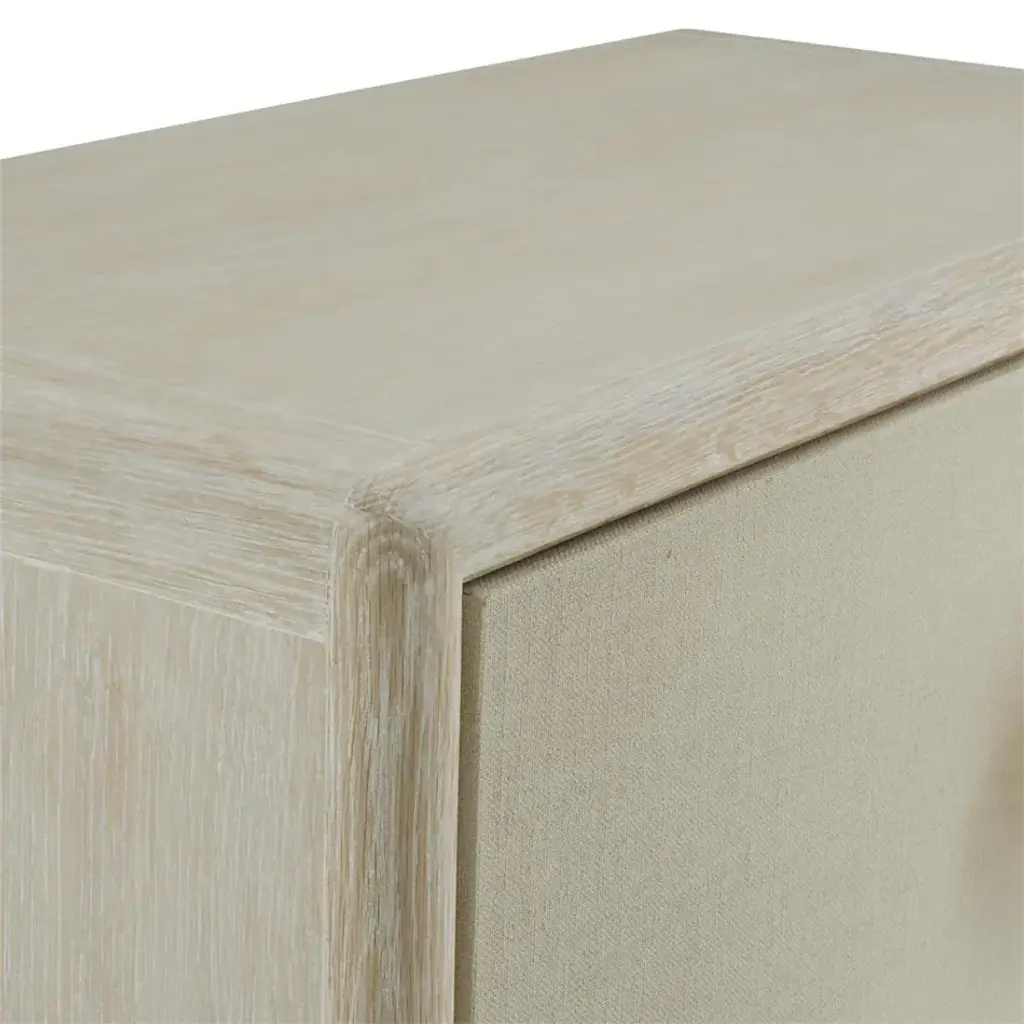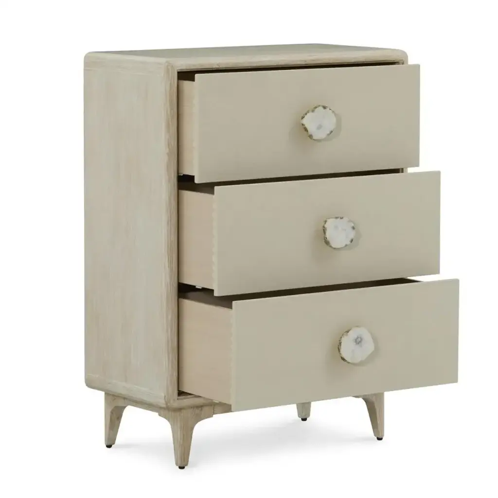 The Alba Nightstand showcases a classic, distinguished look that lends an enchanting sense of gravitas to an interior space. Crafted from oak wood in a white washed finish, the piece features three drawers adorned in linen fabric with handles of white agate. With smoothed edges, slender wooden legs, and a delicate ivory hue, the piece possesses a subdued look and feel that translates beautifully to a variety of design styles.