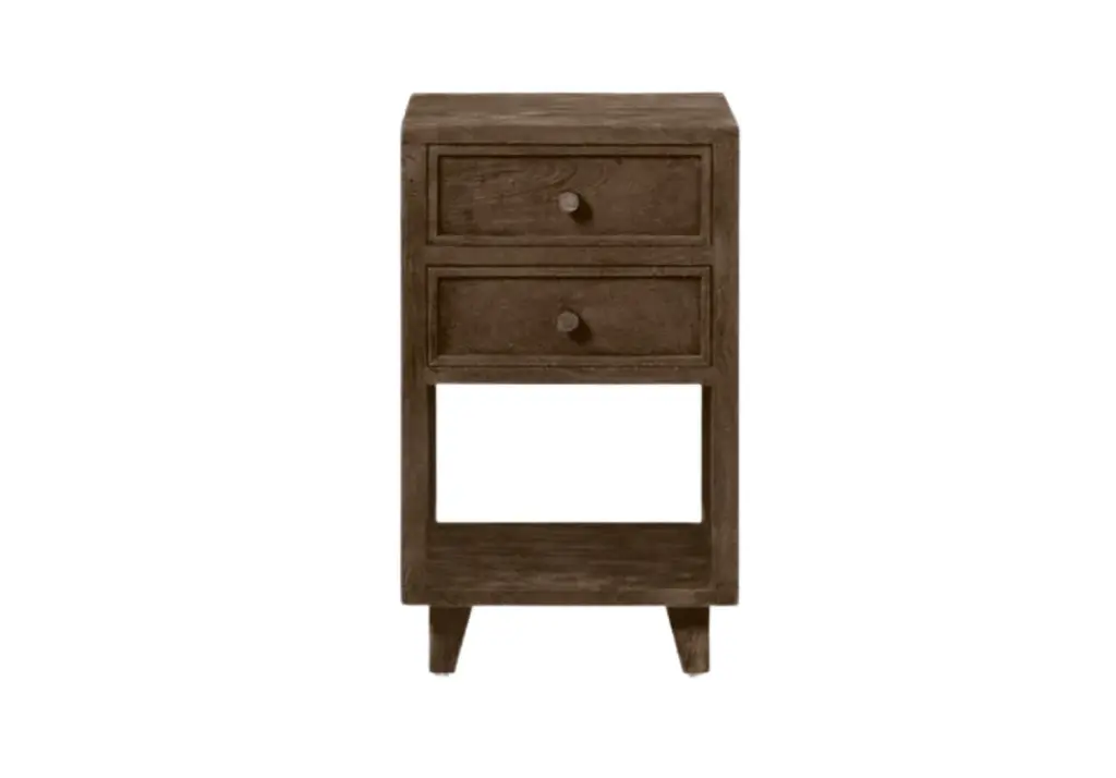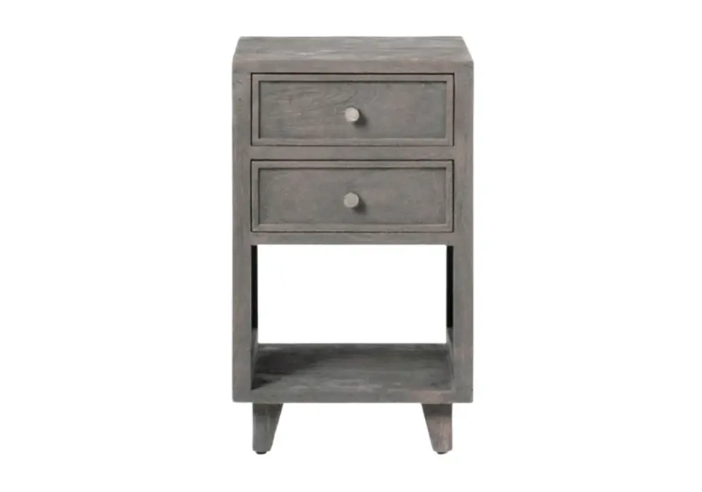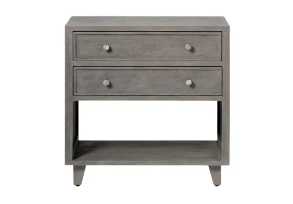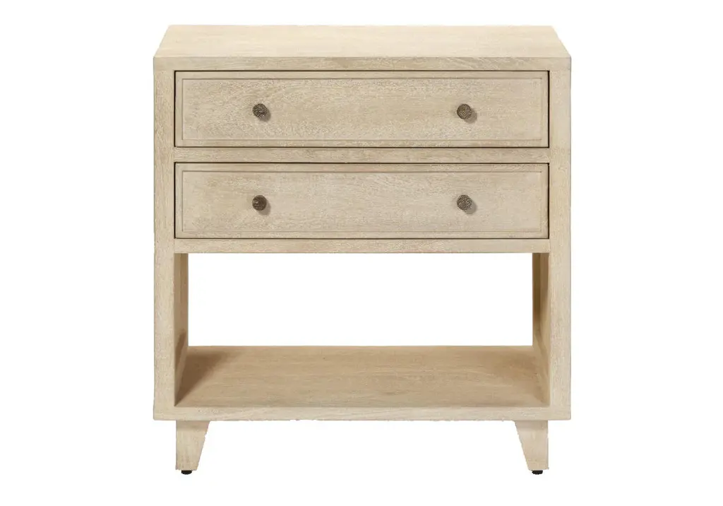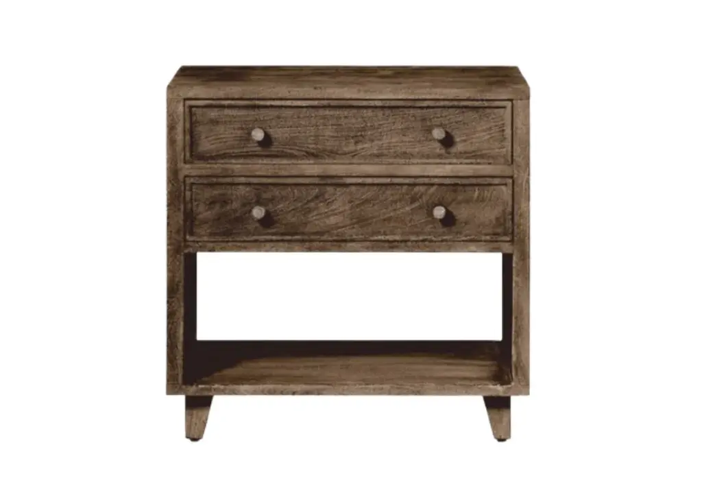 This nightstand boasts a durable mango wood form in three beautiful finishes, easily highlighting its natural texture and grains. Its two-drawer design is complemented by an airy, open bottom shelf, providing ample hidden and visible storage. Matching rounded pulls and slightly tapered legs elevate its tasteful style.
