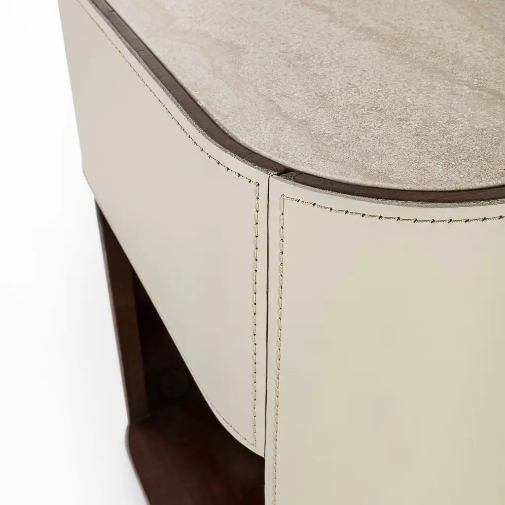 Prized materials daringly juxtaposed to a clean yet sinuous contemporary aesthetic define this luxurious nightstand. Its inebriating sartorial allure is owed to the generous beige leather cover with contrast stitching. The warm Canaletto walnut inner unit and matte-finished Travertine marble top seal the piece's visually dynamic aesthetic. Equipped with a soft-close drawer, the nightstand can be widely customized upon request to the Concierge.