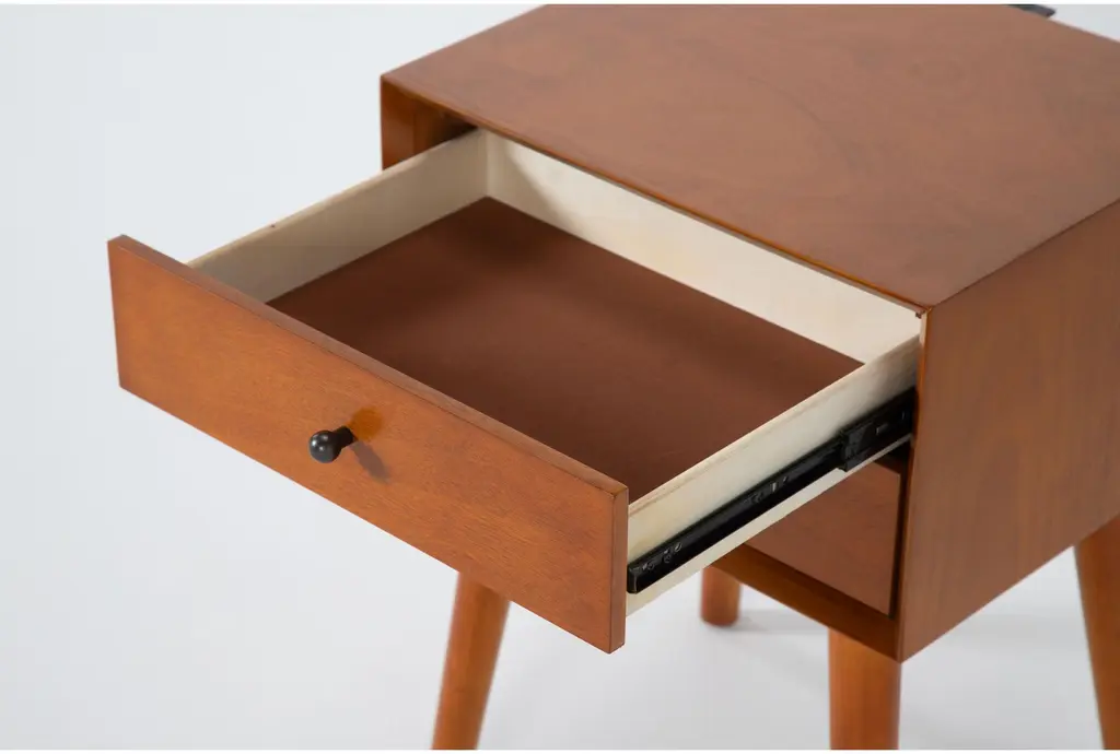 The Alton Cherry II Brown Wood 2-Drawer Night Table Set Of 2 combines mid-century modern style with functional storage solutions. These night tables, crafted with okoume veneers and solid rubberwood, offer ample storage space with their two drawers. The rich cherry color and tapered legs add a touch of retro charm, making them a perfect addition to any bedroom.