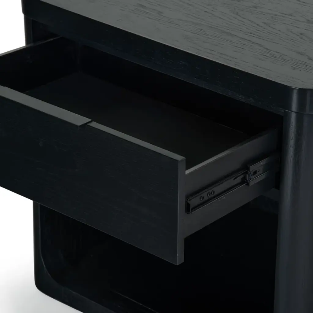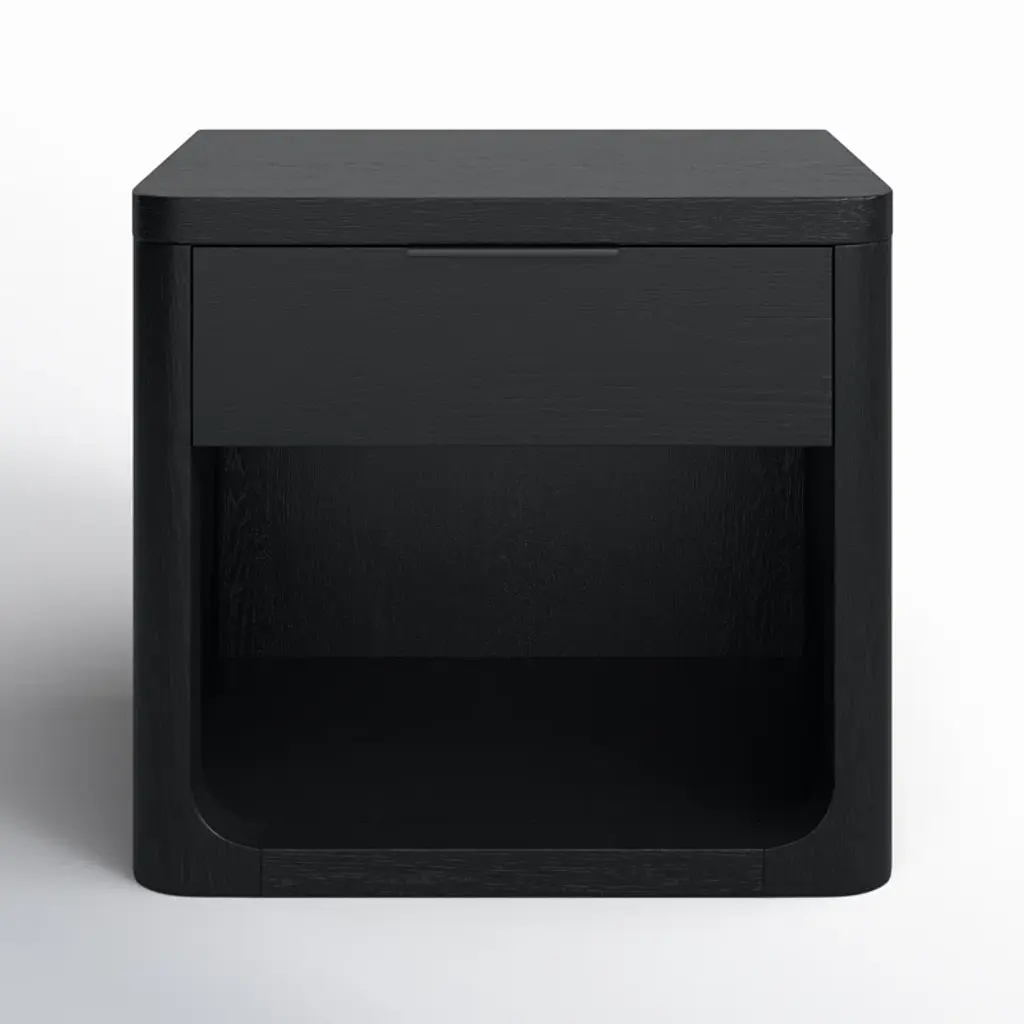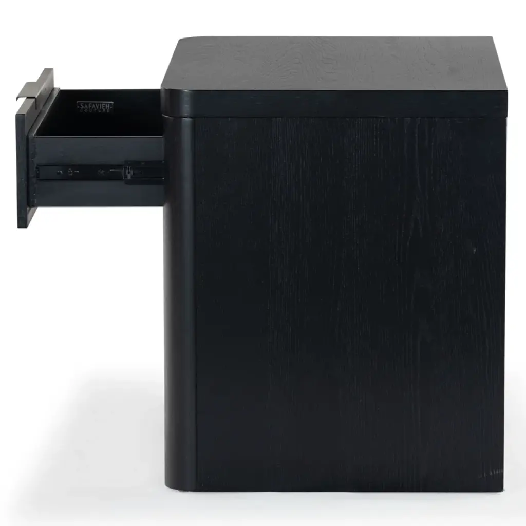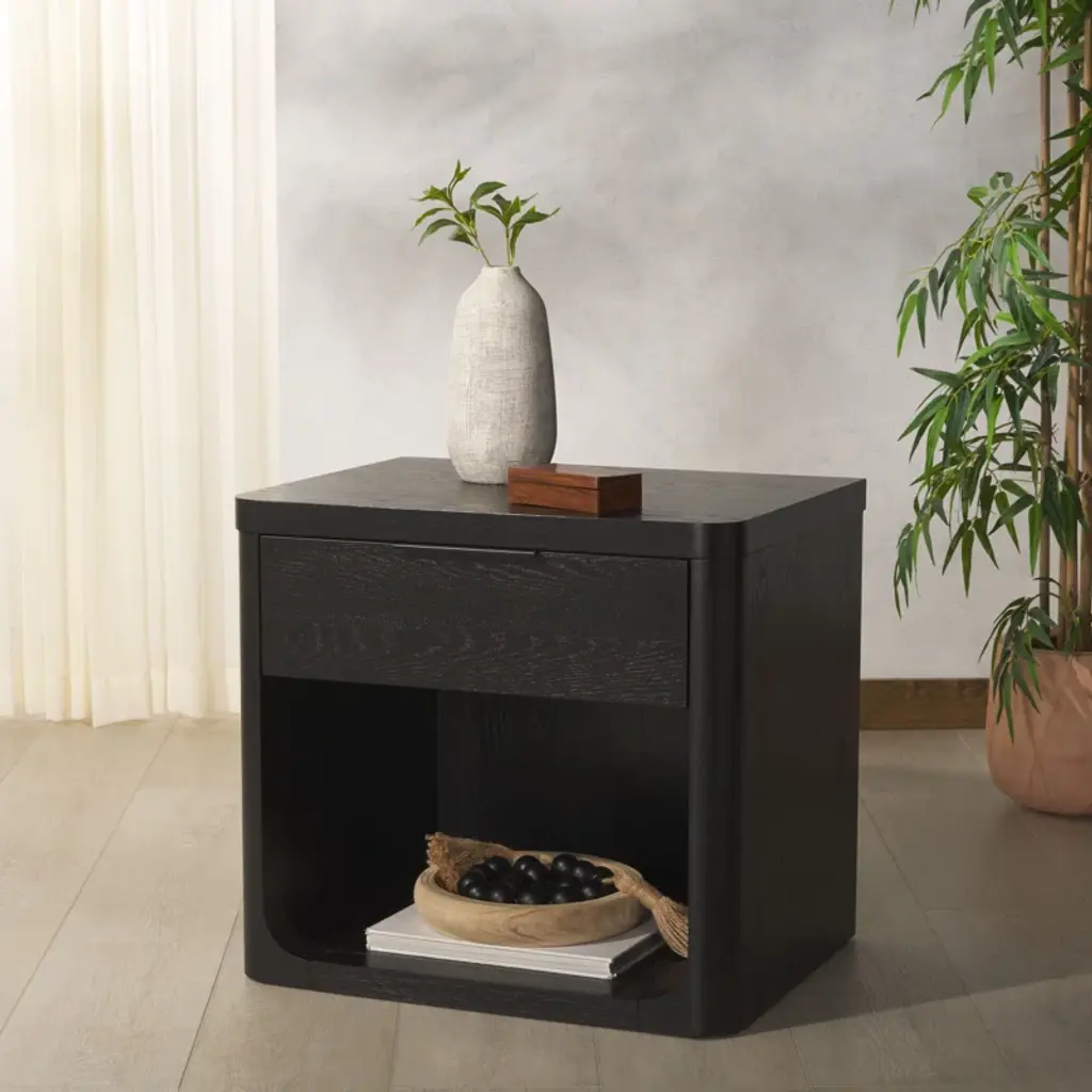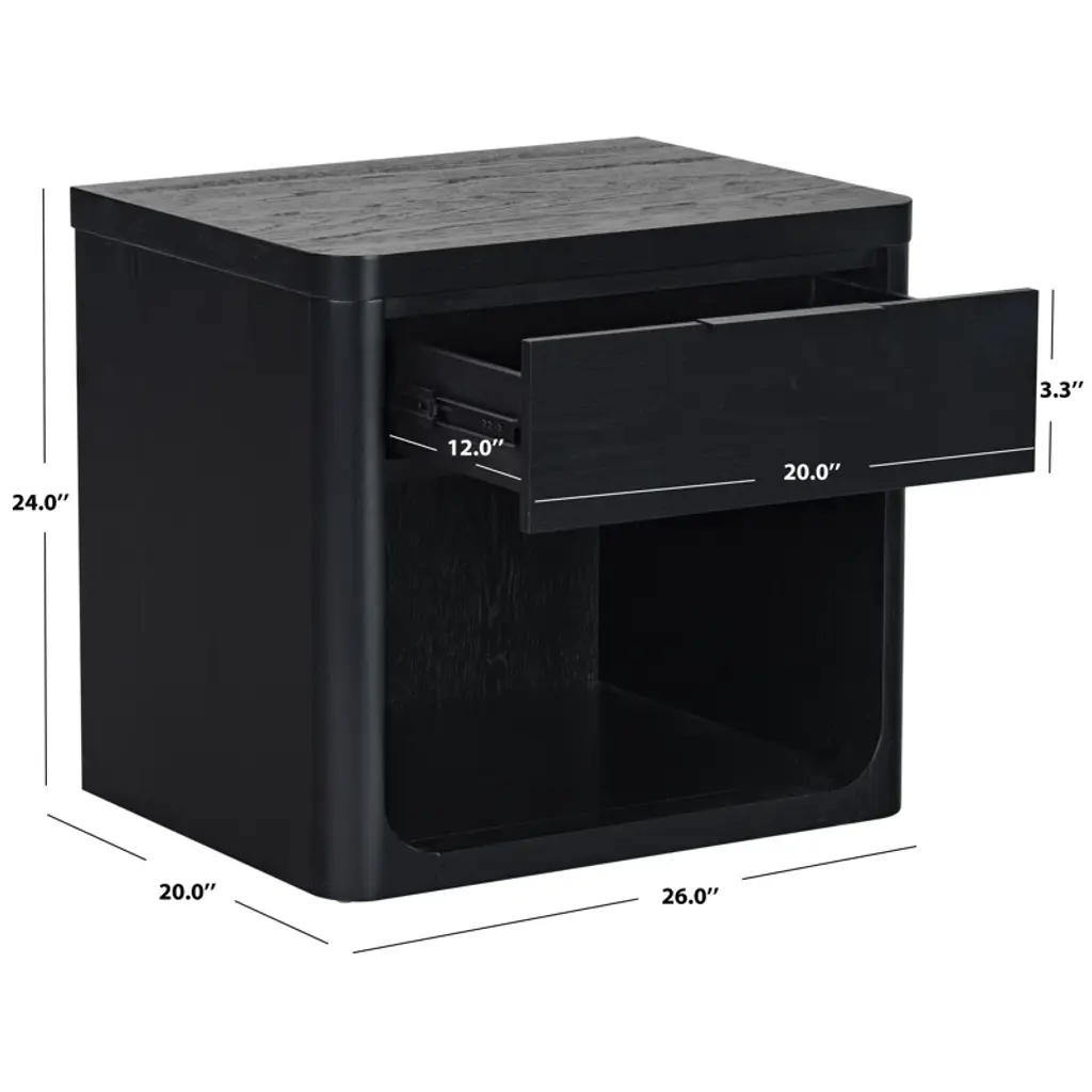 Introducing the RAYLIE 1-Drawer Wood Nightstand, an epitome of contemporary elegance finished in bold black. Crafted from robust rubberwood and a tasteful oak veneer, this sleek piece adds just the right touch of glamour and functionality to your bedroom. Featuring a generously sized drawer and supported by sturdy iron, this piece is perfect for convenient bedside storage. The black perfect finish contrasts seamlessly with any bedroom color palette, offering a stylish yet subtle enhancement to your space. Stay organized and polished with the RAYLIE 1 Drawer Wood Nightstand. Experience elegance that doesn't compromise utility.
