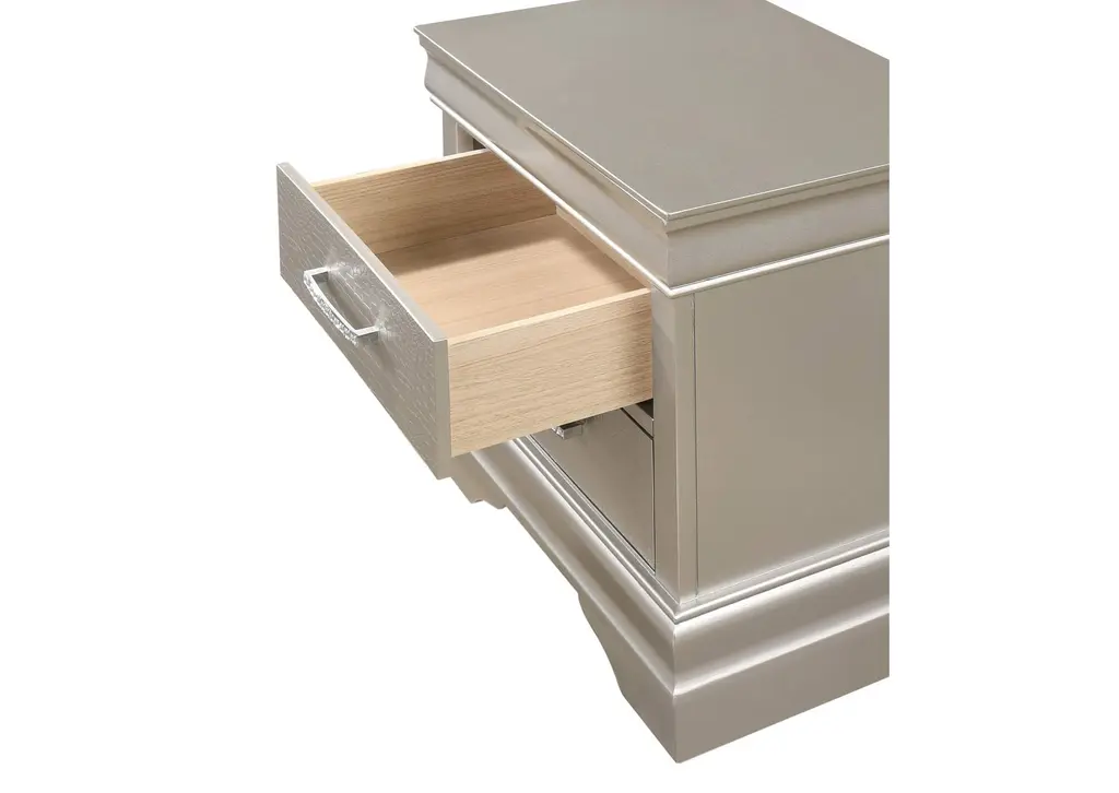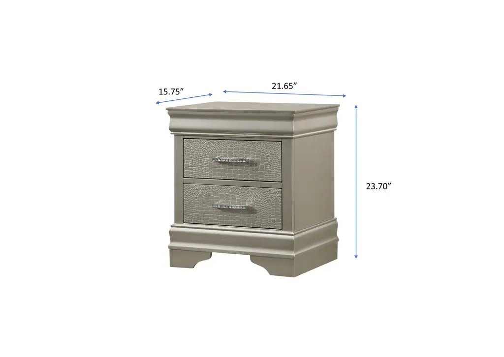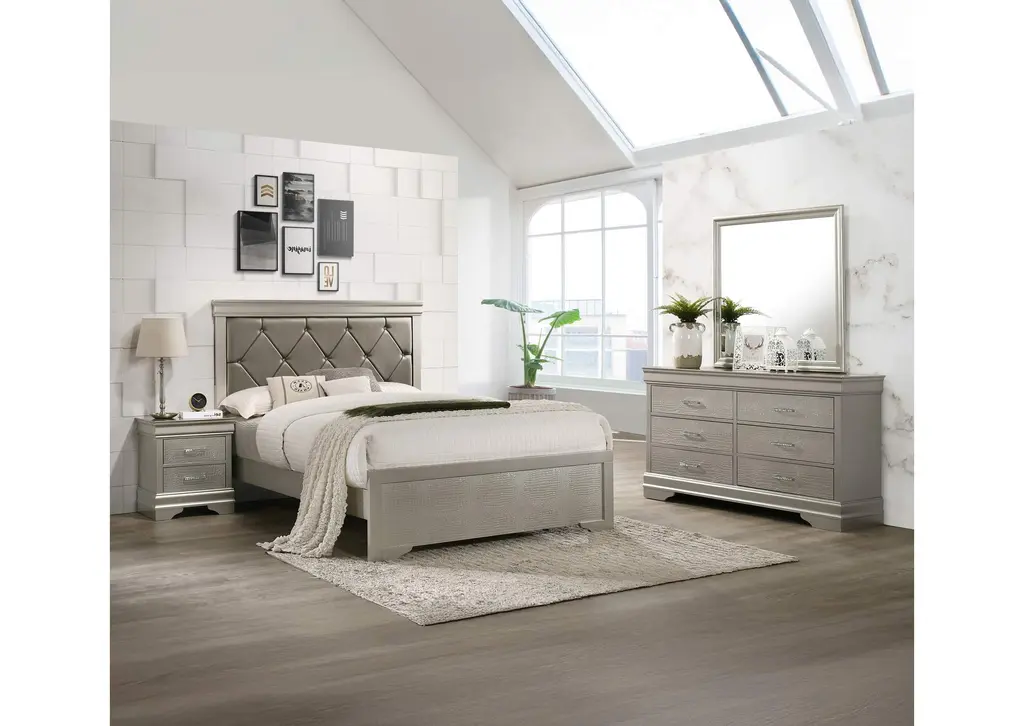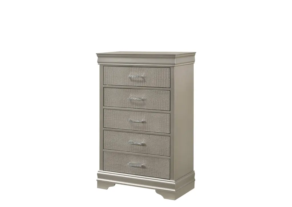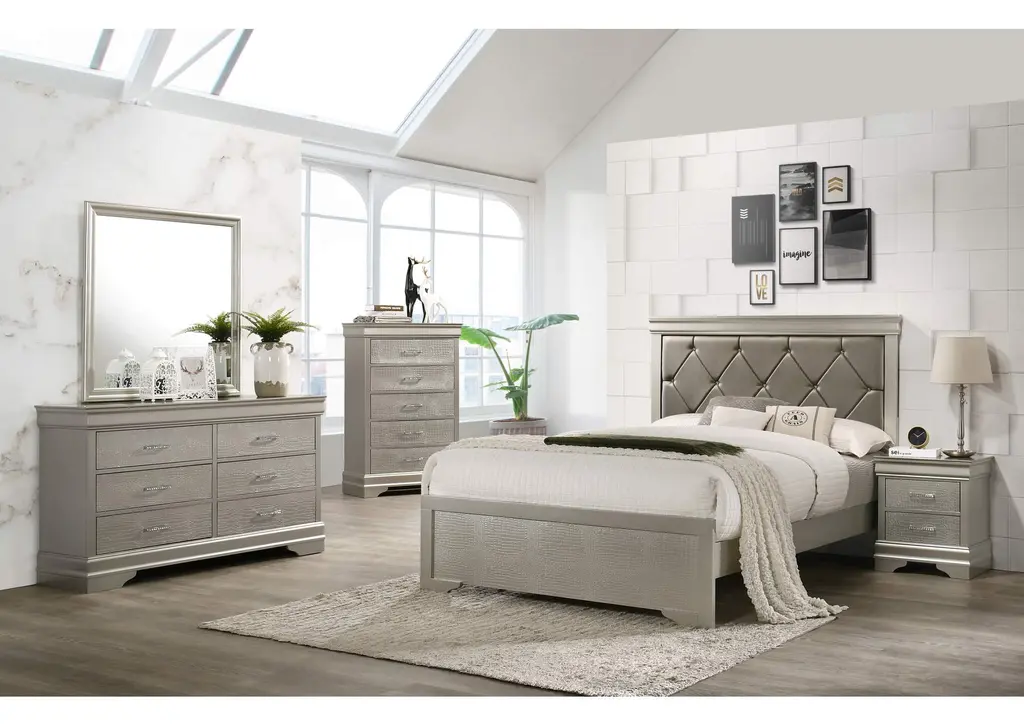 This bedroom set embodies a refined elegance with its soft silver hue and luxurious textures, perfect for creating a serene and sophisticated sanctuary. The centerpiece is a sumptuous bed framed by a headboard with diamond-tufted detailing, offering a touch of opulence. The accompanying pieces, including a dresser with a gracefully matching mirror, tall chest, and nightstand, all feature a textured finish that adds depth and character to the suite. Weight 37.700 lbs. (16.97kgs.)