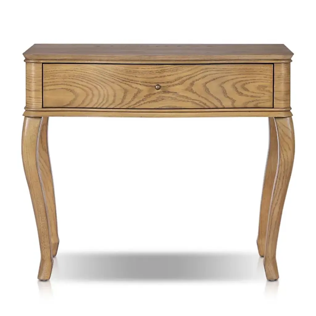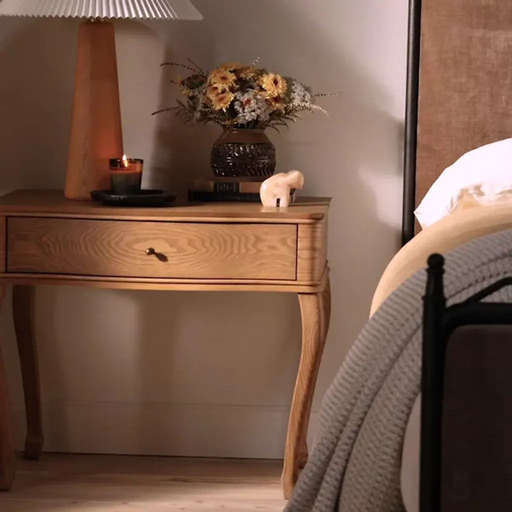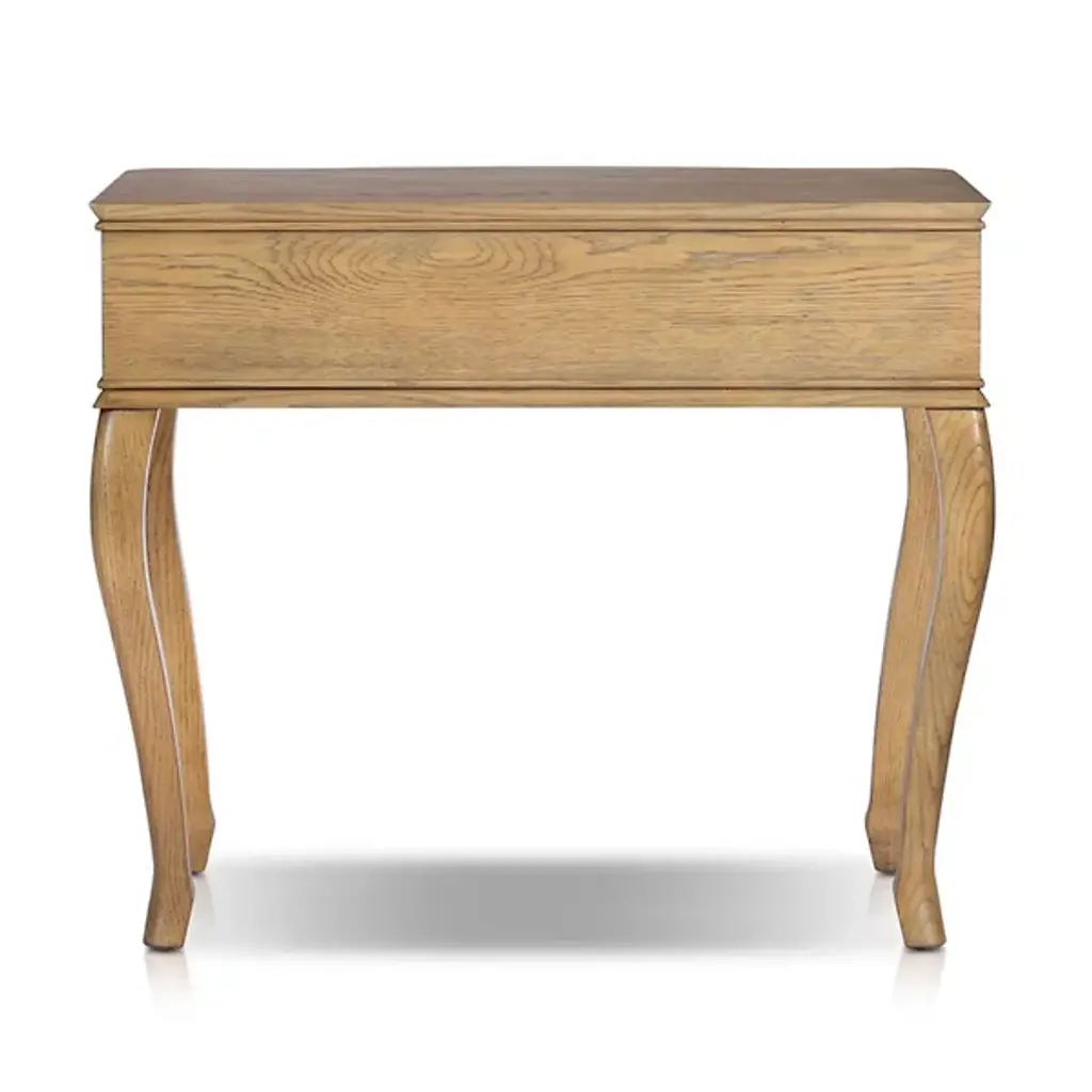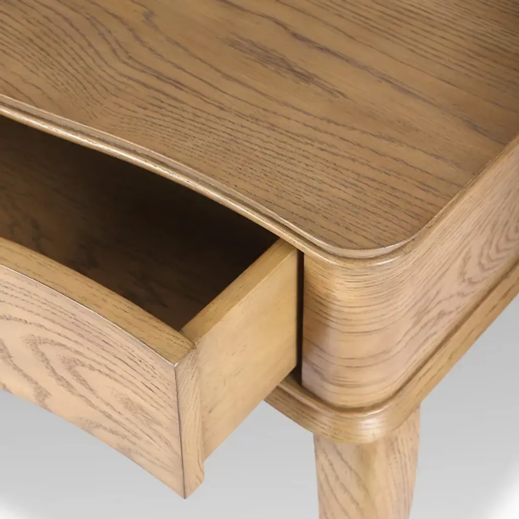 The Amber Lewis x Four Hands Harry Nightstand updates traditional cabriole legs with a streamlined approach that maintains historical references while feeling utterly current. Delicate beading around the perimeter introduces shadow lines that emphasize craftsmanship and quality construction. The oak's natural grain variations provide organic patterning that enhances the nightstand's presence. A single brass button knob offers just enough metallic contrast without competing with the wood's natural beauty. This bedside essential balances graceful curves with practical storage considerations.