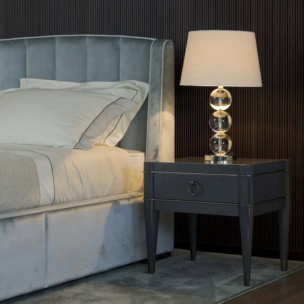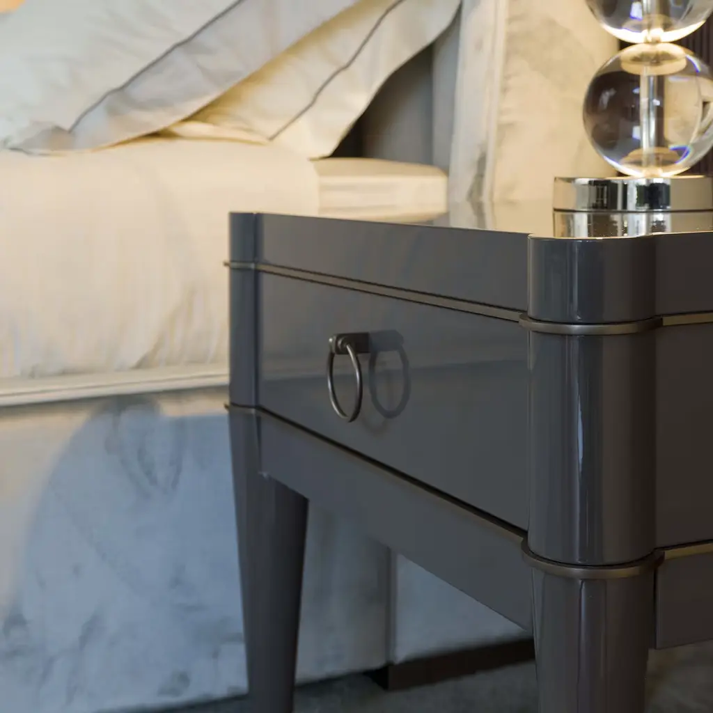 A charming addition to a bed frame, this nightstand is an exquisite presence in a classic home, thanks to its expert craftsmanship, high quality materials, and stunning details. The solid wood structure of this piece is adorned at the feet, around the perimeter, and in the handle of the front drawer with metal with a bronze finish. The top and front boast a lacquered finish, while the drawer, equipped with Bluemotion guides, has a back lined in faux-leather. The metal inserts are also available in satin-finished brass.