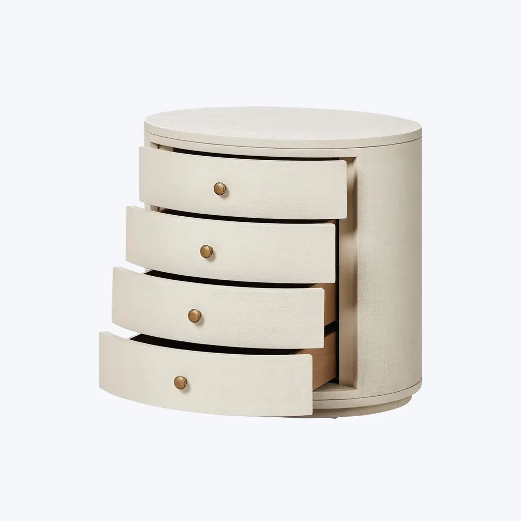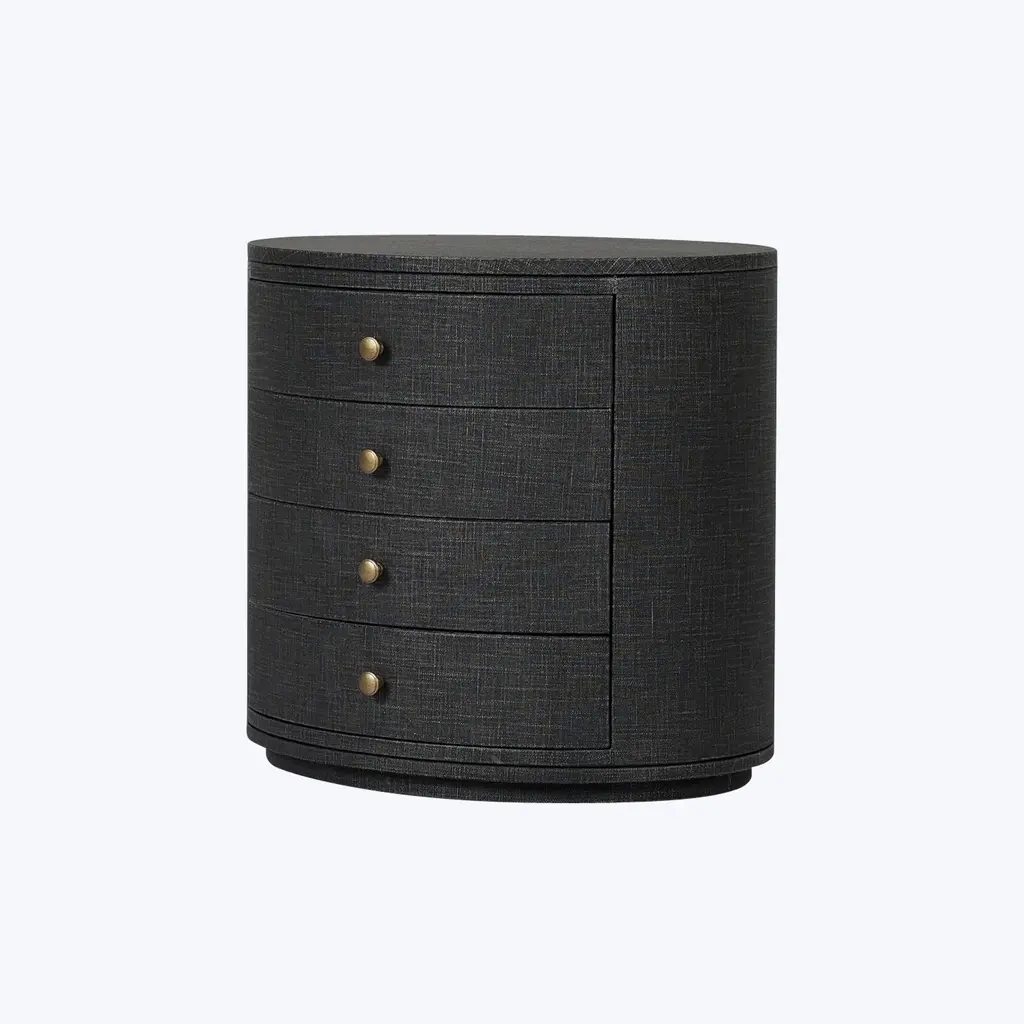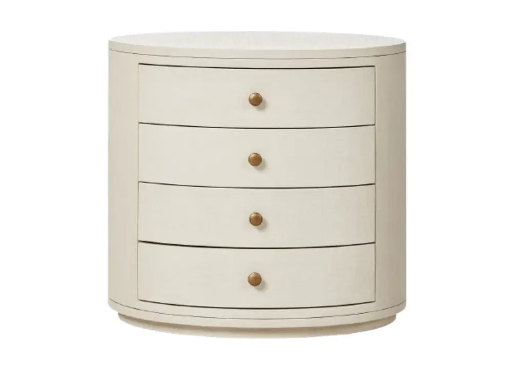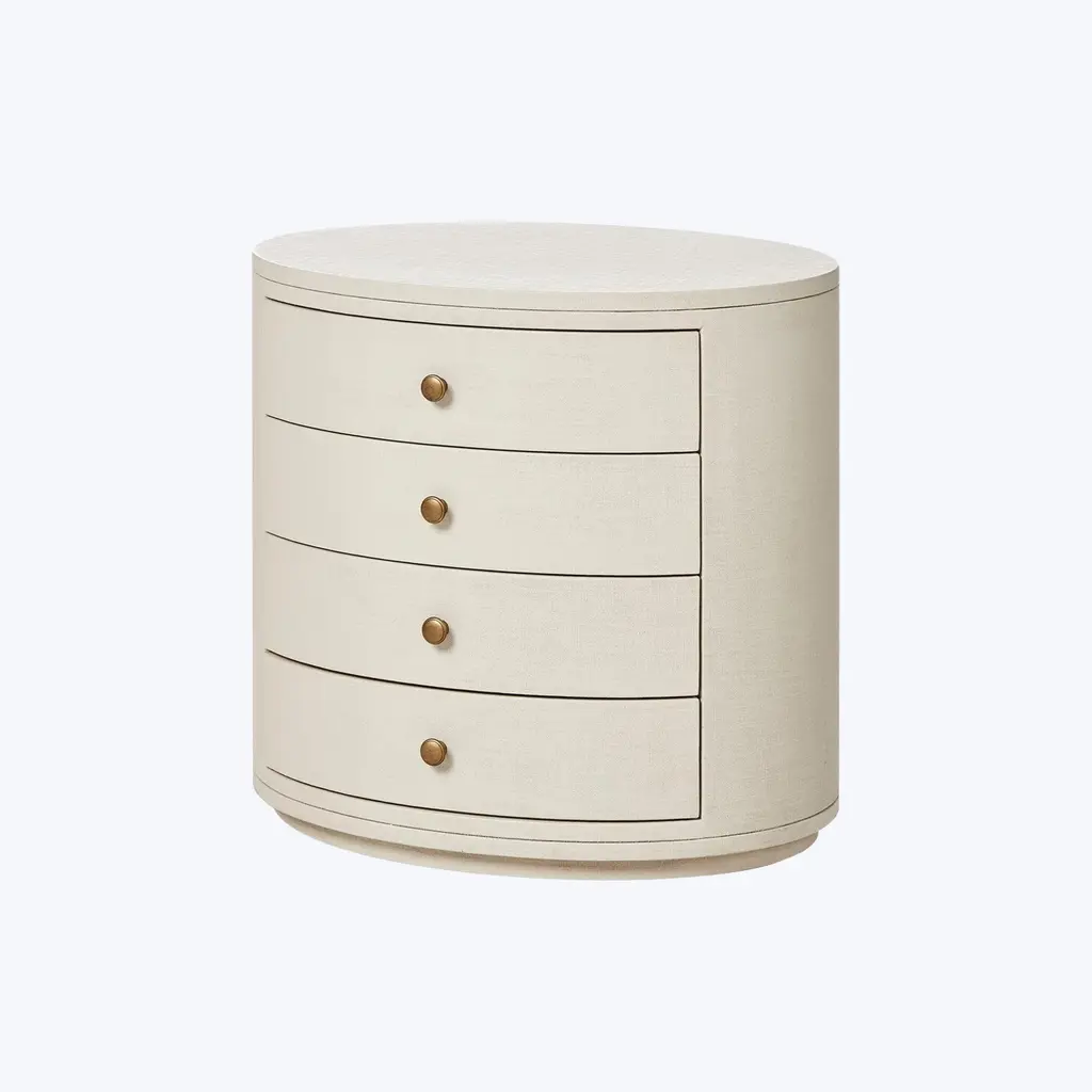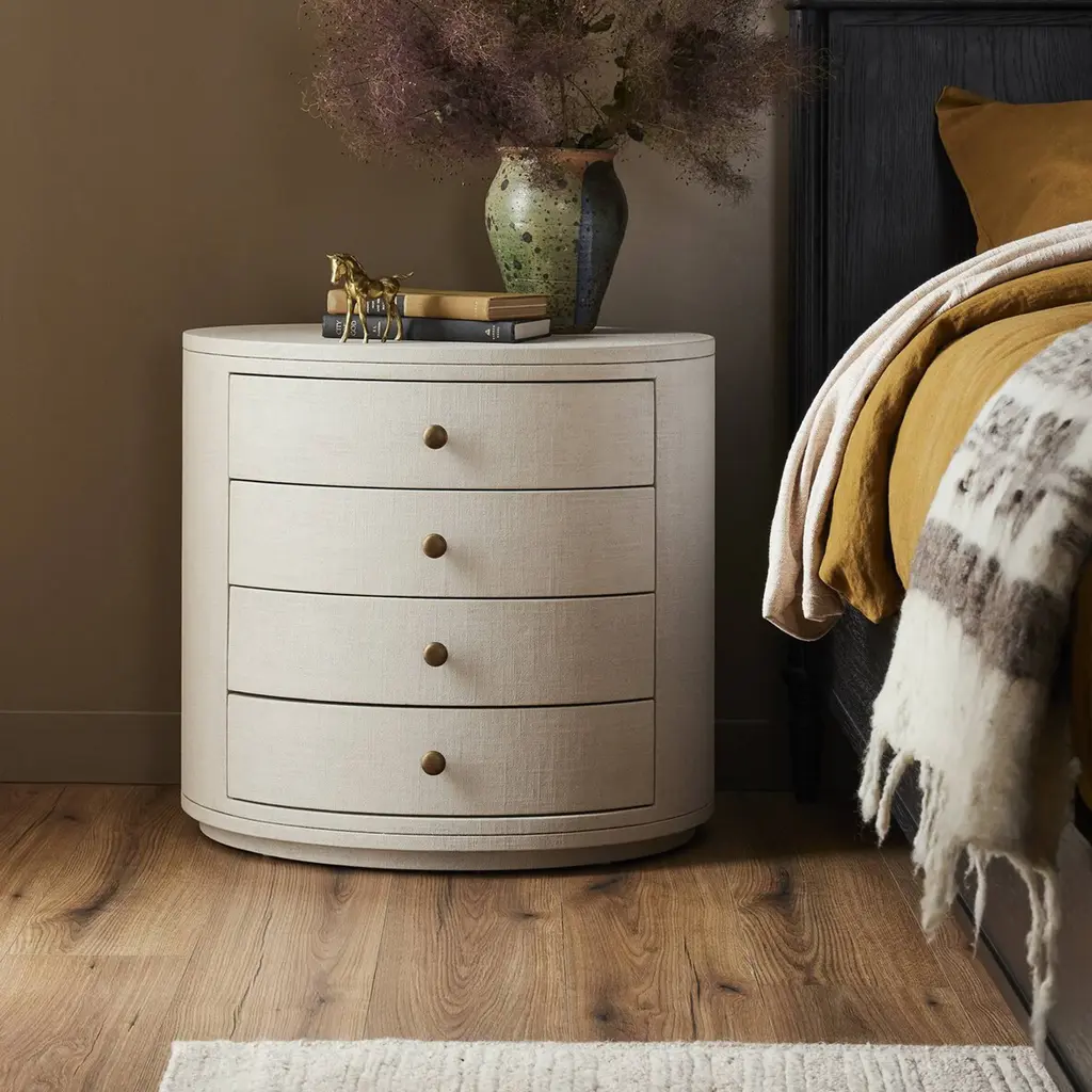 Elevate your sleep space with the elegant curves of Four Hands's Amelia Oval Nightstand. Crafted in painted linen, this refined bedside table is designed with four drawers, offering generous storage. Choose from light and dark hues.