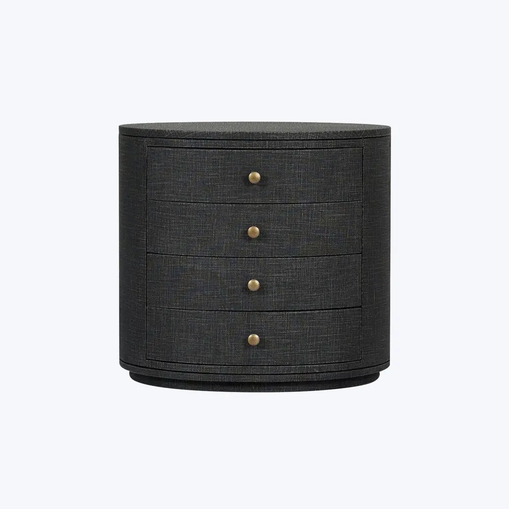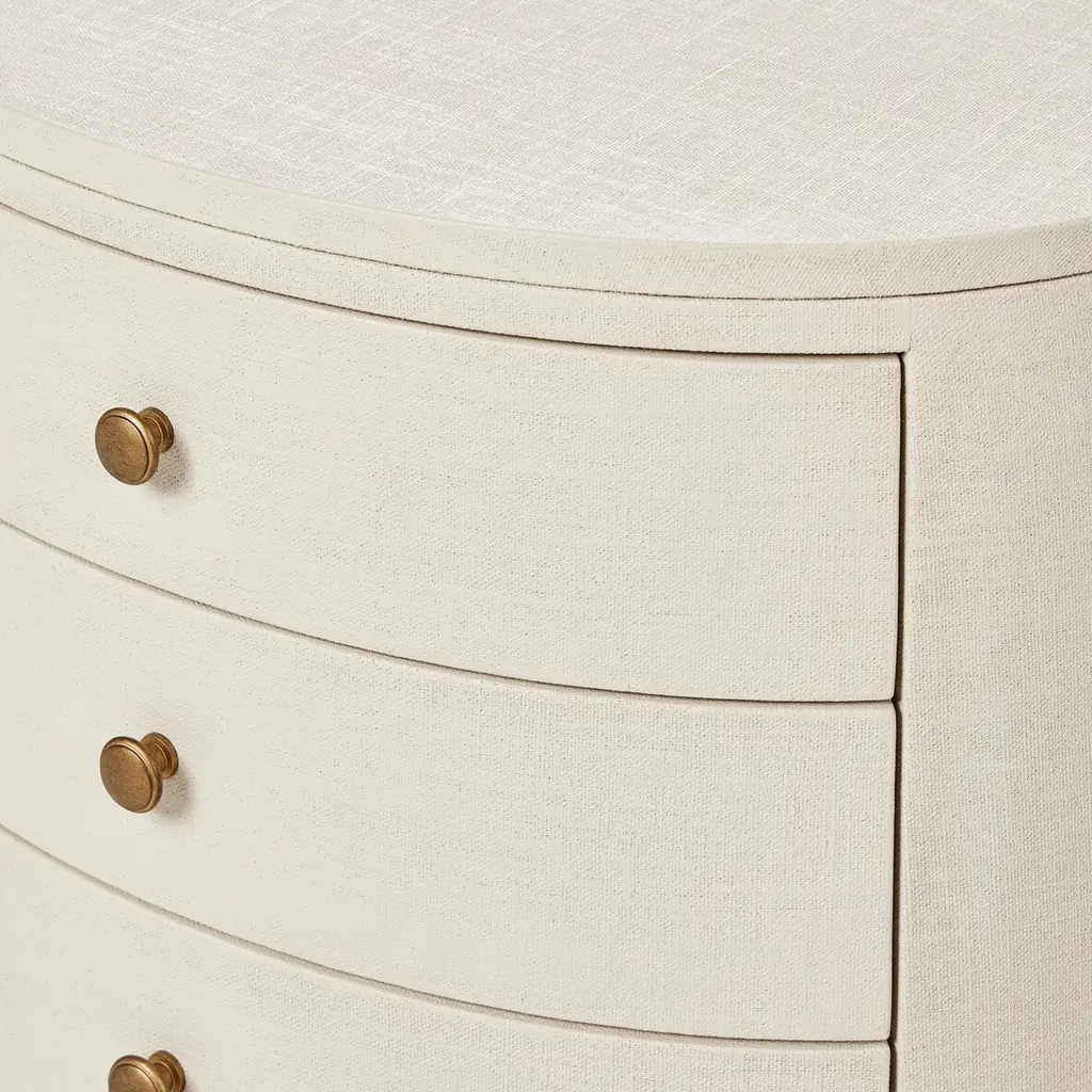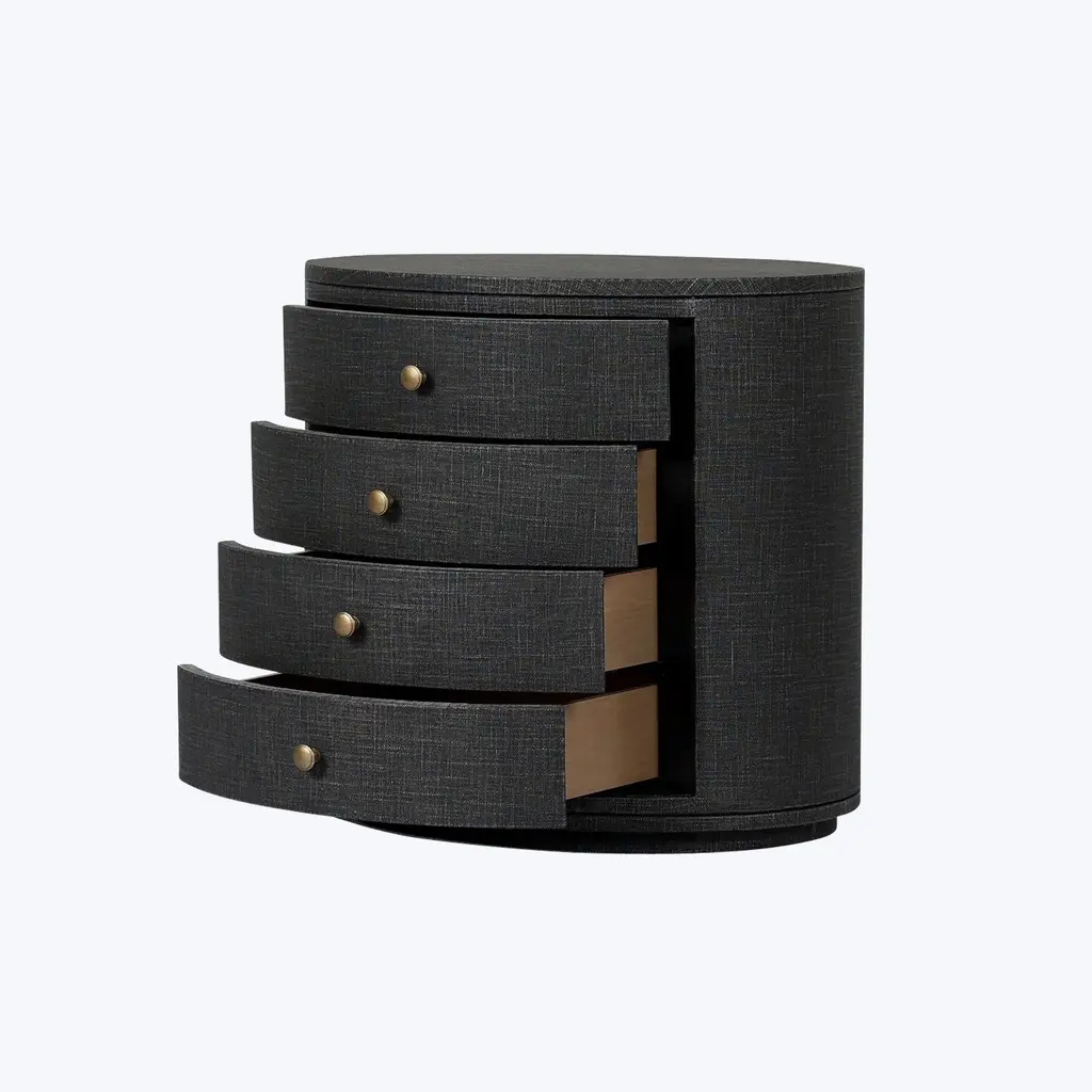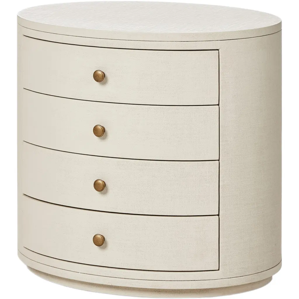Elevate your sleep space with the elegant curves of Four Hands's Amelia Oval Nightstand. Crafted in painted linen, this refined bedside table is designed with four drawers, offering generous storage. Choose from light and dark hues.