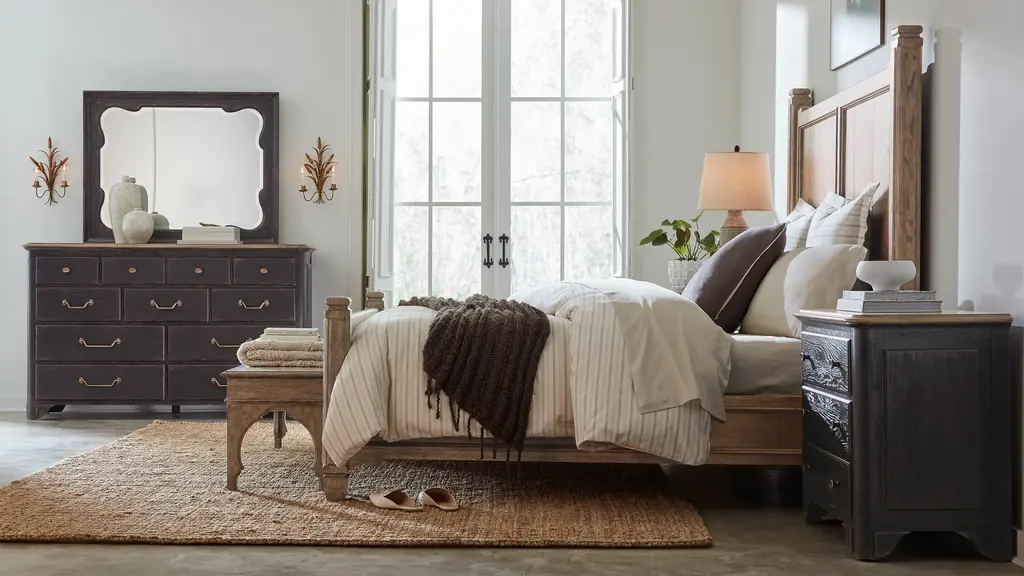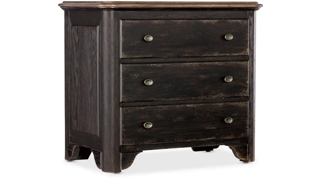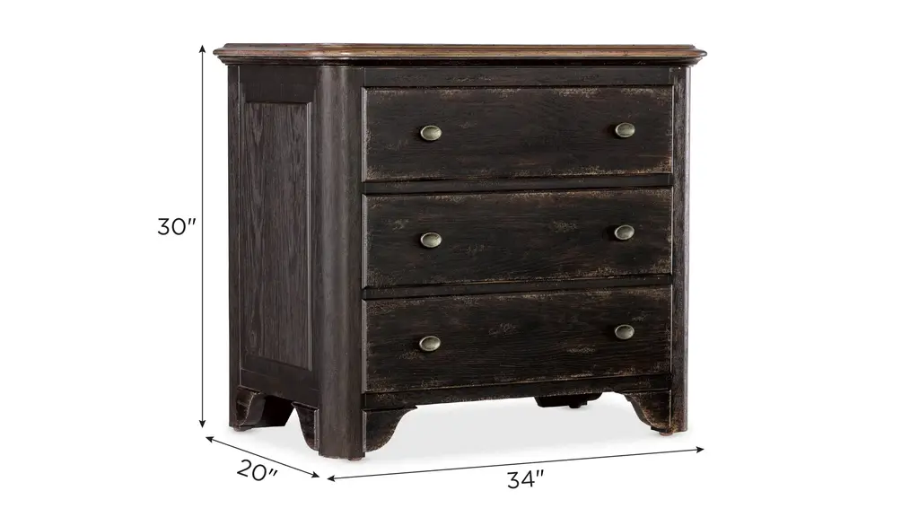 In a two-tone finish with the deep, dark molasses on the base and the warm honey on the top and drawer interiors, the Americana Three-Drawer Nightstand is a classic, charming design with nostalgic flair. There are 3 self-closing drawers and a solid-wood edge top. Crafted of oak veneers with metal alloy pulls in an antique bronze finish.
