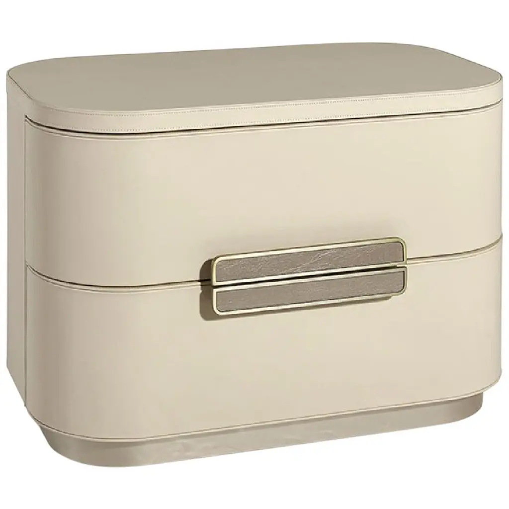 A luxe addition to sophisticated modern bedrooms, this nightstand is a triumph of soft curves and tailored craftsmanship. The structure is fully upholstered with top-rate beige leather, creating a prized and luminous canvas for the two handles featuring jewel-like glass inserts and contours finished with a distressed metallic paint, just like the plinth base. A wonderful gift for a loved one on special occasions.