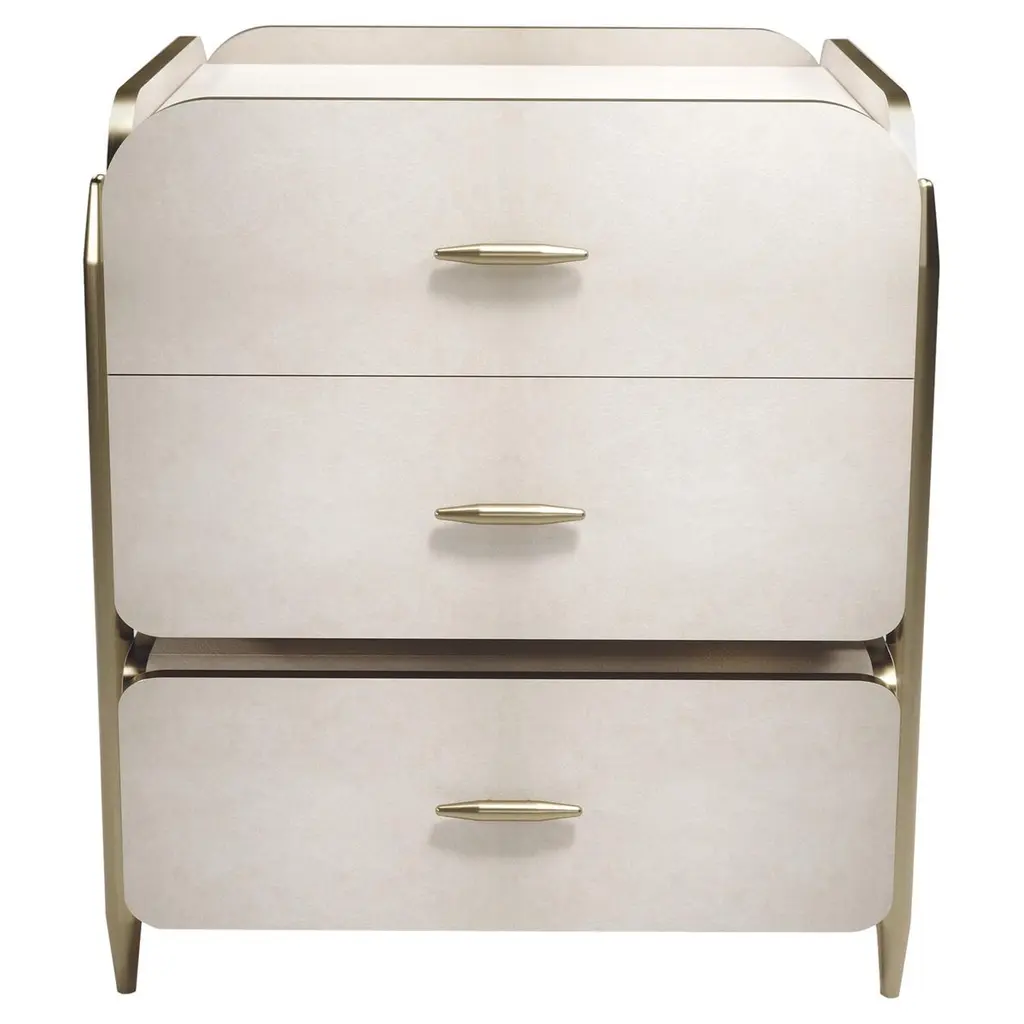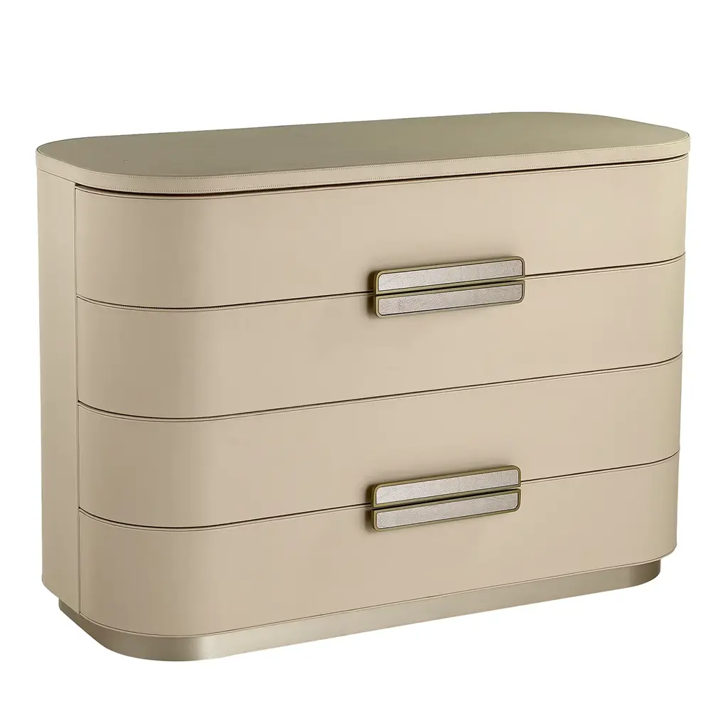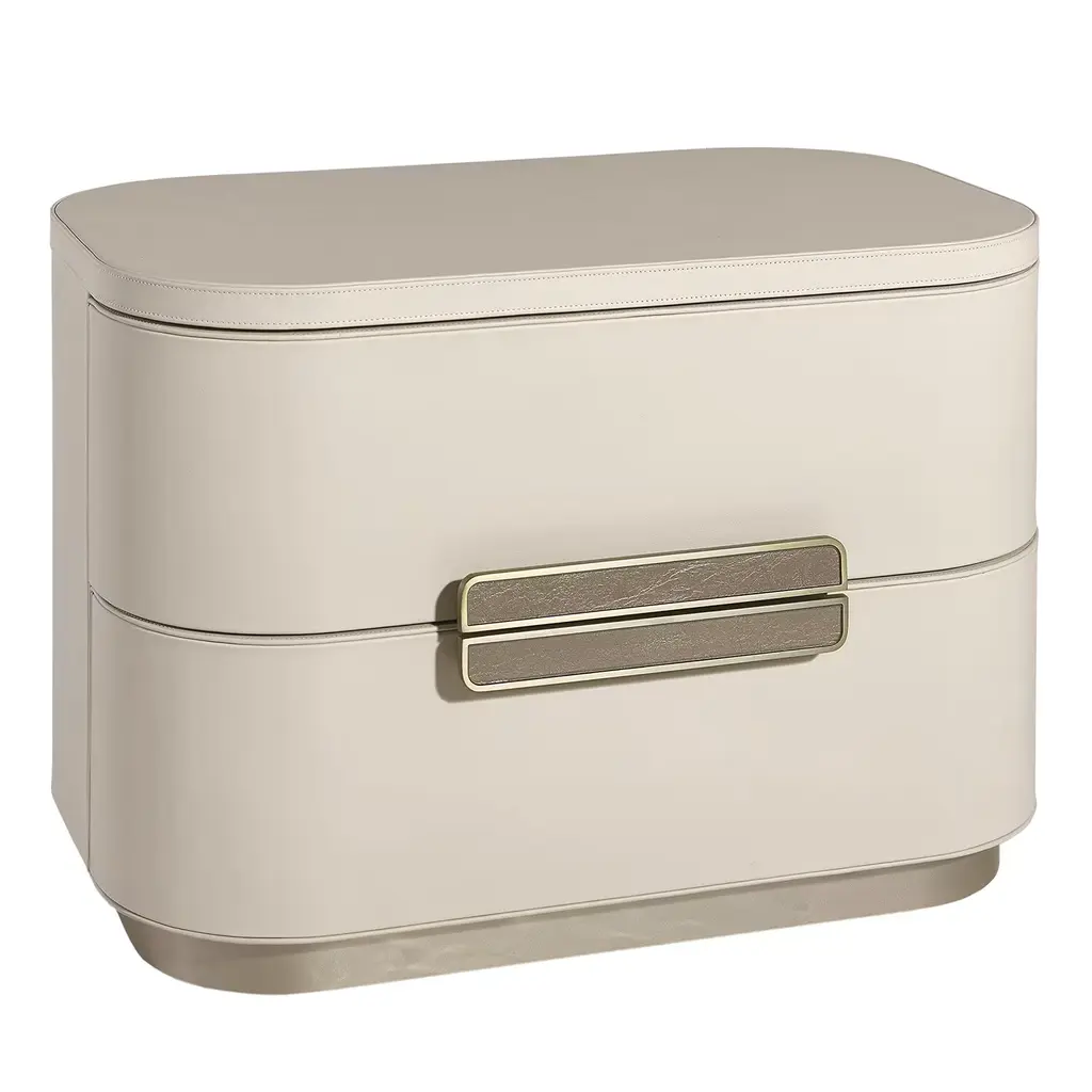 Amidele is a nightstand with upholstery in nubuck or leather. Metal handle with foam glass insert. Base with coated lacquered finish.