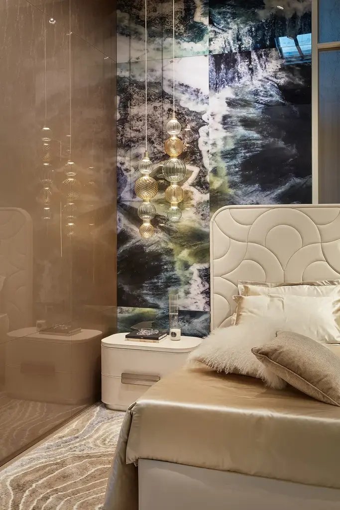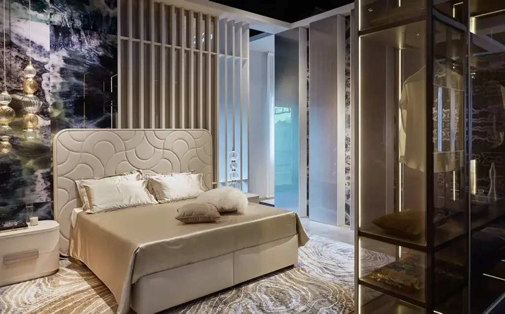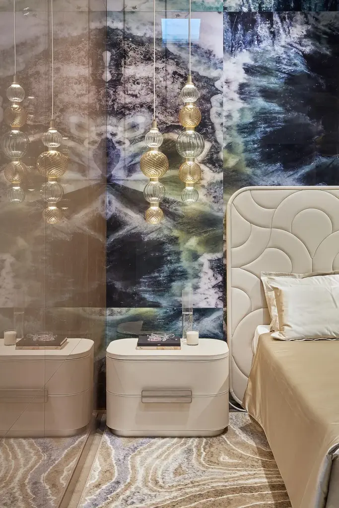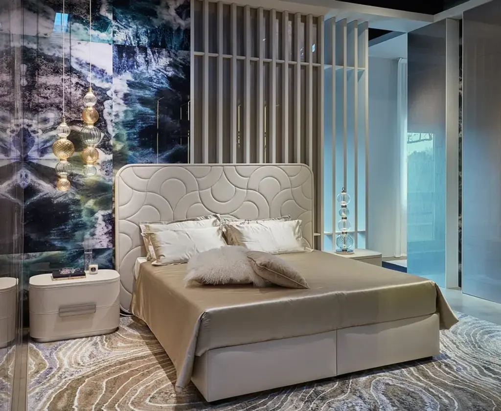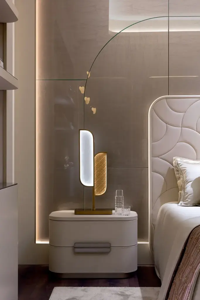 Amidele is a nightstand with upholstery in nubuck or leather. Metal handle with foam glass insert. Base with coated lacquered finish.