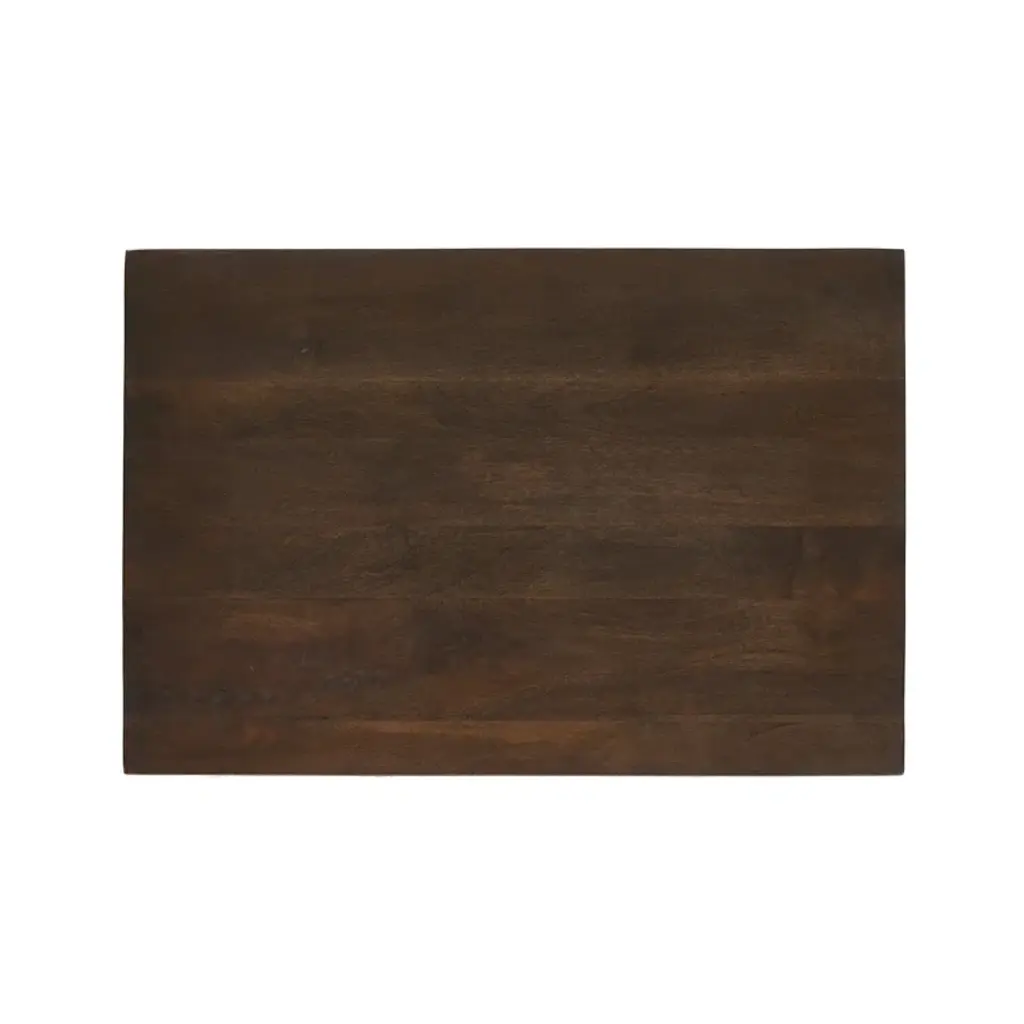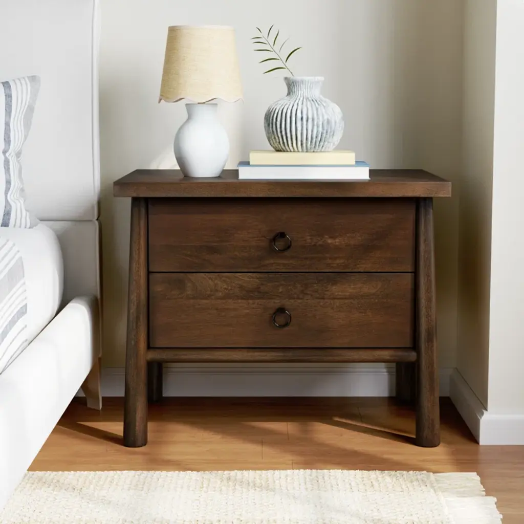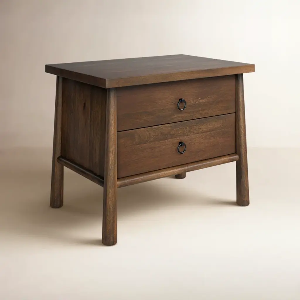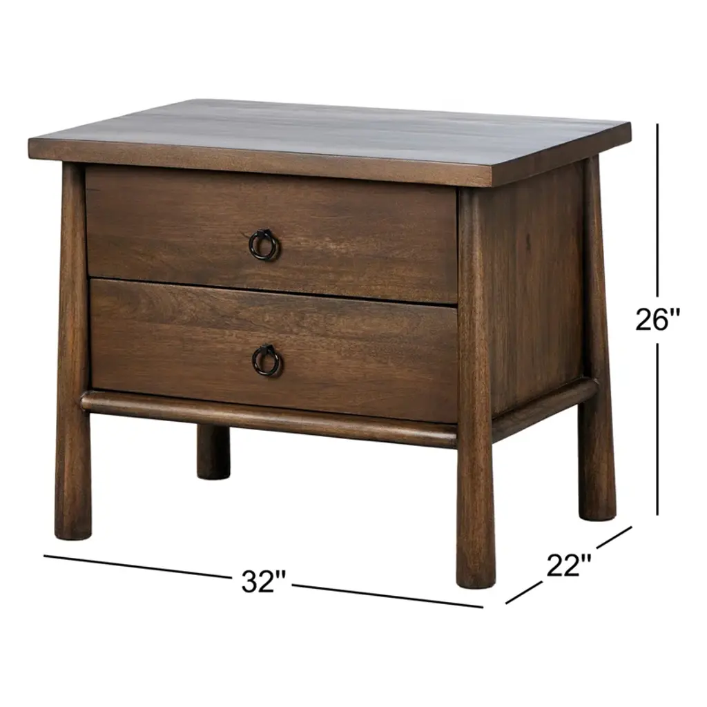 Inspired by French antique design, this dresser stands on round tapered legs with a prominent overhang top. Made of mango wood with cast iron key ring pulls, two drawers make it a versatile choice as a dresser or nightstand.