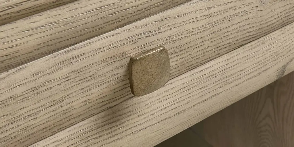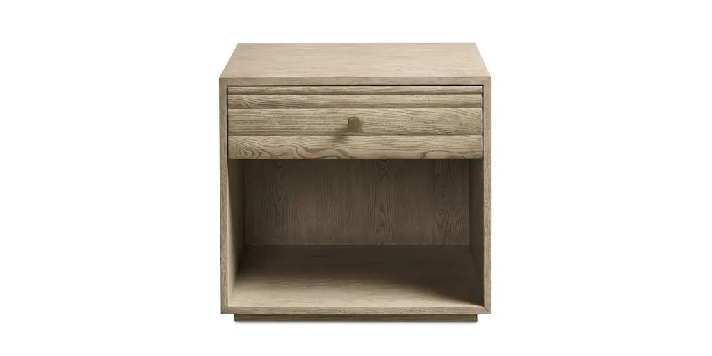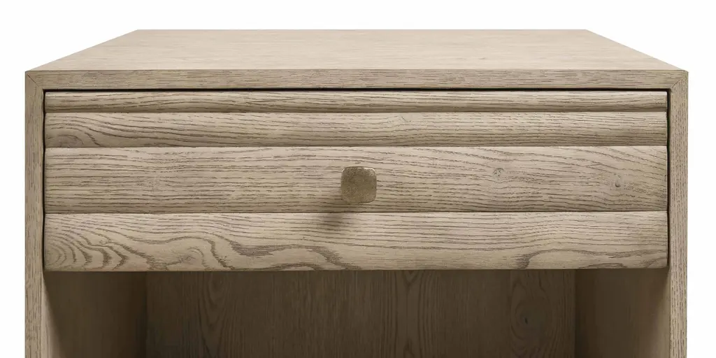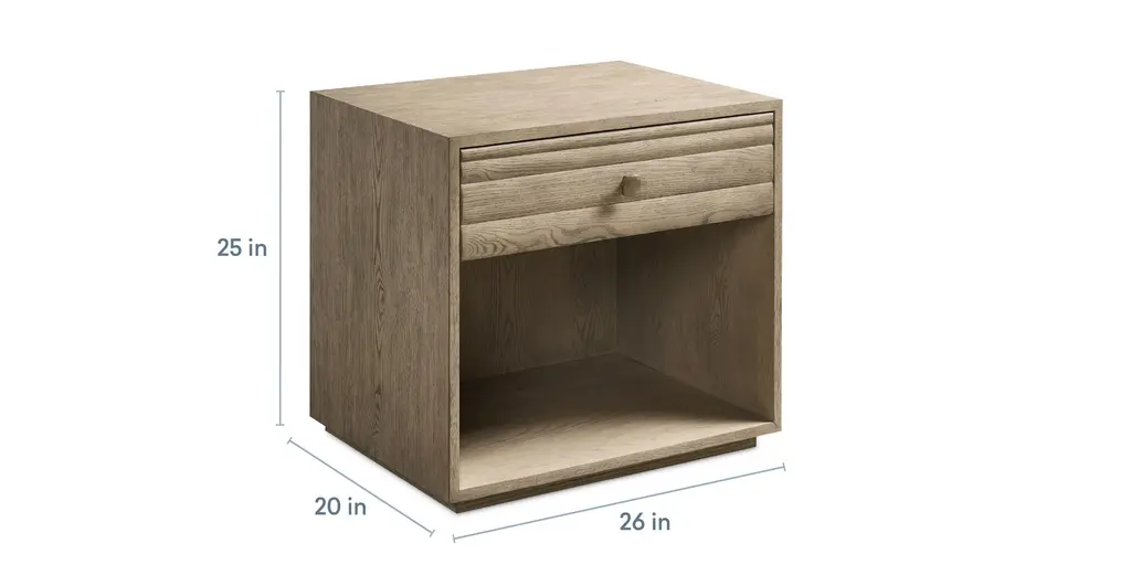 With an open shelf for books or display and a drawer to corral bedside necessities, the Andora Open Nightstand offers yet another opportunity to personalize your Modernist-inspired bedroom. As a counterpoint to the vertical reeding of the collection's headboard, the textured oak on the nightstand maintains the horizontal styling of the Andora dresser and chest. It also boasts the same sand-cast, organically-shaped drawer pulls. Resting on a plinth base, the open nightstand has dimensions equivalent to the 3-Drawer Nightstand and is offered in the same three finishes.