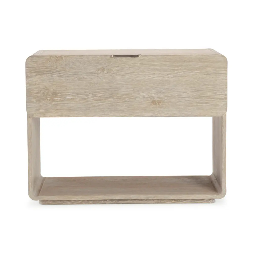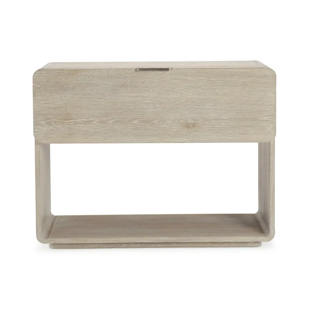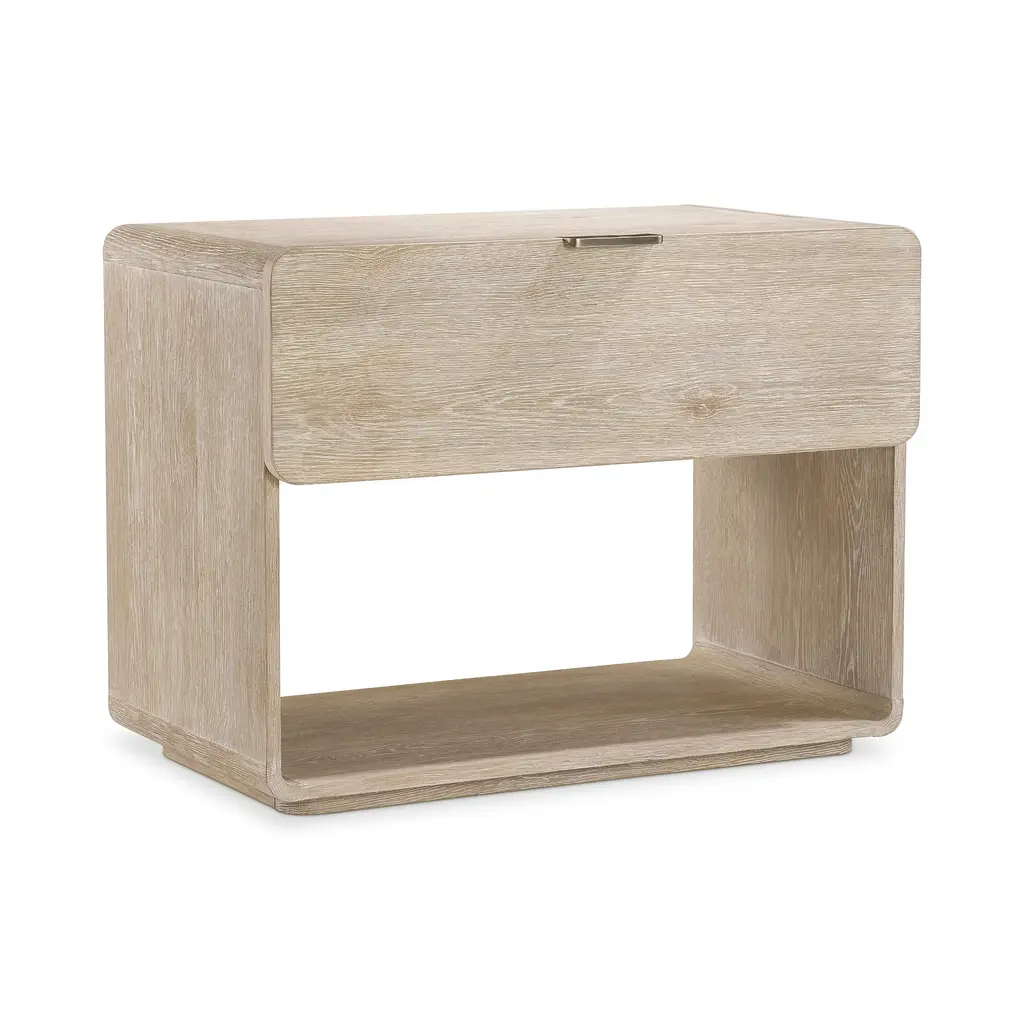 The Antibes Nightstand from Bernhardt features a modern organic design with an open bottom shelf that adds visual lightness. Its single drawer, with a gracefully shaped front, is finished in warm, natural Roz. Equipped with a two-port A+C USB charging station, it seamlessly blends sophisticated style with practical technology integration. Highlights