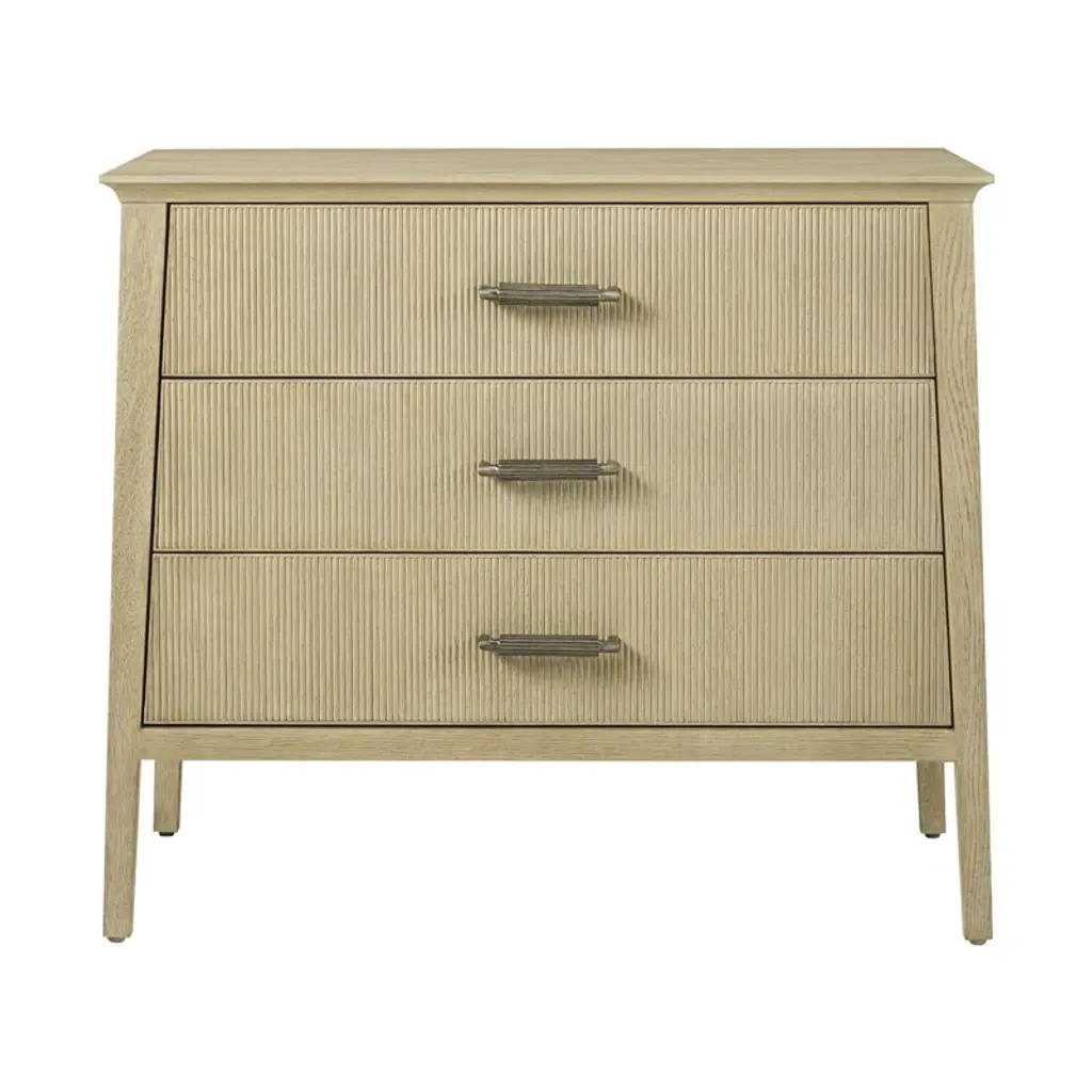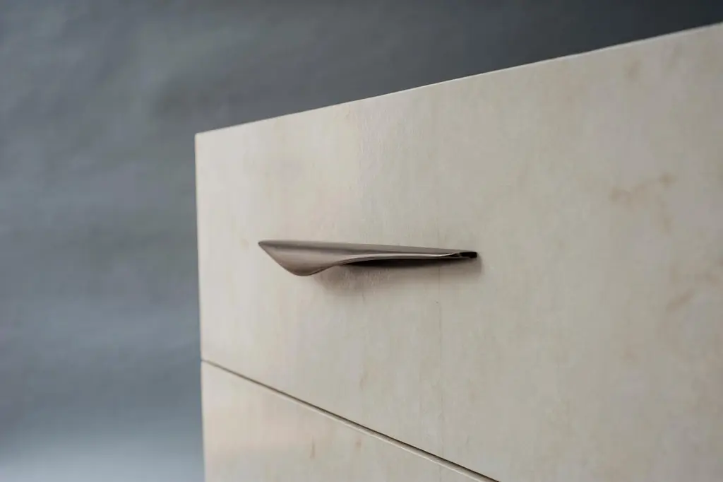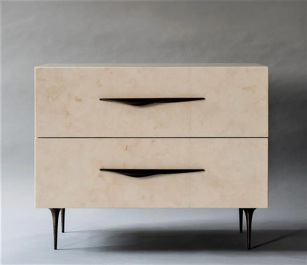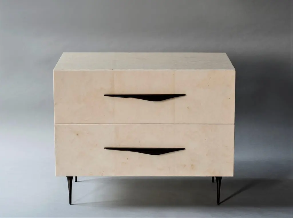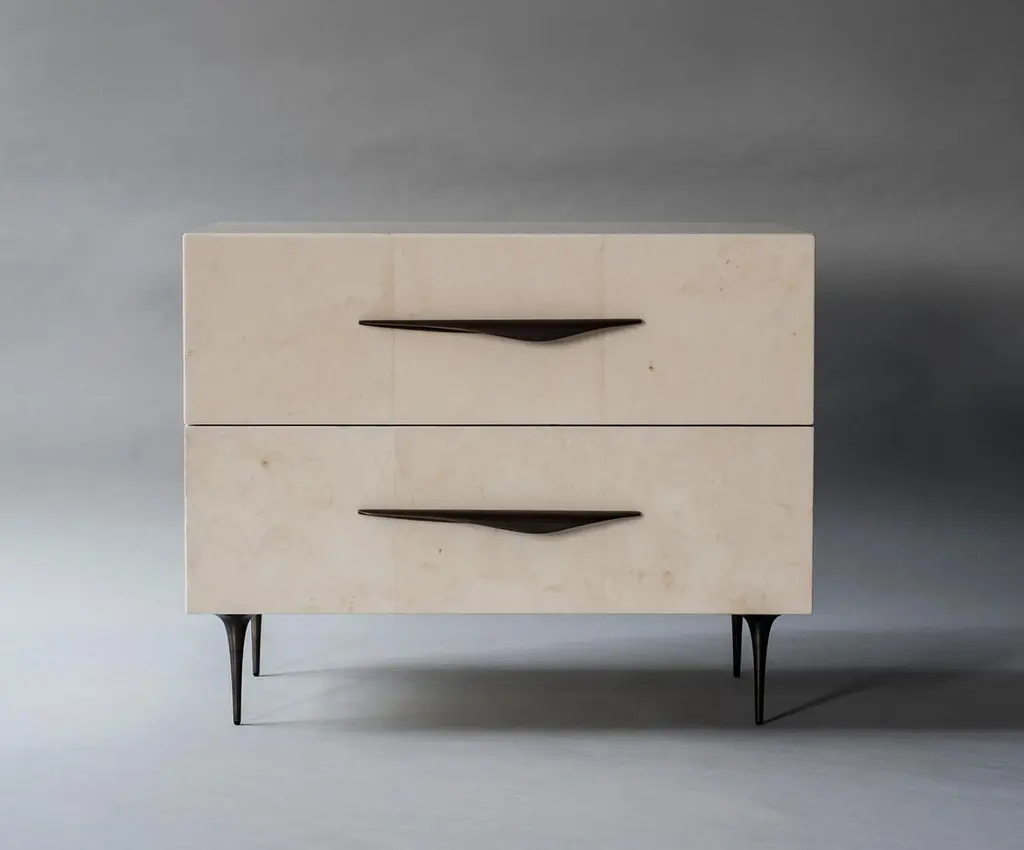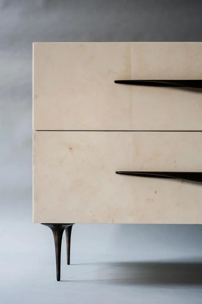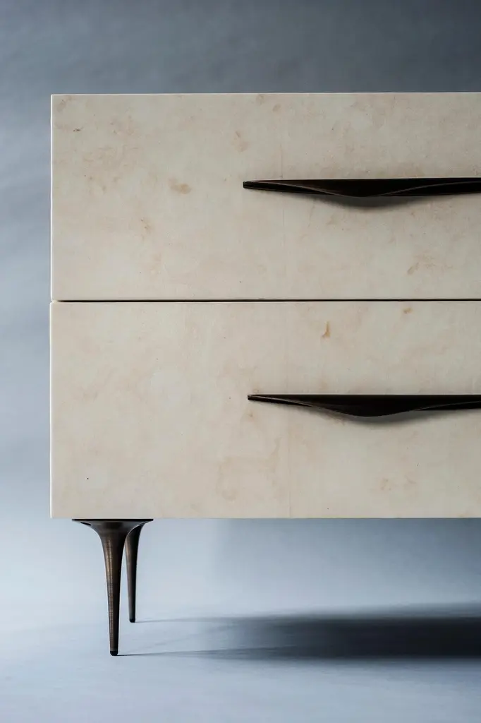 The sculptural legs and handles of the Antwerp bedside table contrast the soft color shifts in the Carta sheathing the table's body.
