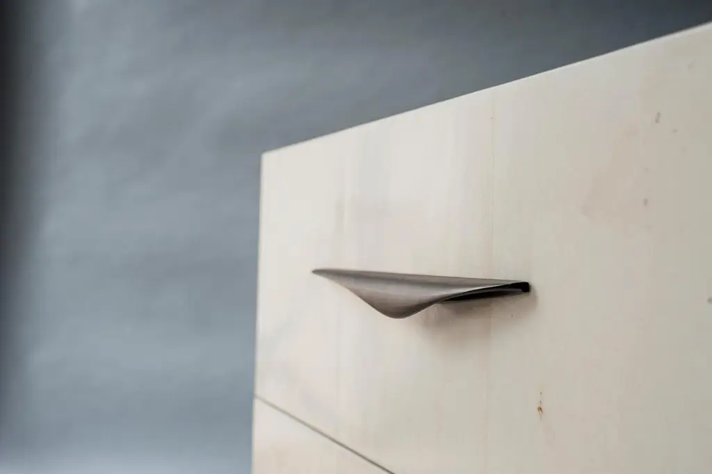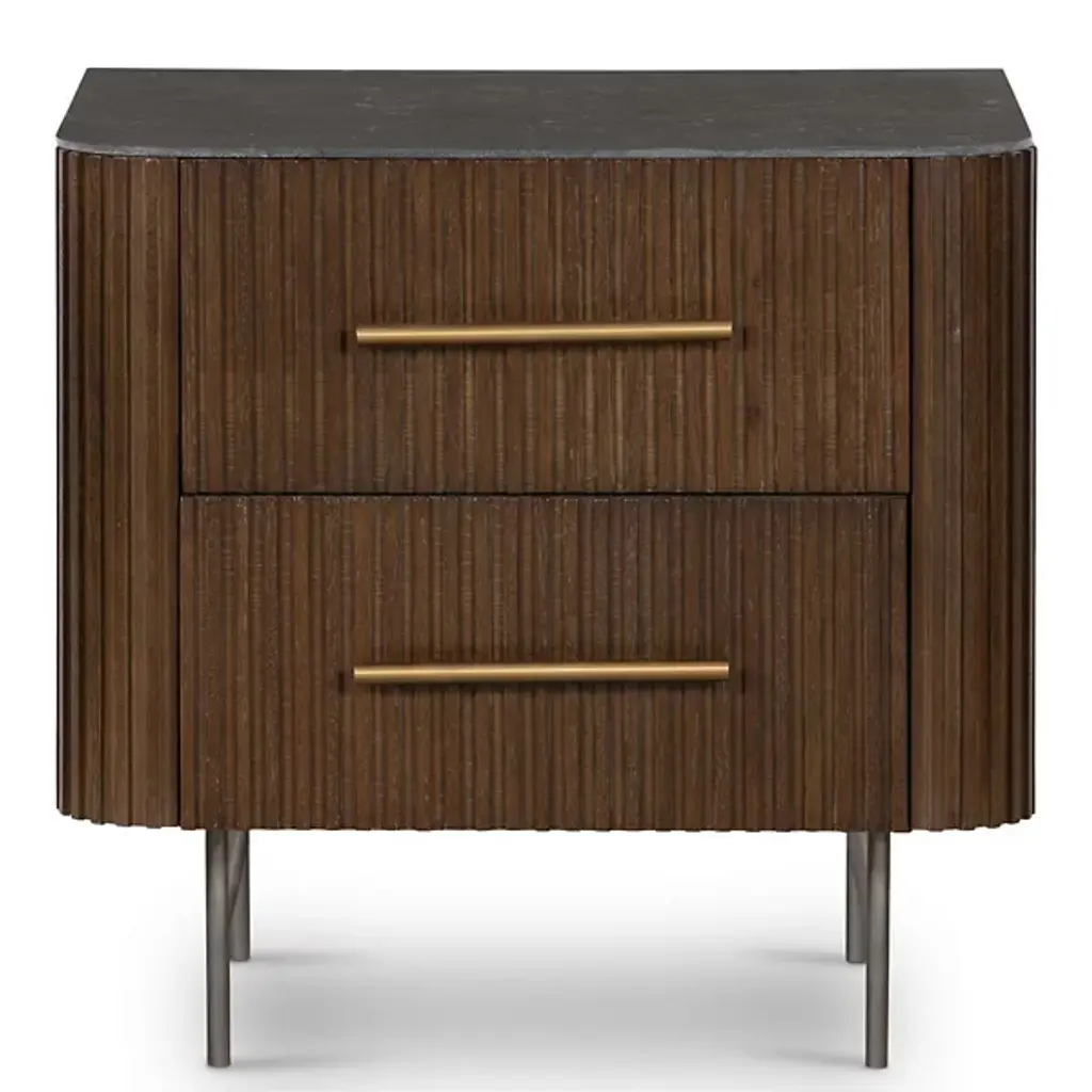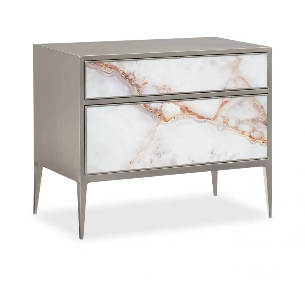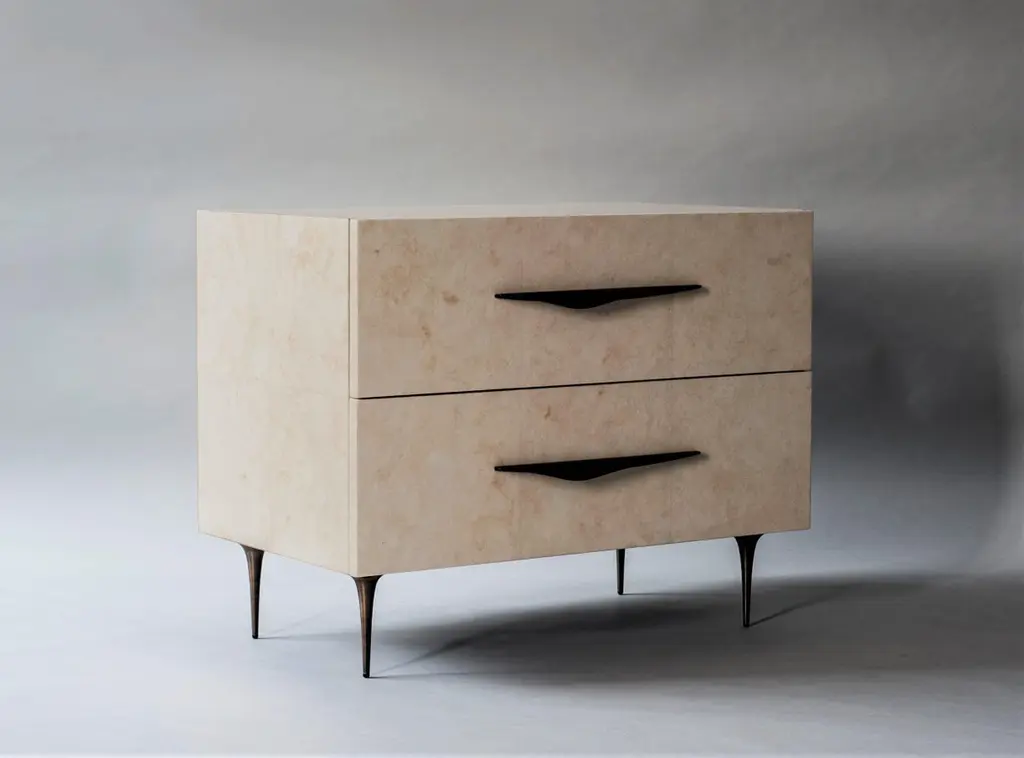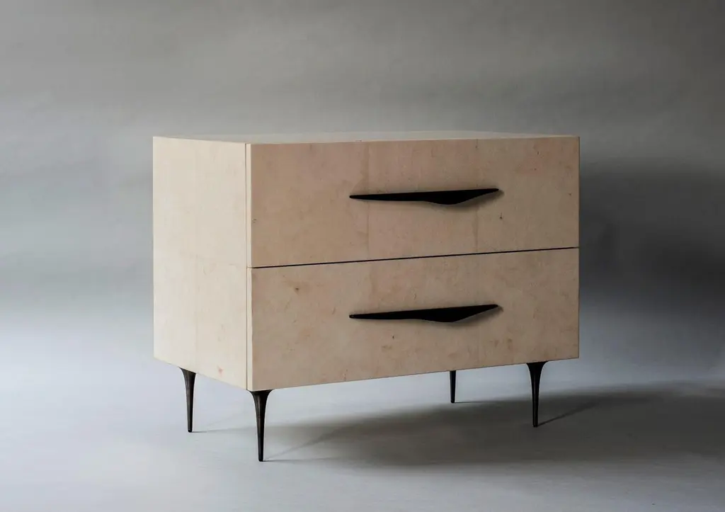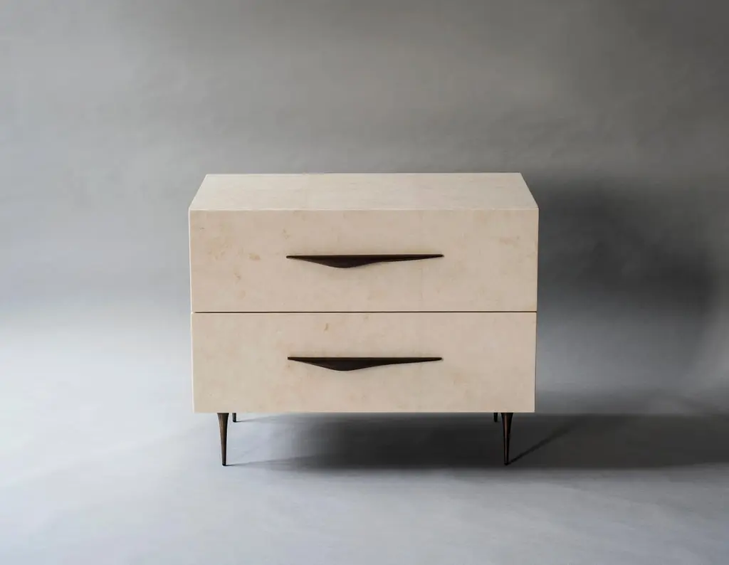 The sculptural legs and handles of the Antwerp bedside tables contrast the soft color shifts in the Carta sheathing the table's body. Made with right hand and left hand facing handles.