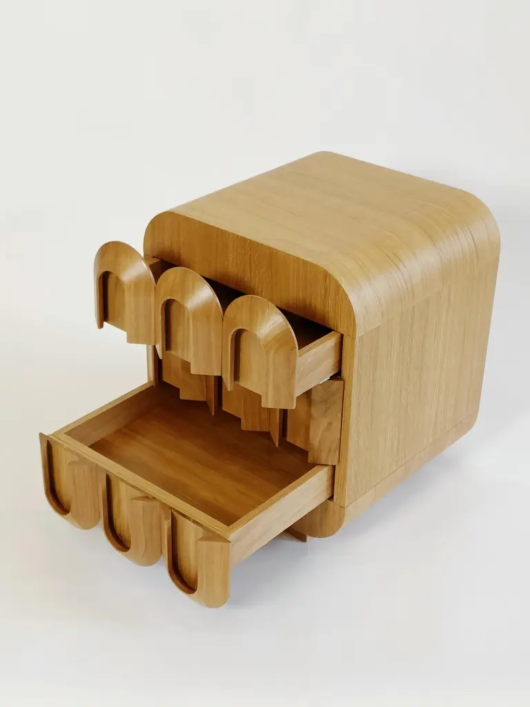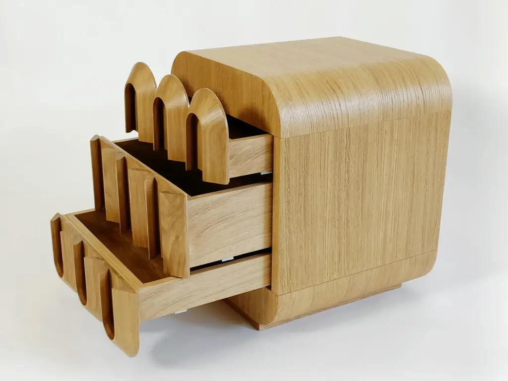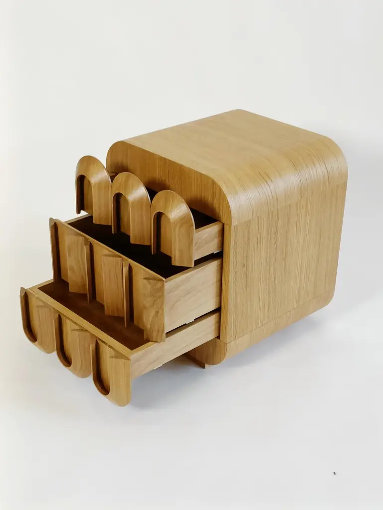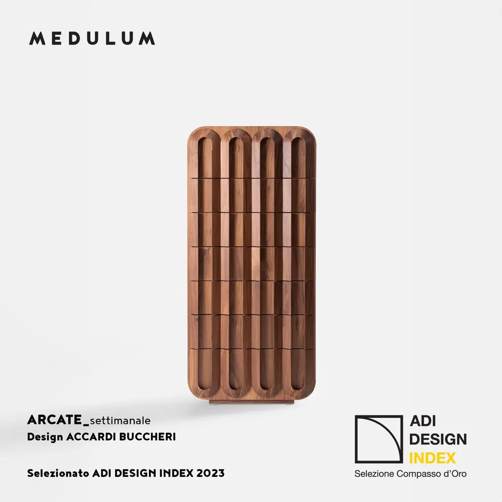 Il comodino Arcate fa parte di una collezione esclusiva che include settimanali e comò, ideata dal rinomato studio milanese Accardi Buccheri per il brand MEDULUM. La scocca, realizzata in multistrato curvato impiallacciato, è disponibile nelle raffinate essenze di rovere, noce canaletto e frassino laccato nero a poro aperto. Un tratto distintivo della collezione è rappresentato dai frontali dei cassetti in legno massello, sapientemente fresati e sagomati per creare un disegno geometrico unico che funge da maniglia per l’apertura.Ispirata all'architettura austera e alla raffinata lievità degli archi presenti in edifici romanici del Veneto, come la chiesa di Santa Fosca e i Duomi di Torcello e Murano, la collezione Arcate celebra l'eleganza dell’arco nelle costruzioni storiche della laguna veneta. Questi complementi d'arredo, con superfici vibranti e una forte vocazione architettonica, incarnano un omaggio dichiarato a uno degli elementi architettonici più essenziali e suggestivi, combinando linee curve e rette, pieni e vuoti, in una sintesi perfetta di severità e leggerezza.A testimonianza dell'eccellenza del design e della qualità artistica, il settimanale Arcate ha ricevuto una menzione d'onore al prestigioso premio Compasso d'Oro ADI. Questa menzione d'onore sottolinea il valore e l'importanza della serie Arcate nel panorama del design contemporaneo.