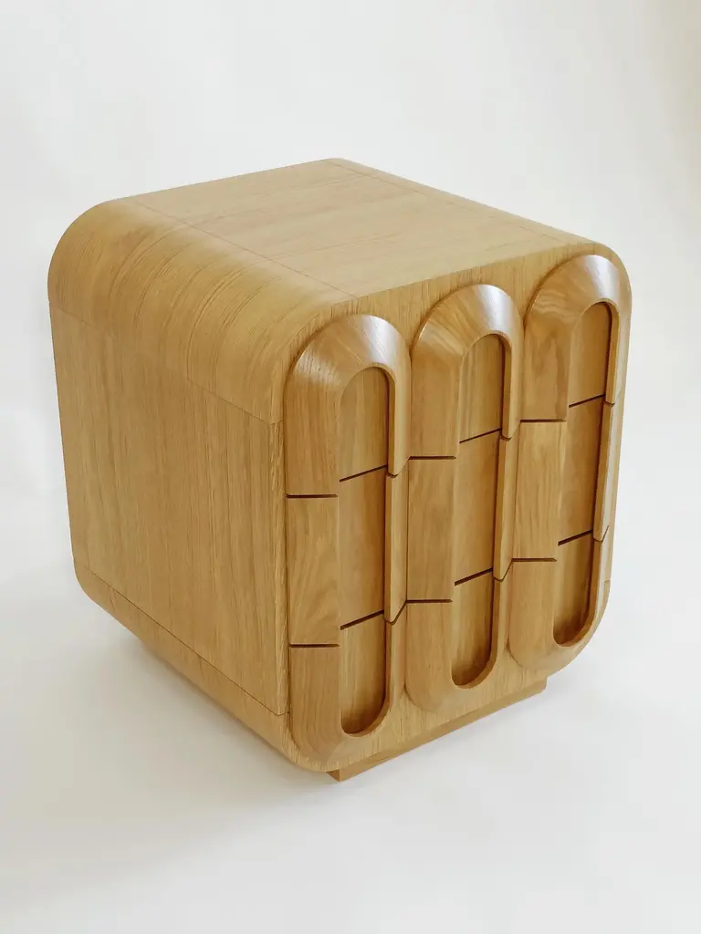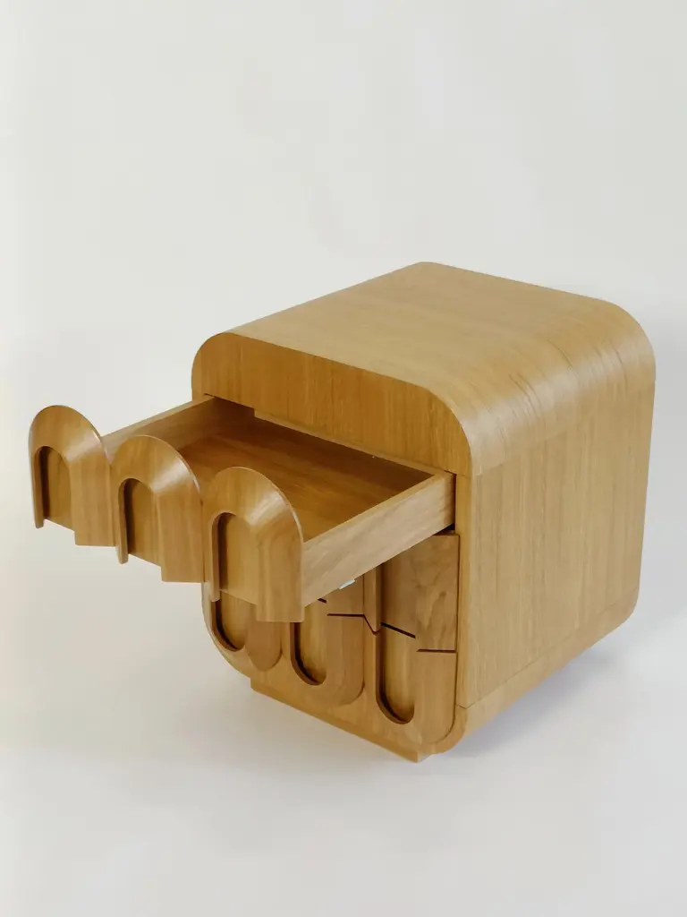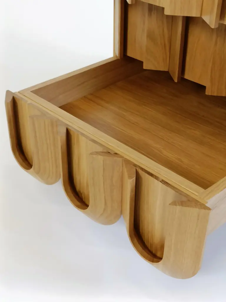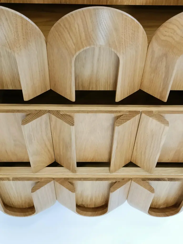 Il comodino Arcate fa parte di una collezione esclusiva che include settimanali e comò, ideata dal rinomato studio milanese Accardi Buccheri per il brand MEDULUM. La scocca, realizzata in multistrato curvato impiallacciato, è disponibile nelle raffinate essenze di rovere, noce canaletto e frassino laccato nero a poro aperto. Un tratto distintivo della collezione è rappresentato dai frontali dei cassetti in legno massello, sapientemente fresati e sagomati per creare un disegno geometrico unico che funge da maniglia per l’apertura.Ispirata all'architettura austera e alla raffinata lievità degli archi presenti in edifici romanici del Veneto, come la chiesa di Santa Fosca e i Duomi di Torcello e Murano, la collezione Arcate celebra l'eleganza dell’arco nelle costruzioni storiche della laguna veneta. Questi complementi d'arredo, con superfici vibranti e una forte vocazione architettonica, incarnano un omaggio dichiarato a uno degli elementi architettonici più essenziali e suggestivi, combinando linee curve e rette, pieni e vuoti, in una sintesi perfetta di severità e leggerezza.A testimonianza dell'eccellenza del design e della qualità artistica, il settimanale Arcate ha ricevuto una menzione d'onore al prestigioso premio Compasso d'Oro ADI. Questa menzione d'onore sottolinea il valore e l'importanza della serie Arcate nel panorama del design contemporaneo.