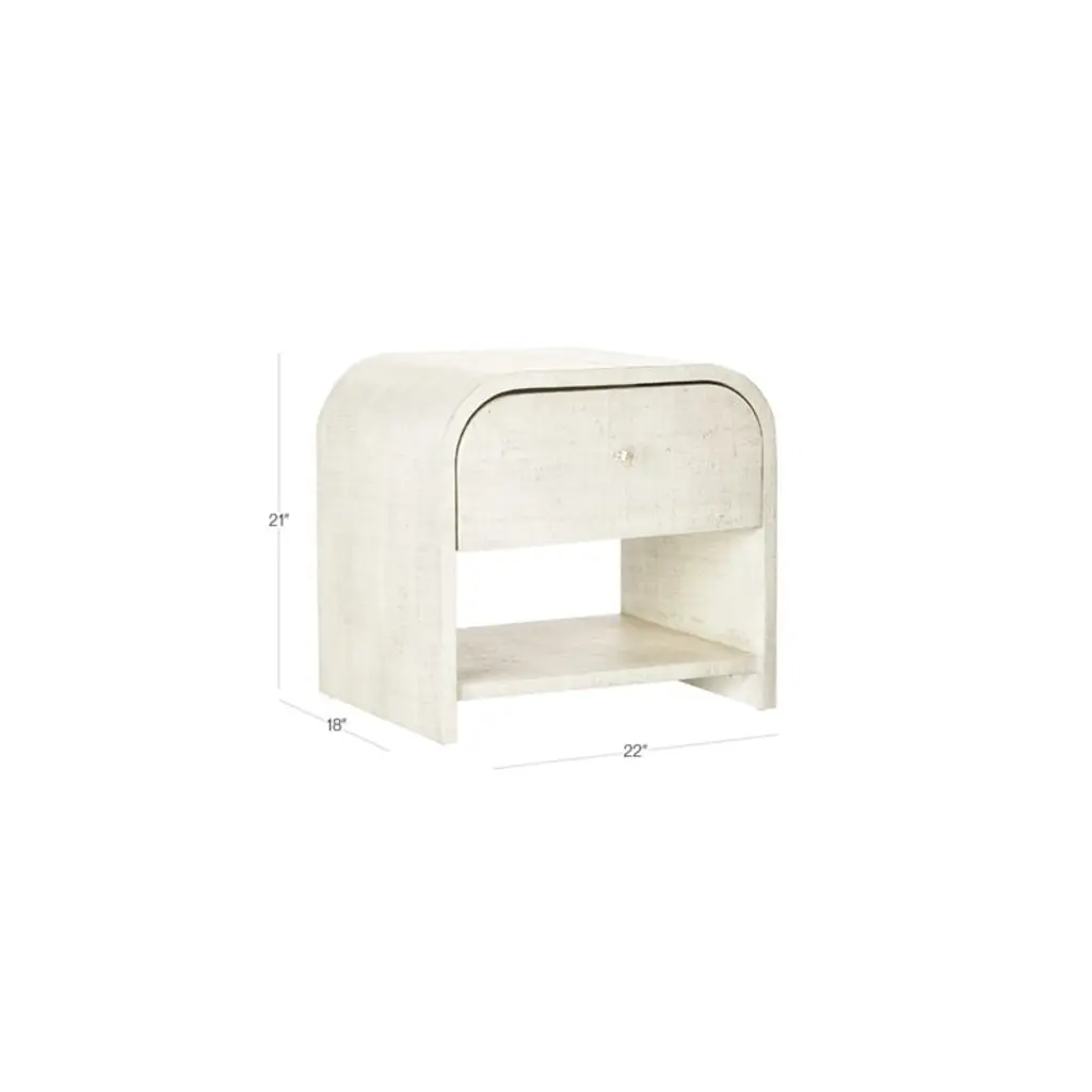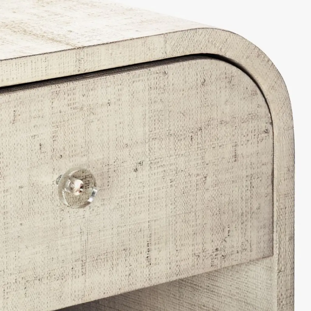 Curvy nightstand gets an unexpected layer of luxe linen. Lacquered for durability and finished with a grey wash for depth of color and interest. Single drawer features a clean acrylic knob. We love the texture and sophistication it adds to any space. Learn more about VUUE on our blog. CB2 exclusive.