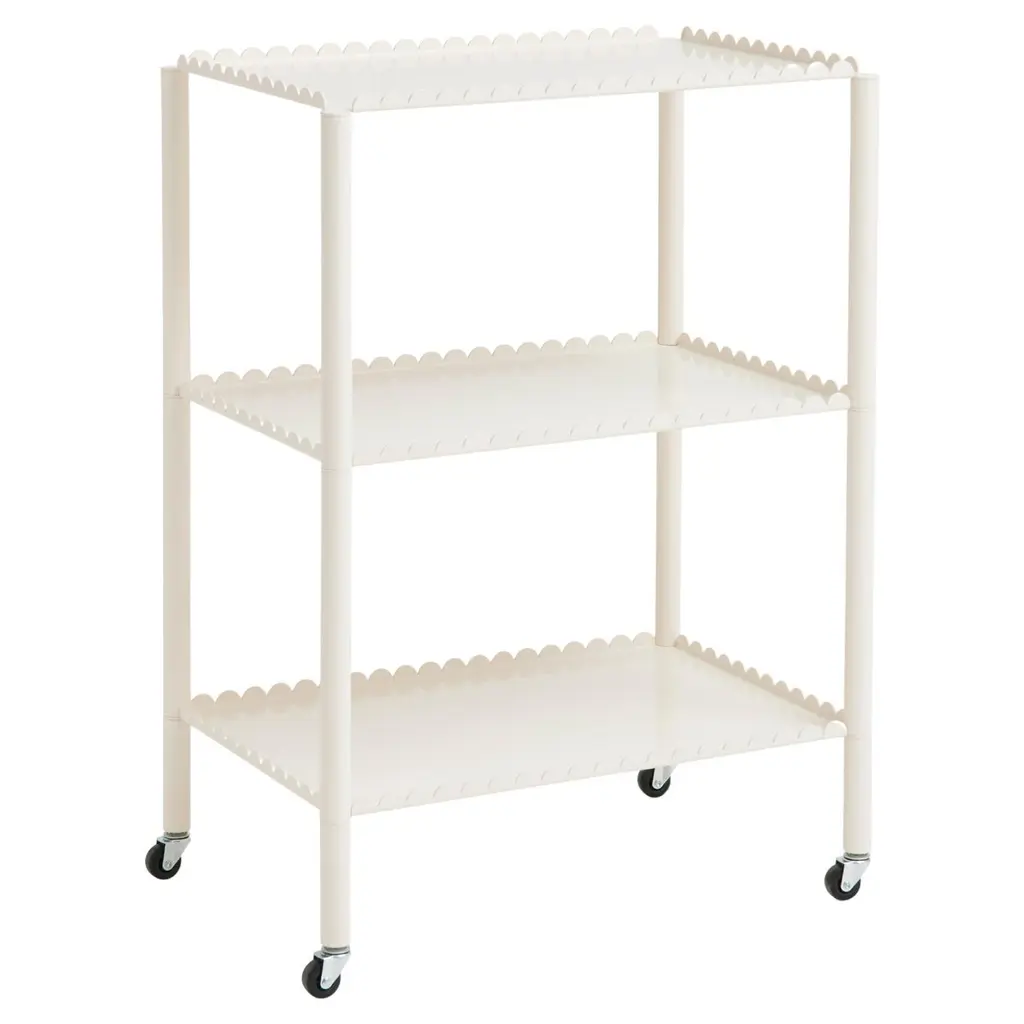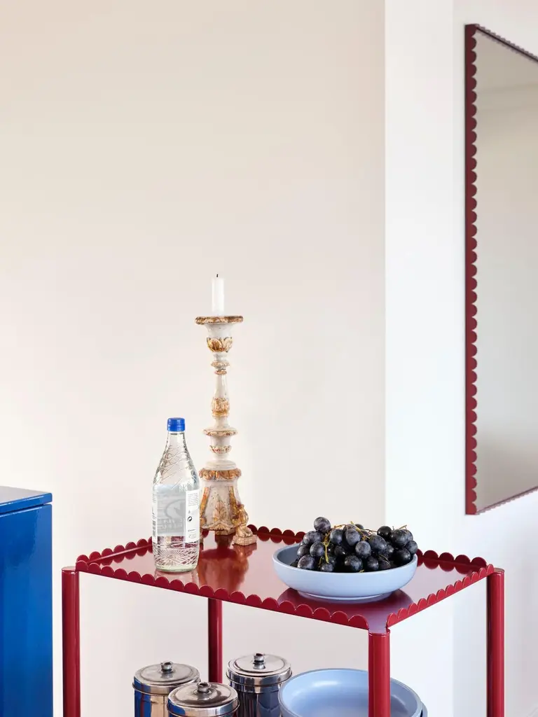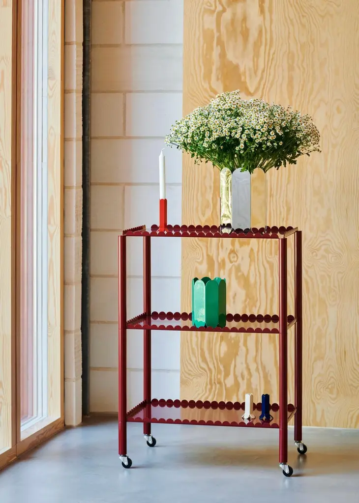Designed by Belgian duo Muller Van Severen, Arcs Trolley is a functional and decorative trolley encased in a unified chain of vertical arcs. A small piece of furniture with a strong presence, the trolley combines industrial techniques with poetic lines to create a distinctive and sculptural expression. The elegant, scalloped frame supports two or three tiers, with slim legs mounted on castors for easy manoeuvring. Made in powder coated steel in different colour options, the trolley is suitable for most rooms and uses in the home, from displaying and storing items in the living room to extra shelving in the kitchen or as a bedside cabinet.Designer Muller Van SeverenMuller Van Severen was founded in 2011 by Belgian artist duo Fien Muller and Hannes Van Severen. The couple has always been on an inspired quest for sculpturally interesting furniture objects, and their work sits somewhere between design and art, drawing on their passion for architecture and materials. They have won countless awards and collaborated with prestigious museums worldwide (such as Vitra Museum, Centre Pompidou and Musée des Arts Décoratifs Paris) and international galleries (Galerie Kreo, Side Gallery, Valerie Traan Gallery). For HAY, Muller Van Severen has designed the Two-Color, Ceramic Table, Color Cabinet, MVS Cutlery, the Arcs Collection, Color Rack, Color Hanger and Arcs Salt & Pepper Grinder.
