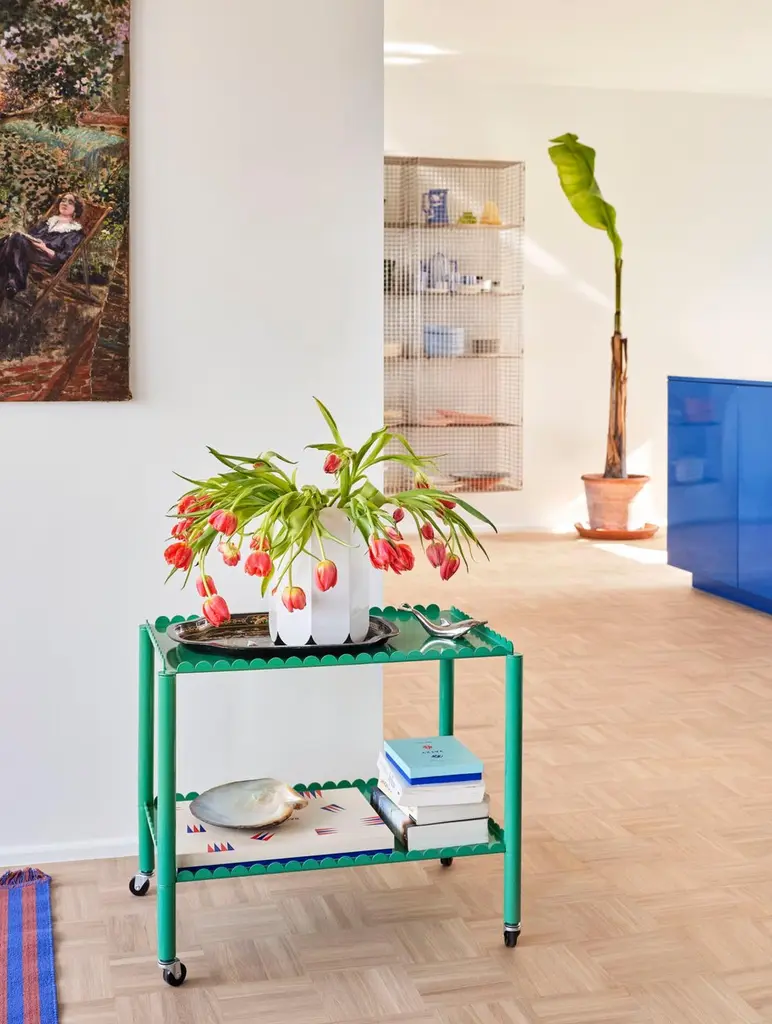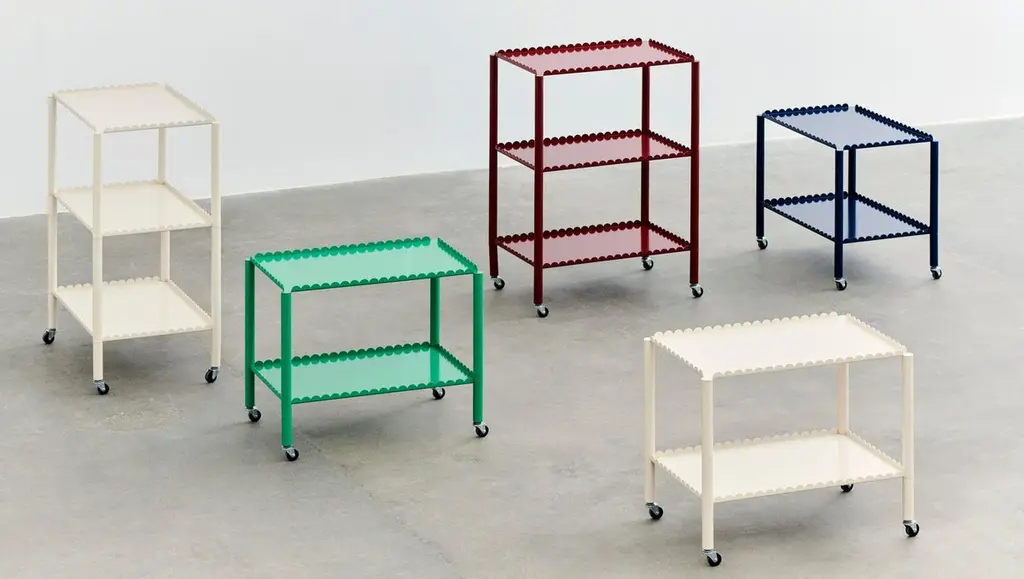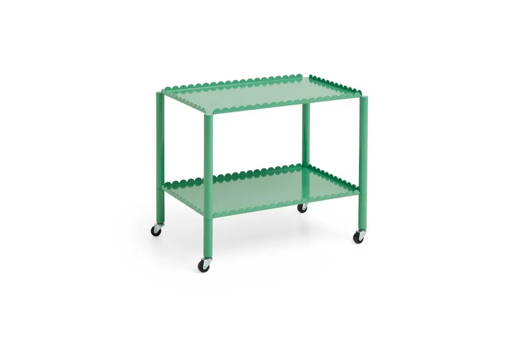 Designed by Belgian duo Muller Van Severen, Arcs Trolley is a functional and decorative trolley encased in a unified chain of vertical arcs. A small piece of furniture with a strong presence, the trolley combines industrial techniques with poetic lines to create a distinctive and sculptural expression. The elegant, scalloped frame supports two or three tiers, with slim legs mounted on castors for easy maneuvering. Made in powder coated steel in different color options, the trolley is suitable for most rooms and uses in the home, from displaying and storing items in the living room to extra shelving in the kitchen or as a bedside cabinet.Designer Muller Van SeverenMuller Van Severen was founded in 2011 by Belgian artist duo Fien Muller and Hannes Van Severen. The couple has always been on an inspired quest for sculpturally interesting furniture objects, and their work sits somewhere between design and art, drawing on their passion for architecture and materials. They have won countless awards and collaborated with prestigious museums worldwide (such as Vitra Museum, Centre Pompidou and Musée des Arts Décoratifs Paris) and international galleries (Galerie Kreo, Side Gallery, Valerie Traan Gallery). For HAY, Muller Van Severen has designed the Two-Color, Ceramic Table, Color Cabinet, MVS Cutlery, the Arcs Collection, Color Rack, Color Hanger and Arcs Salt & Pepper Grinder.