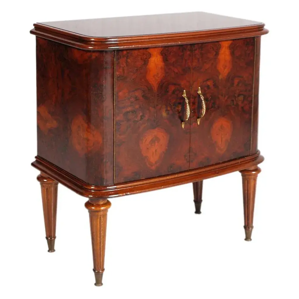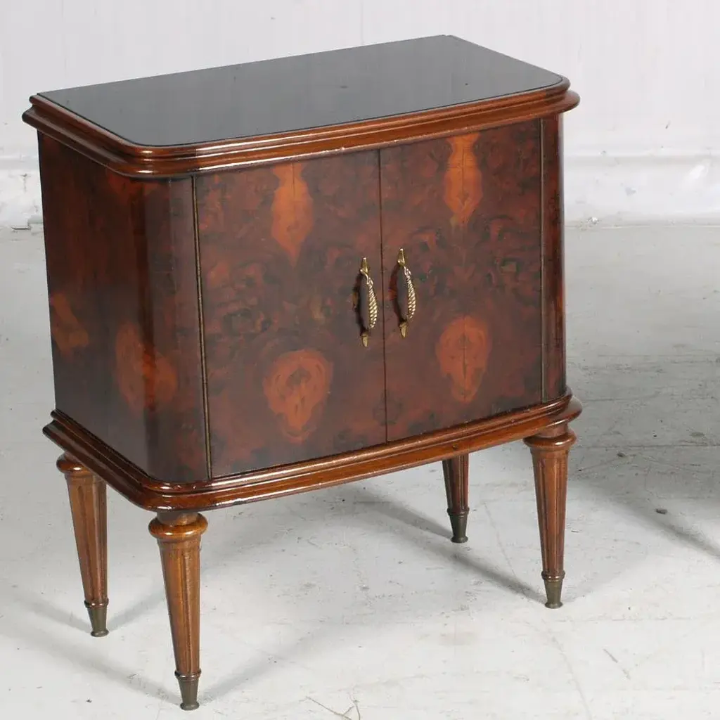 Art Decò bedside table, walnut root by Paolo Buffa for permanent Cantù furniture Elegant Mid-Century modern bedside table with two doors of Paolo Buffa for the permanent Cantù furniture in walnut root. Accessories such as golden brass handles and feet. Top in lacquered crystal. Paolo Buffa The Italian architect and designer Paolo Buffa (1903-1970) was active between the 1930s and 60s, and is known for his furniture that merges the neoclassical style with art of art of modernist. His pieces are often devoid of brands or distinctive signs, making them therefore difficult to authenticate. Born and raised in Milan, Buffa studies architecture at the famous Polytechnic of the city, where he graduated in 1927. The following year he founded a design study together with Antonio Cassi Ramelli, met during a short work in the Atelier of Gio Ponti and Emilio Lancia. The professional debut of the two designers takes place in 1930, when the duo presents a dining room installation at the Triennale of that year. Between 1933 and 1936, Buffa will merge his study. By drawing for the highest Milanese social classes, Buffa design are manually made in the most fine and quality materials, and are able to compete with Emile-Jacques Ruhlmann, legend of the French art of art. Collaborating with talented ebanists such as Mario Quarti, and specialized craftsmen, Buffa slowly manages to introduce modern techniques on the design scene of the early 1940s. The evolution of Buffa's aesthetic, progressively increasingly modern, is very clear and linear; from the neoclassical furniture of the beginnings, with their complex and intricate decorations, Buffa comes to draw in the 1960s armchairs and essential consoles and pure lines. In the 1960s he will also collaborate with Cassina. In addition to the design of furniture, Buffa has also dedicated itself to a variety of architectural projects, and interior design, which range from the design of tombs (its very first commission) to yacht for the Egyptian realities, villas, hotels, offices, and so on. Despite its abundant production, and its importance for the evolution of design culture in Italy in the middle of the century, it was written relatively little on the designer after his death in the 70s. Nonetheless, the appetite of collectors and enthusiasts for its objects continues to grow on the vintage market, in particular thanks to their very high quality and for the successful union of classicism and modernity. This piece has an attribution mark, I am sure that it is completely authentic and take full responsibility for any authenticity issues arising from misattribution
