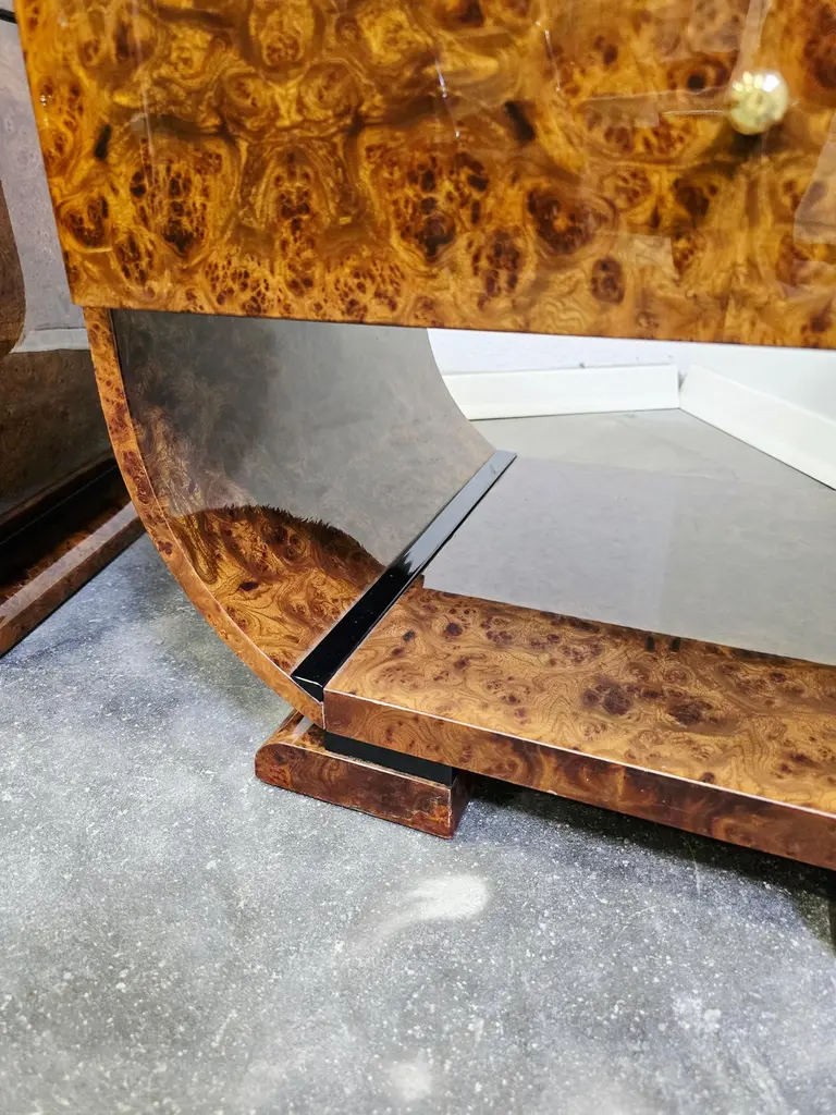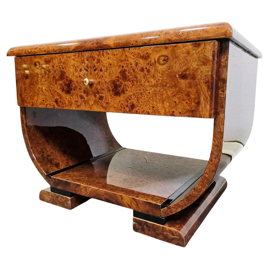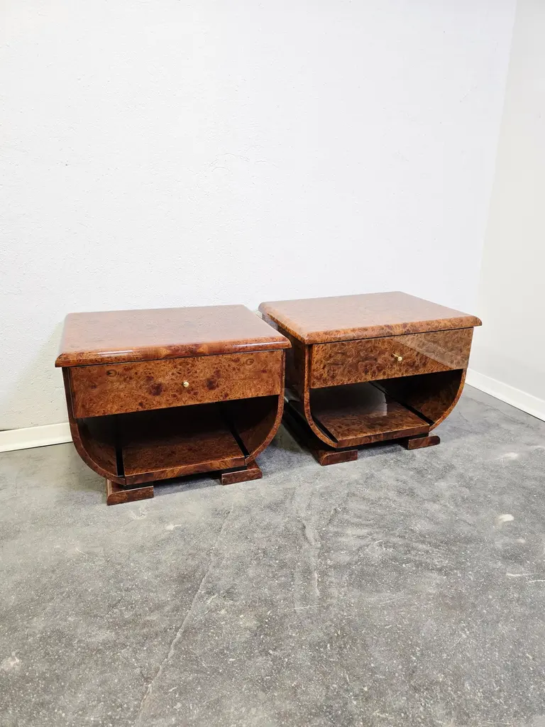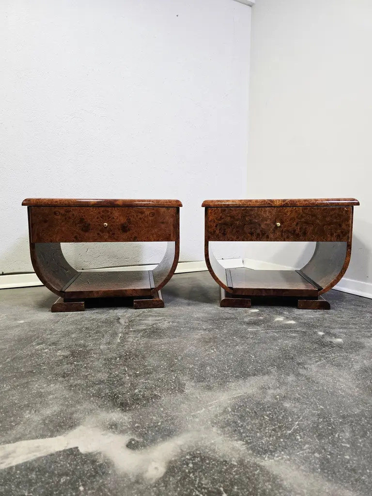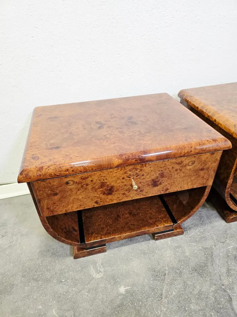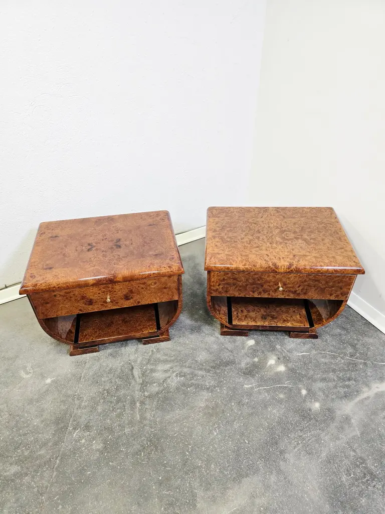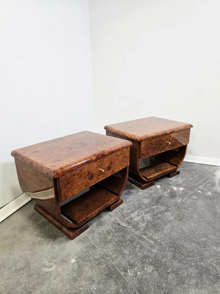 Art deco inspired style nightstands with beautiful veneer walnut burl wood with brass handles. Softly shaped patterns and smooth angles with the generous shape.Price is for one piece.A stunning example of timeless Art Deco design, these nightstands combine the rich warmth of walnut burl veneer with elegant brass details. The geometric lines and luxurious materials reflect the glamour and craftsmanship.