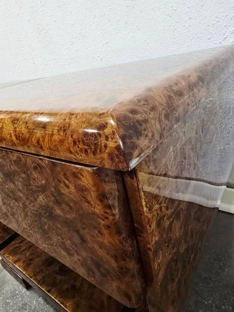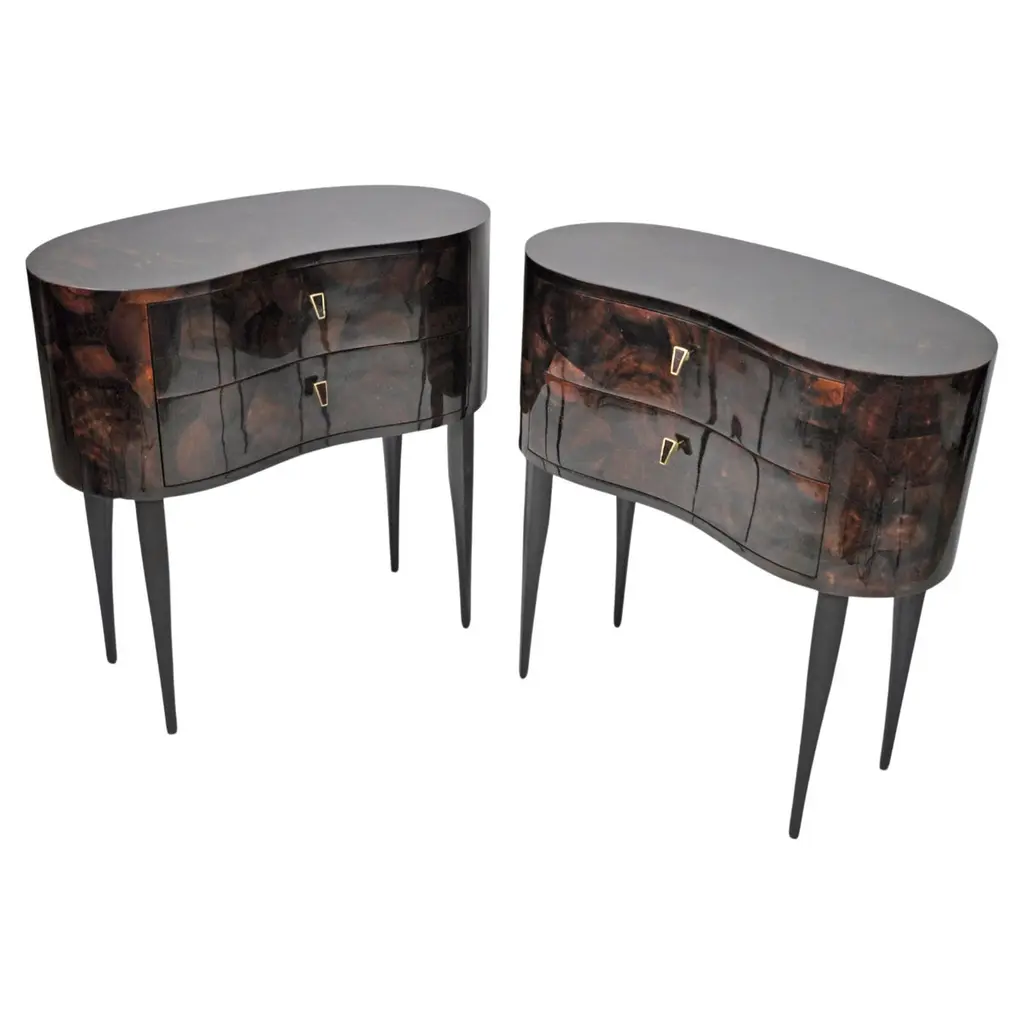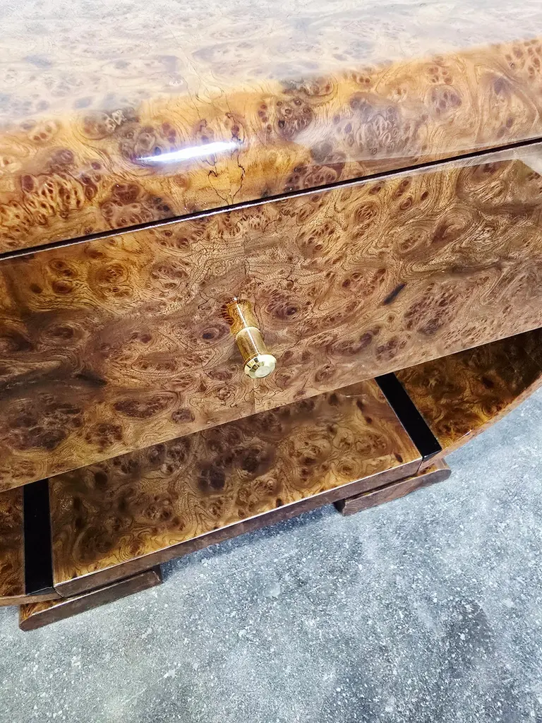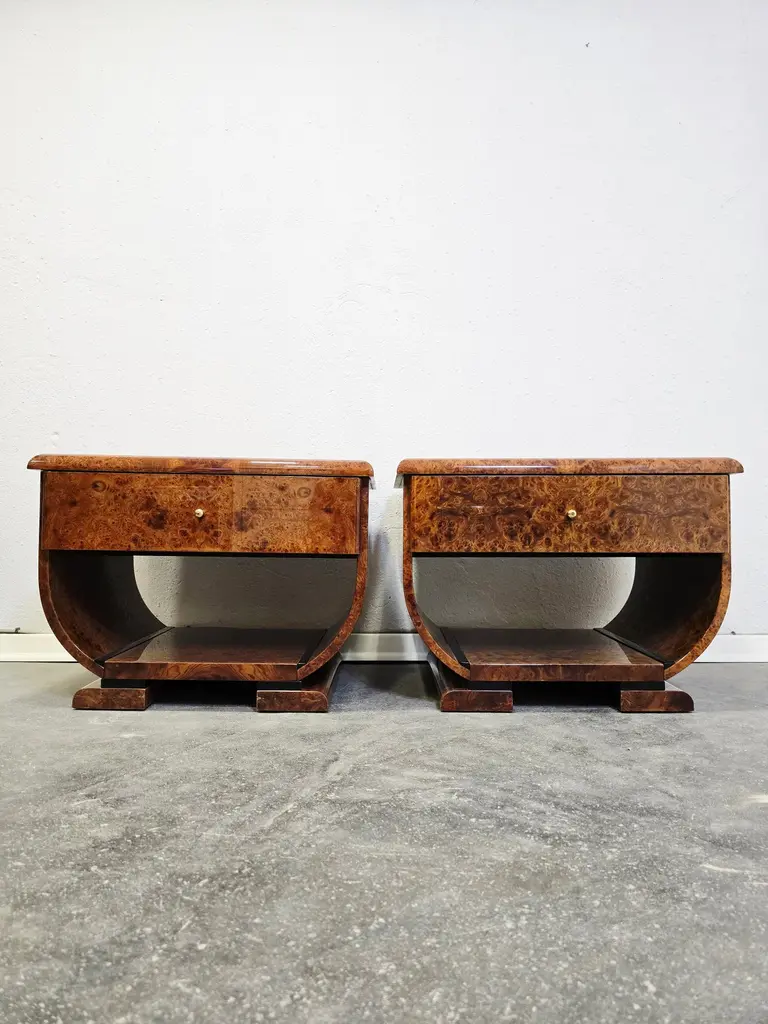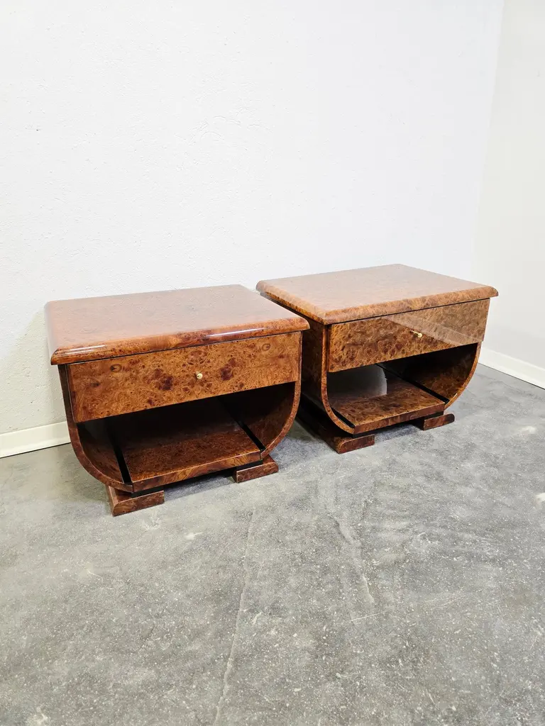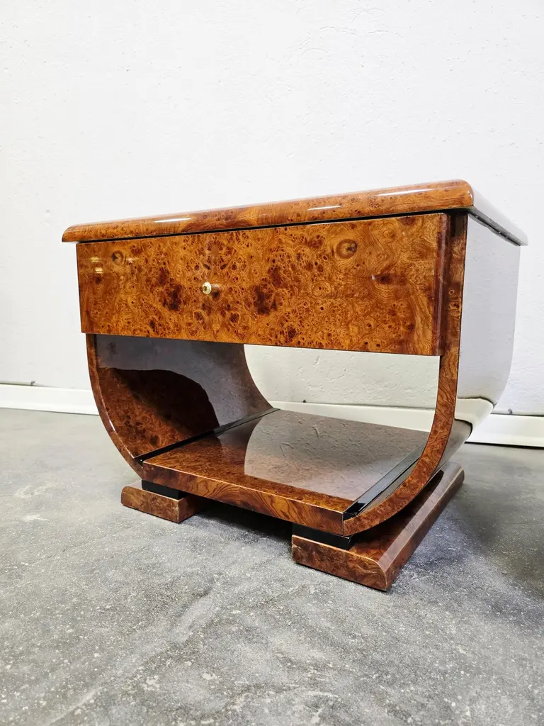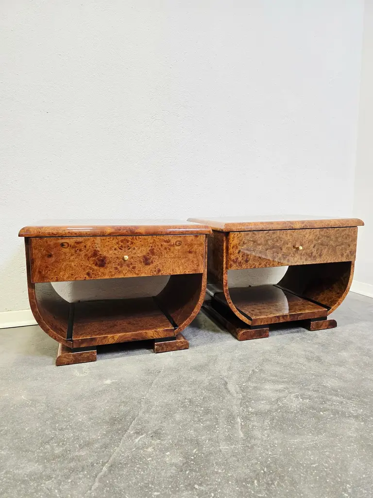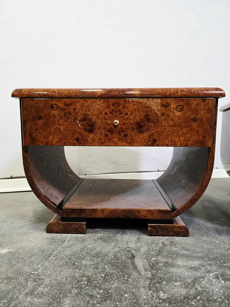 Art deco inspired style nightstands with beautiful veneer walnut burl wood with brass handles. Softly shaped patterns and smooth angles with the generous shape.Price is for one piece.A stunning example of timeless Art Deco design, these nightstands combine the rich warmth of walnut burl veneer with elegant brass details. The geometric lines and luxurious materials reflect the glamour and craftsmanship.