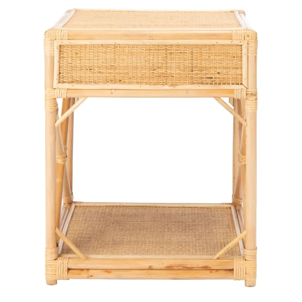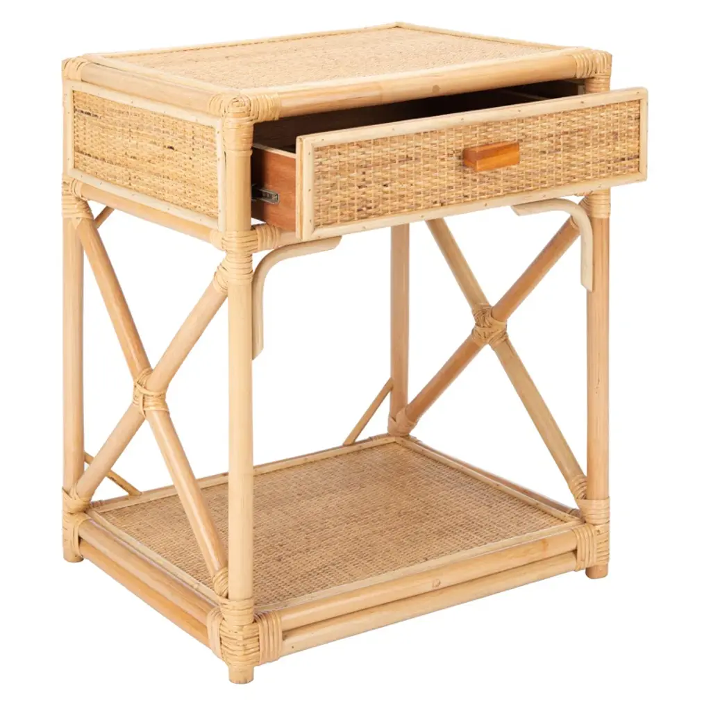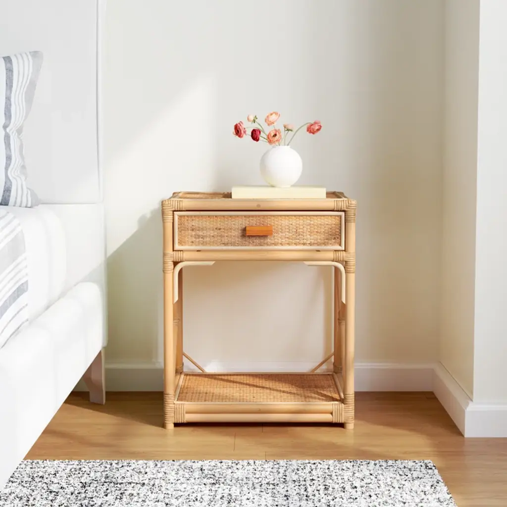 You can almost feel the warm ocean breeze that inspired the airy look and feel of the Arvis Nightstand. Crafted of mindi wood in rich natural tones, Arvis brings a relaxing vibe while offering a convenient shelf and drawer for easy access storage. Vacation home not included.