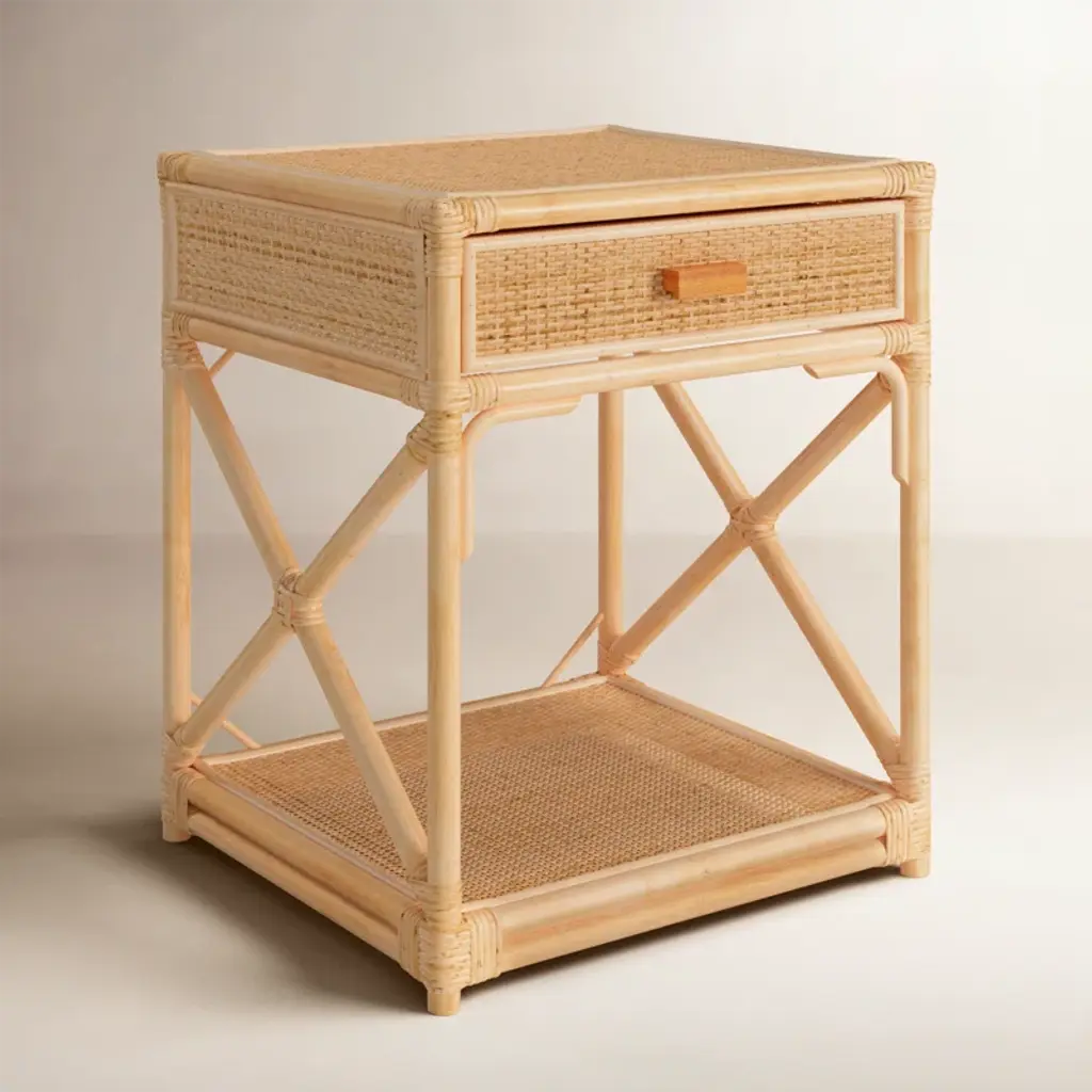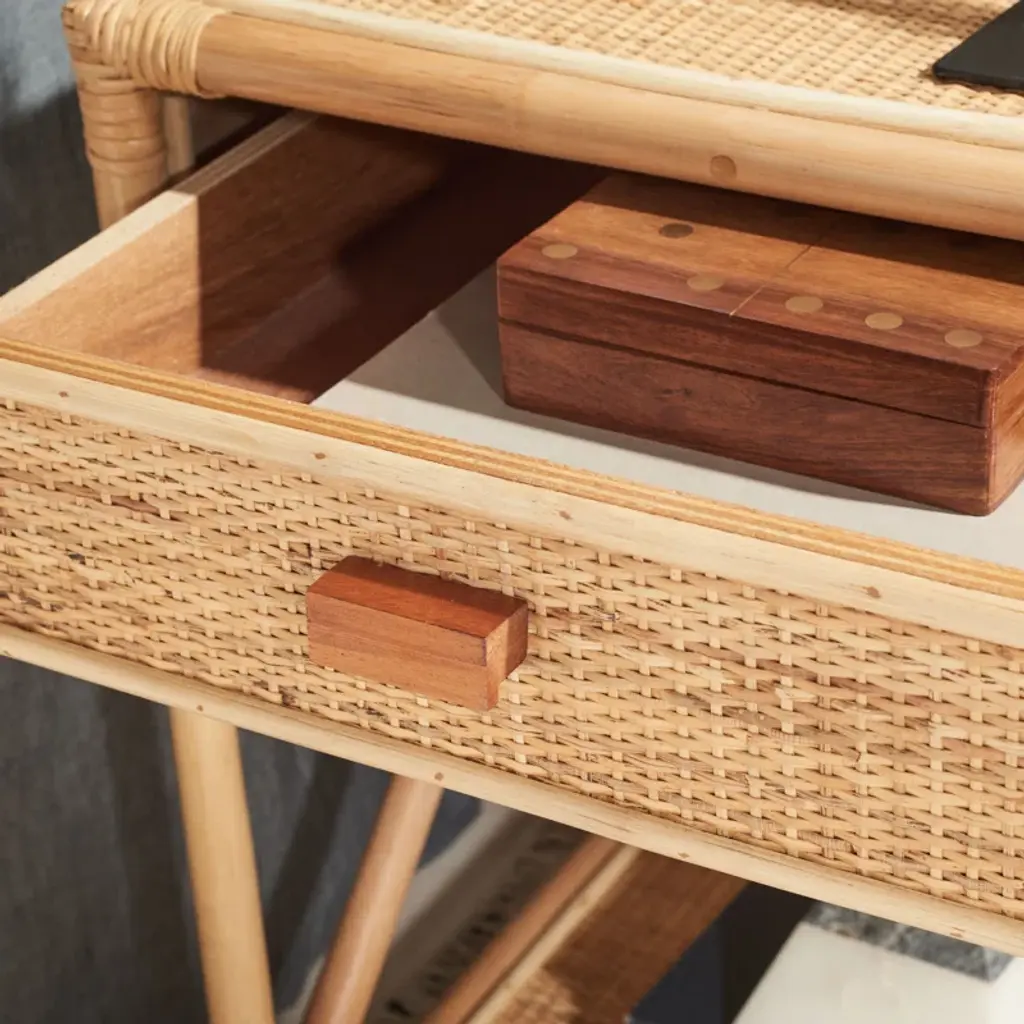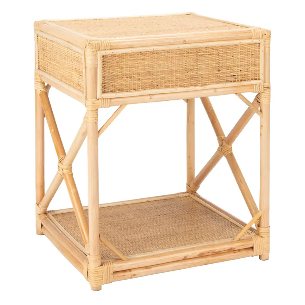 You can almost feel the warm ocean breeze that inspired the airy look and feel of the Arvis Nightstand. Crafted of mindi wood in rich natural tones, Arvis brings a relaxing vibe while offering a convenient shelf and drawer for easy access storage. Vacation home not included.