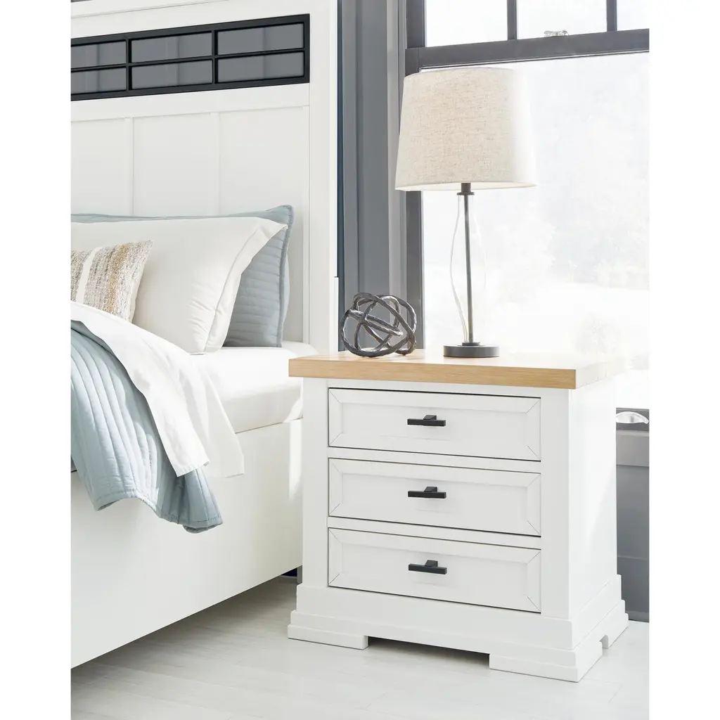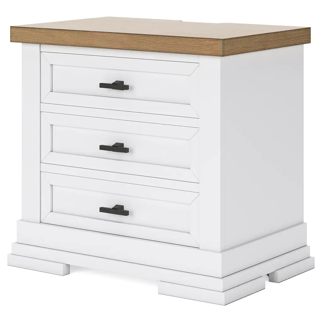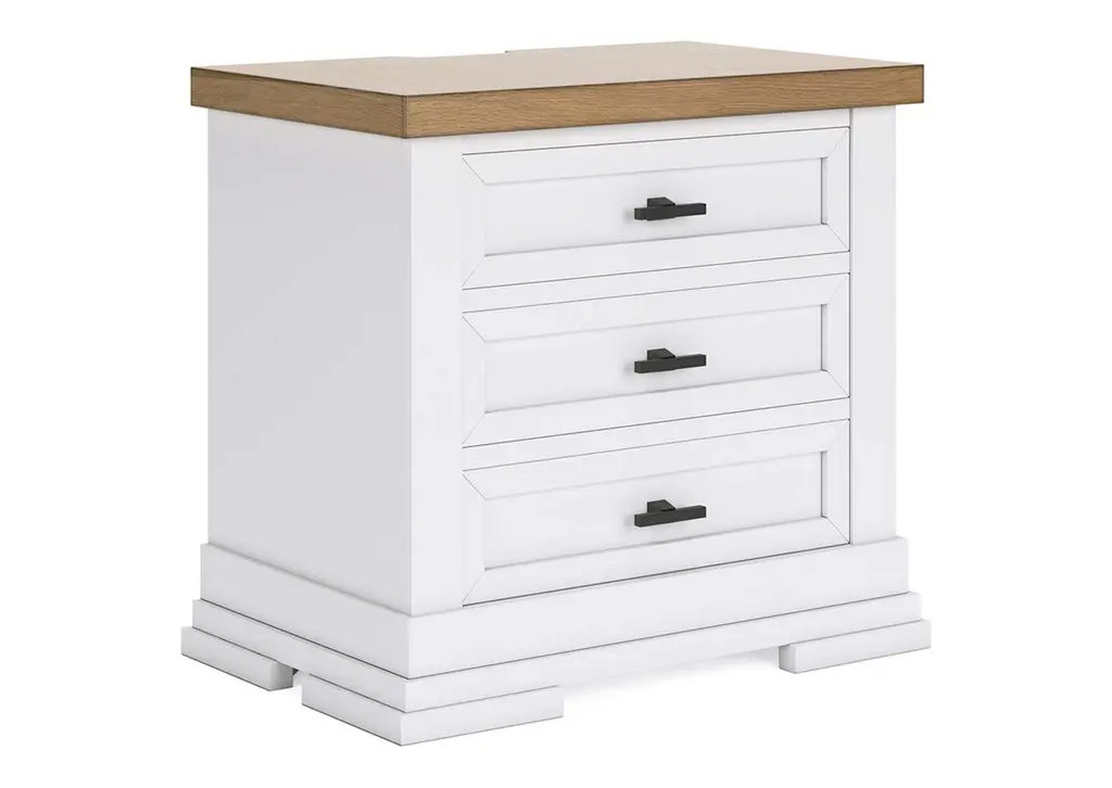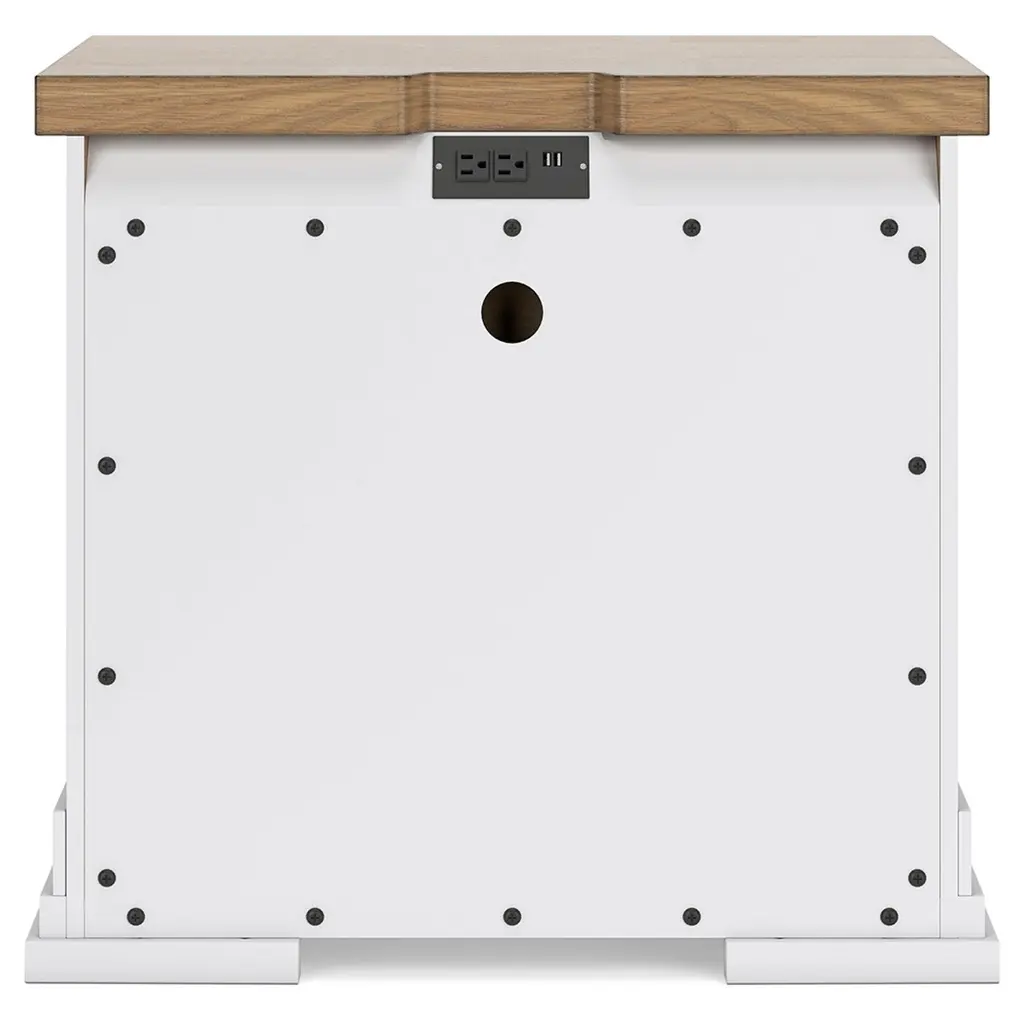 Casual style with substance. This two-tone nightstand raises the bar on comfortably cozy design in your soothing sanctuary. A sturdy silhouette with a classic white finish and black metal hardware exudes modern farmhouse vibes. The butcher block oak veneer top adds a relaxed aesthetic. And bedside charging for your go-to devices is made easy with power outlets and USB ports.