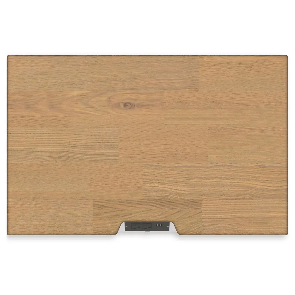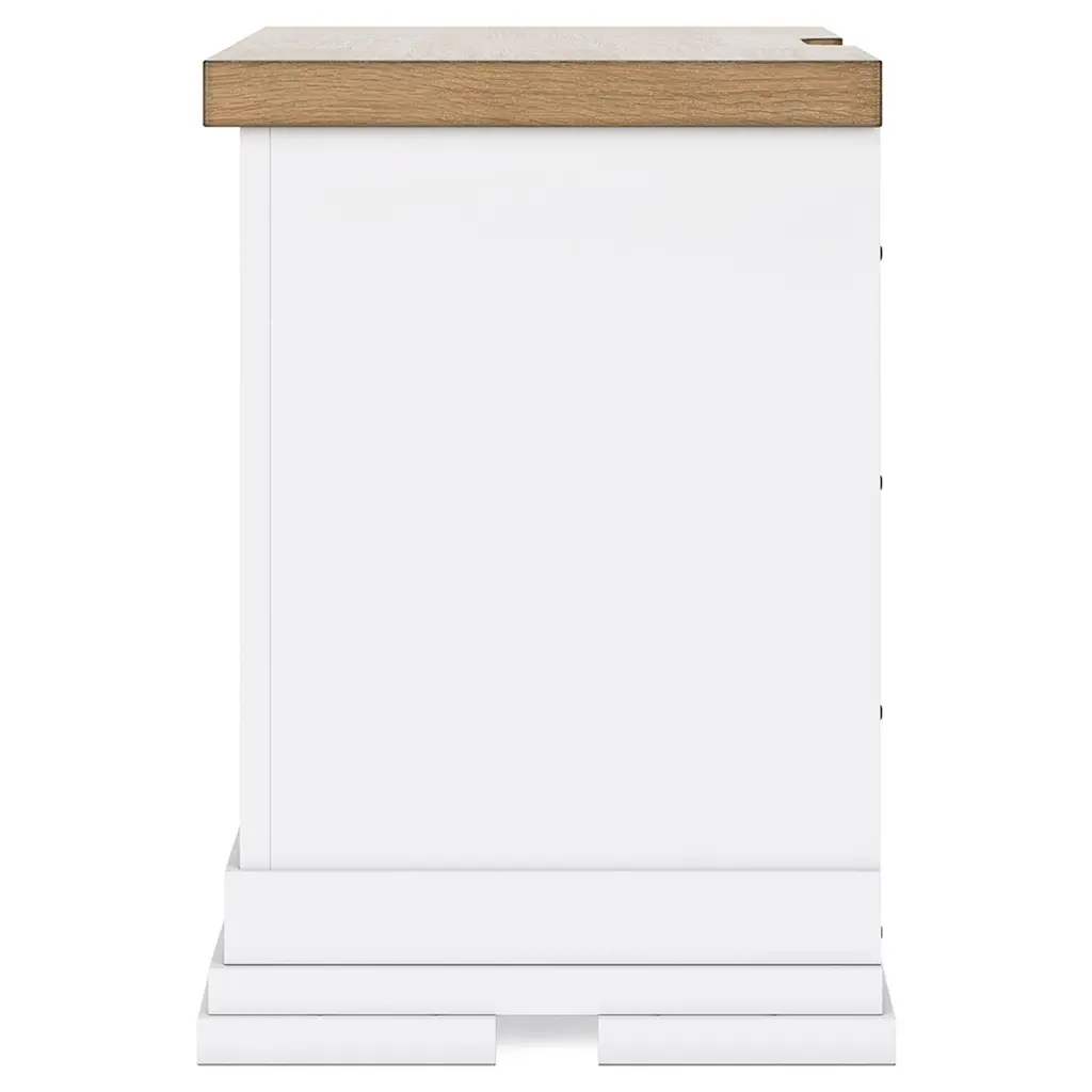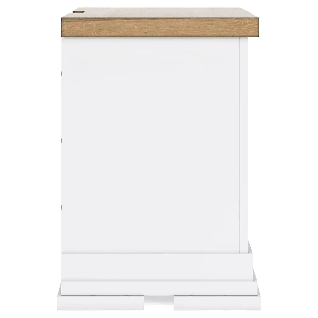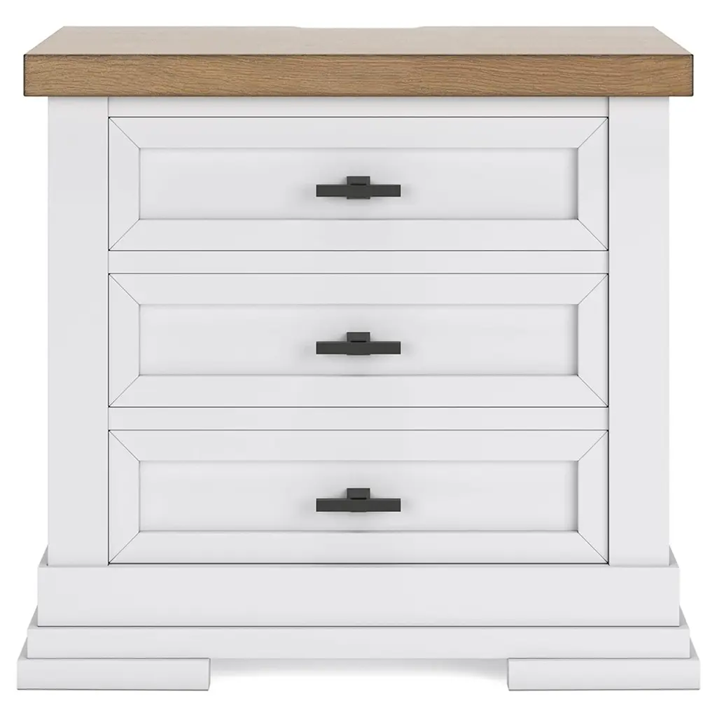 Casual style with substance. This two-tone nightstand raises the bar on comfortably cozy design in your soothing sanctuary. A sturdy silhouette with a classic white finish and black metal hardware exudes modern farmhouse vibes. The butcher block oak veneer top adds a relaxed aesthetic. And bedside charging for your go-to devices is made easy with power outlets and USB ports.