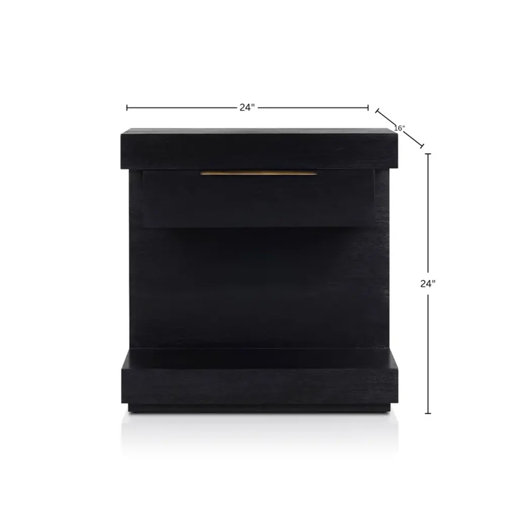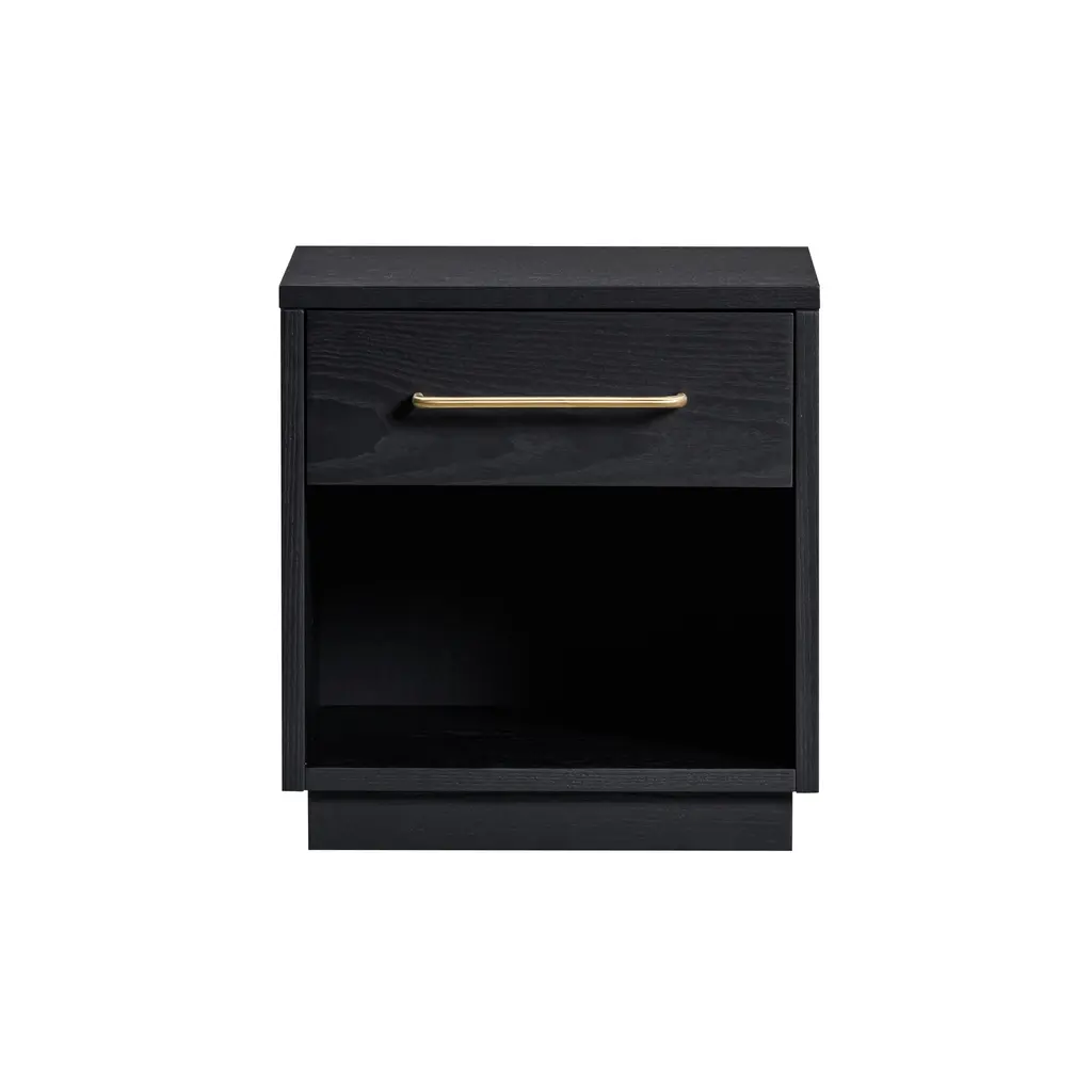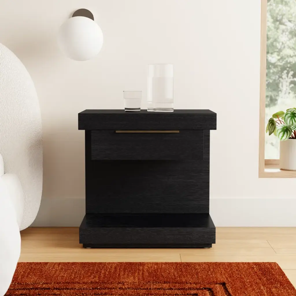 The Xavier Nightstand in Black exudes modern sophistication with its sleek lines and functional design. Equipped with soft-close ball bearing glides, a fixed shelf, and a single drawer, this fully assembled nightstand offers ample storage while maintaining a minimalist aesthetic. The English dovetail construction ensures long-lasting durability.