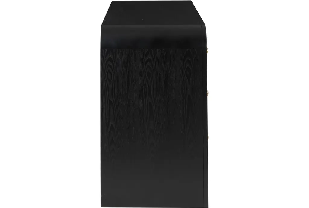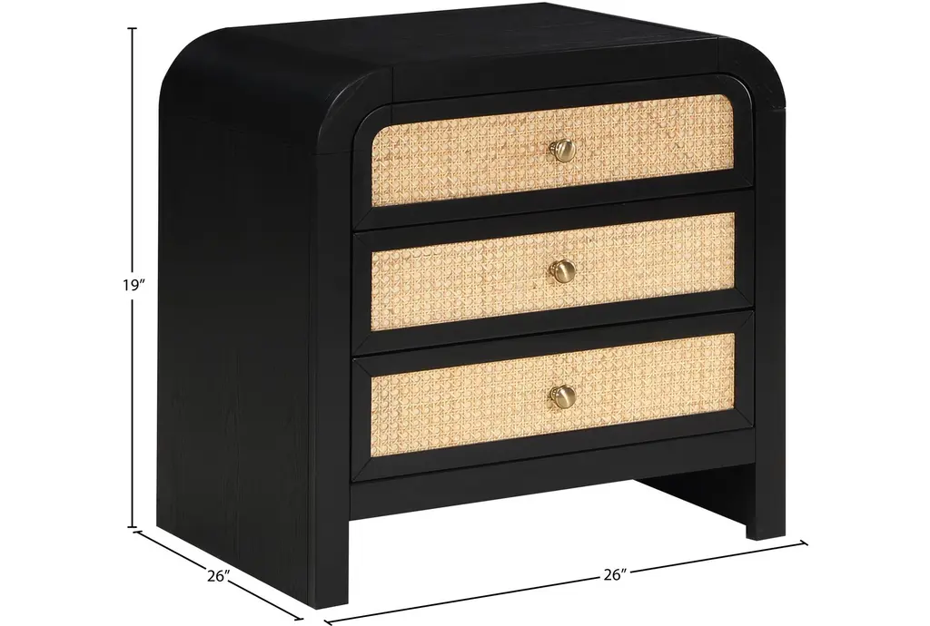 Introducing the Astralis Black & Natural Wood Cane 3-Drawer Nightstand, a modern blend of style and functionality for your bedroom or kids' room. This nightstand features a striking black finish complemented by natural cane drawer fronts, creating a unique, contemporary look. The solid ash wood construction ensures durability and longevity.