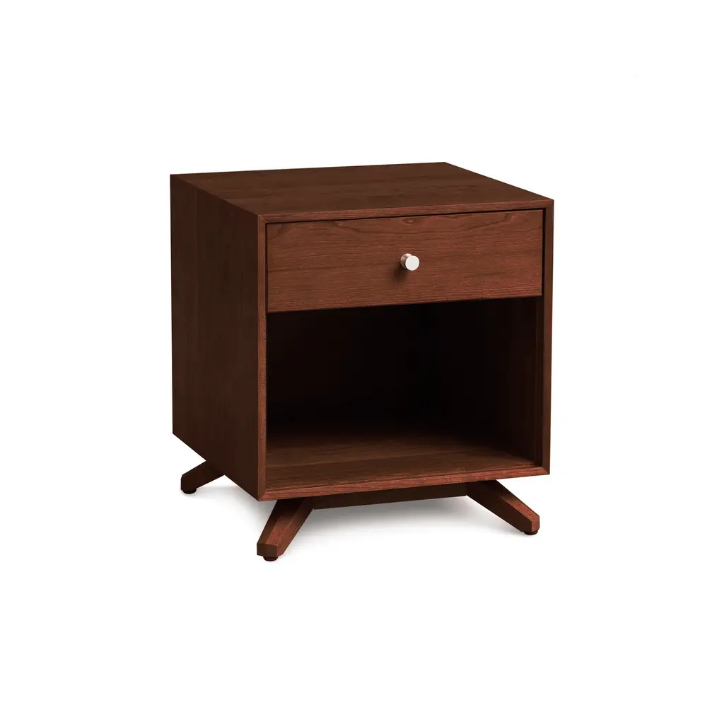 The Astrid 1 Drawer Nightstand by Copeland Furniture has a simple, vintage influence with splayed legs peeking from the base and natural wood finish. Hand-crafted with sustainable hardwood and constructed in Vermont, the hourglass nickel brushed knob adds a modern flare to its natural esthetic. The collection is crafted in solid cherry hardwood, solid walnut and dark chocolate maple or solid maple with several finish options. Features