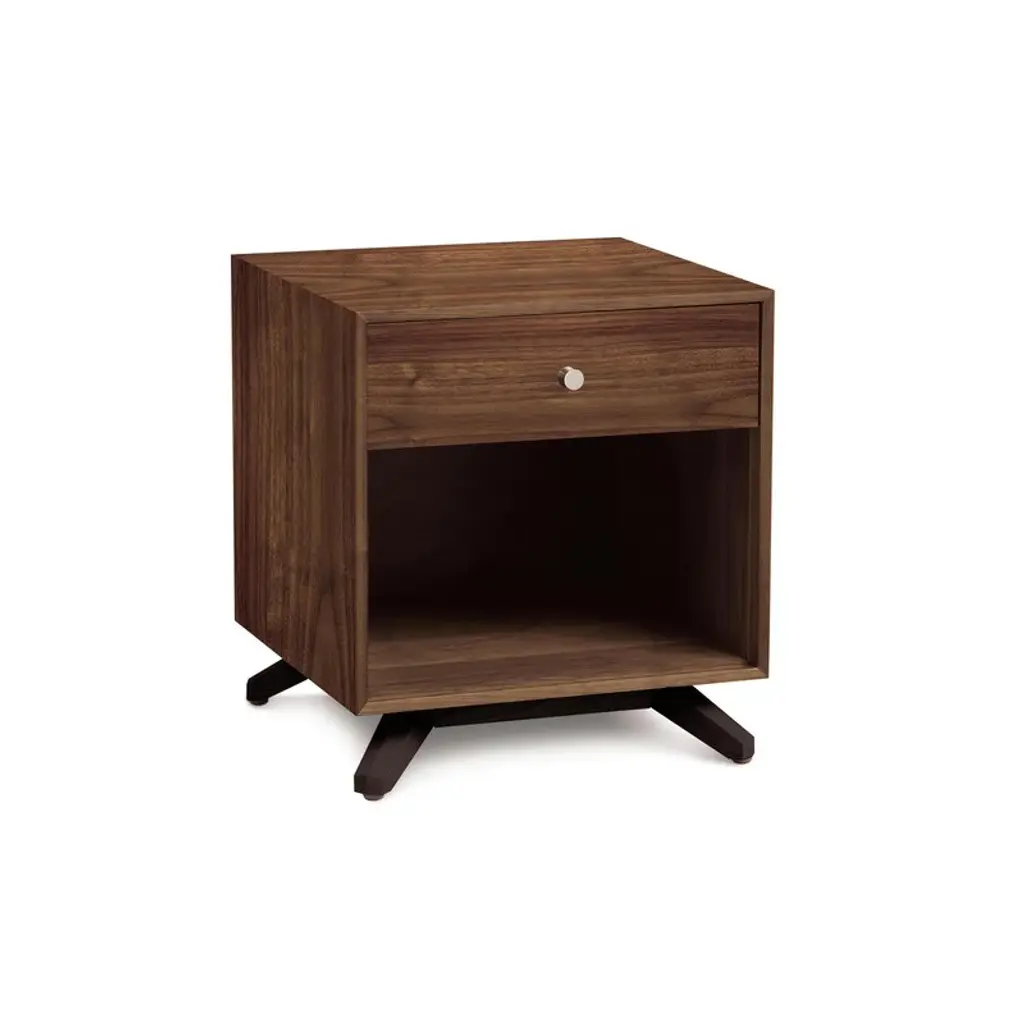 The Astrid 1 Drawer Nightstand by Copeland Furniture has a simple, vintage influence with splayed legs peeking from the base and natural wood finish. Hand-crafted with sustainable hardwood and constructed in Vermont, the hourglass nickel brushed knob adds a modern flare to its natural esthetic. The collection is crafted in solid cherry hardwood, solid walnut and dark chocolate maple or solid maple with several finish options. Features