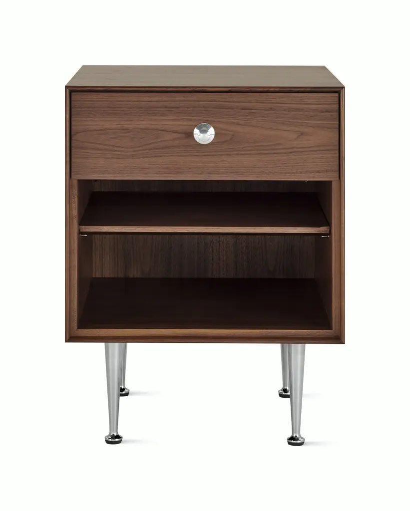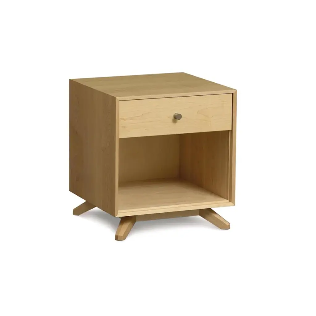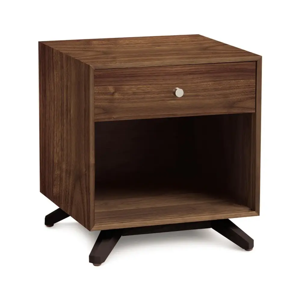 The Astrid 1 Drawer Nightstand by Copeland Furniture has a simple, vintage influence with splayed legs peeking from the base and natural wood finish. Hand-crafted with sustainable hardwood and constructed in Vermont, the hourglass nickel brushed knob adds a modern flare to its natural esthetic. The collection is crafted in solid cherry hardwood, solid walnut and dark chocolate maple or solid maple with several finish options. Features