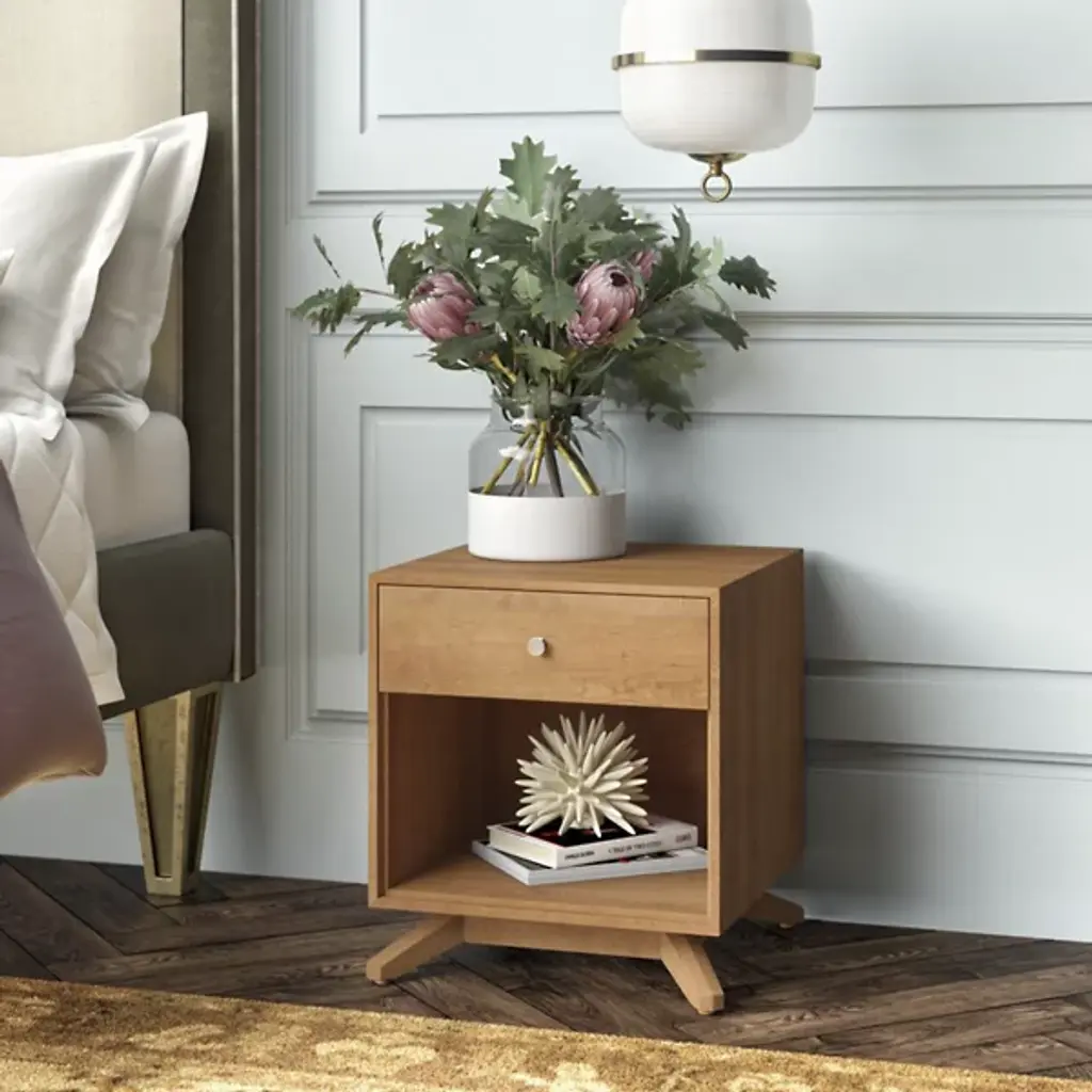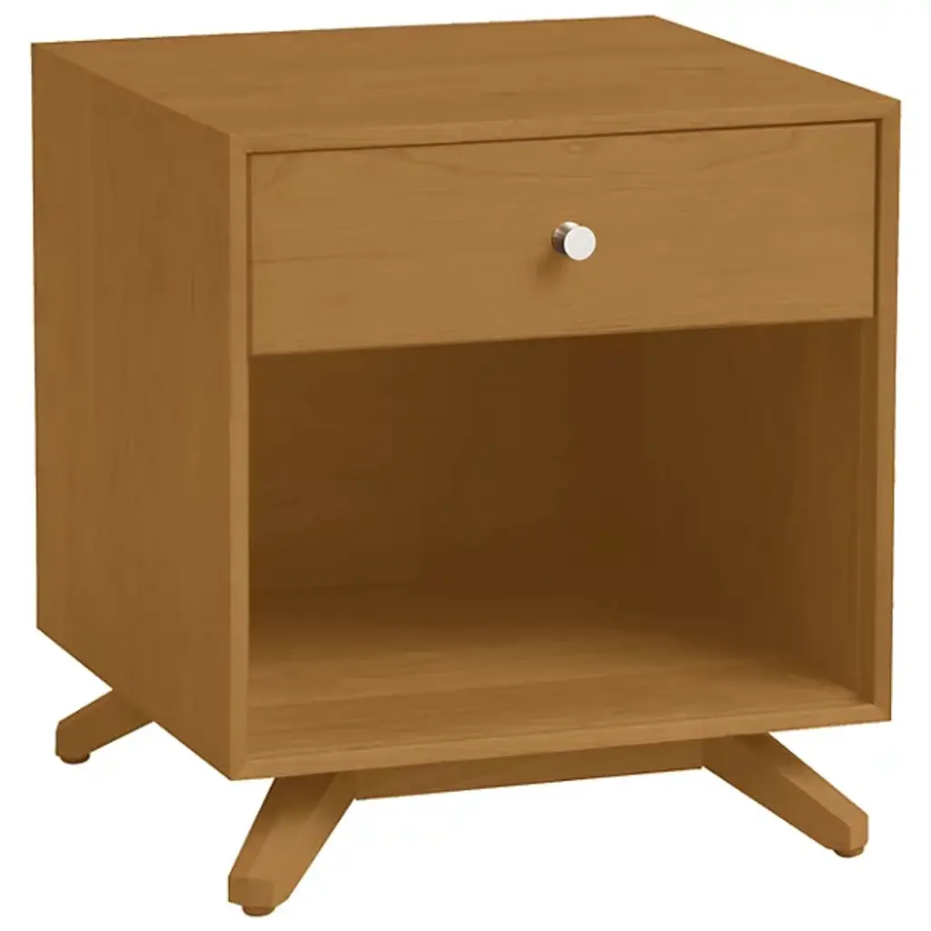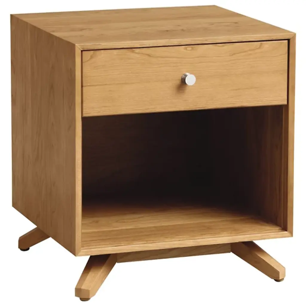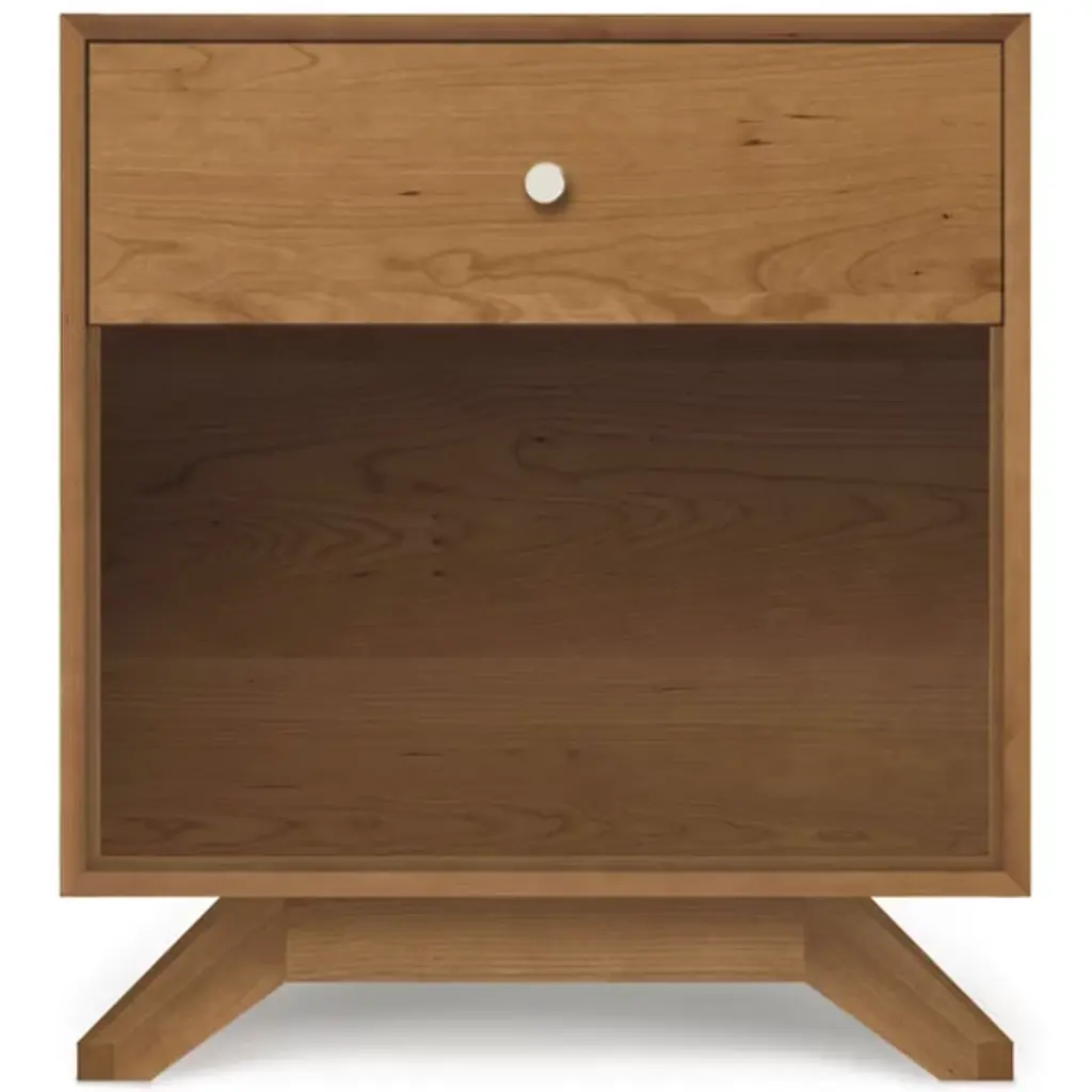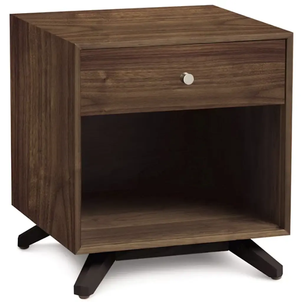 The Copeland Furniture Astrid 1 Drawer Nightstand is a convenient bedside table that has the same dynamic splayed legs as its larger companion, the Astrid Bed. It also includes a single drawer and open shelf for extra storage in the bedroom. It is made out of solid hardwood in a variety of finishes protected by a Greenguard certified top coat.