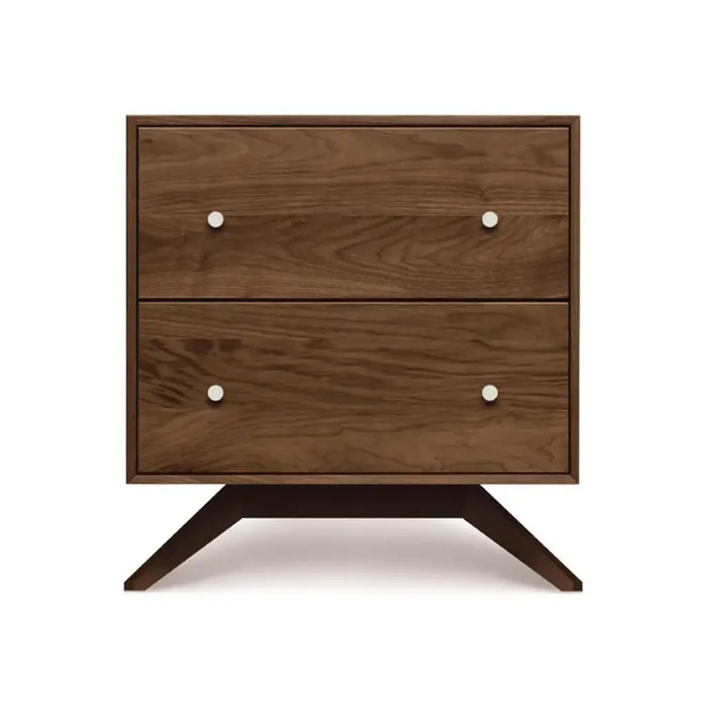 Elevate your favorite sleep spaces with the sleek and sophisticated Astrid 2 Drawer Nightstand from Copeland. With its bold cantilever design and luxurious combination of solid walnut and dark chocolate maple, this nightstand is an engineering marvel. Soft-close drawers and brushed nickel knobs add to its refined appeal. Highlights