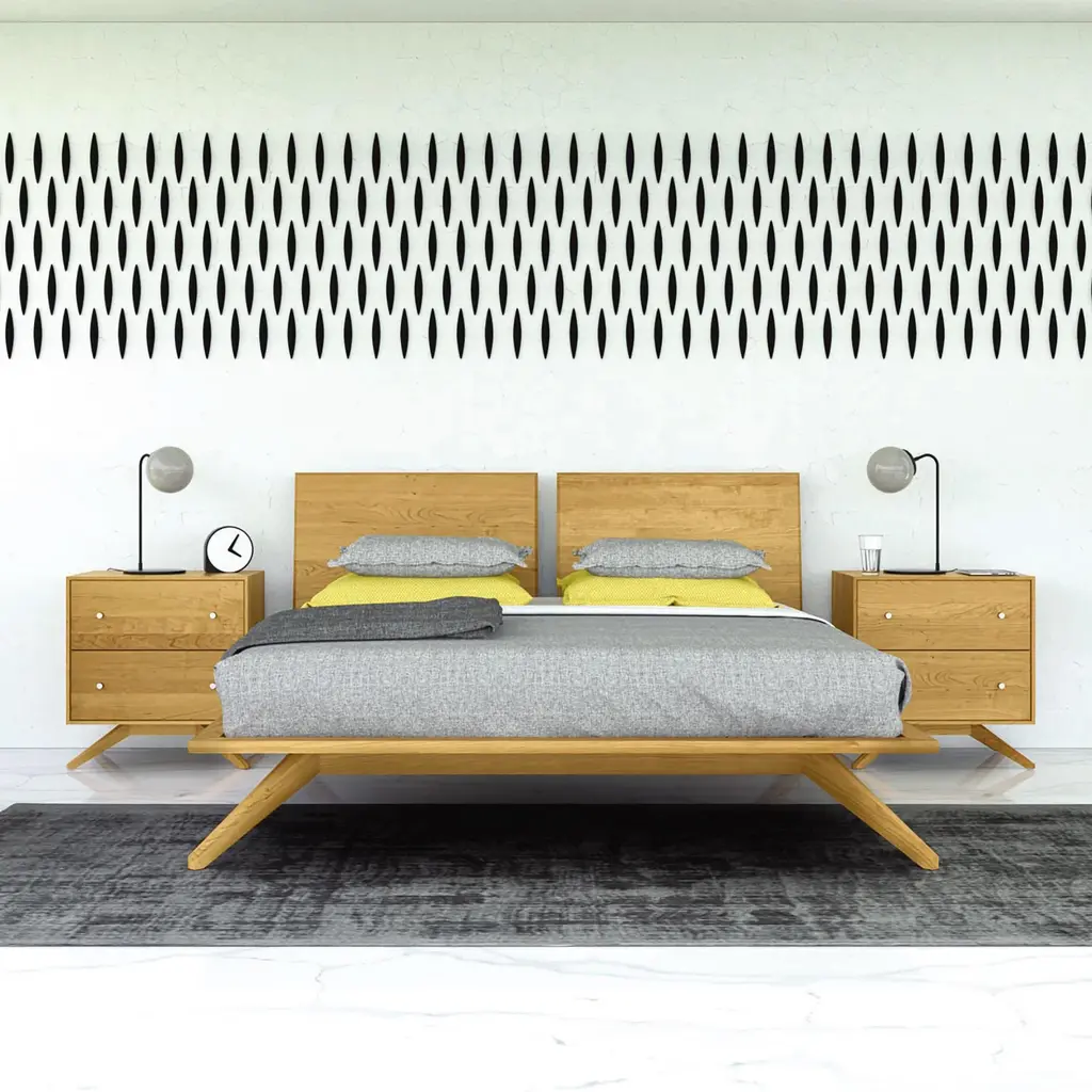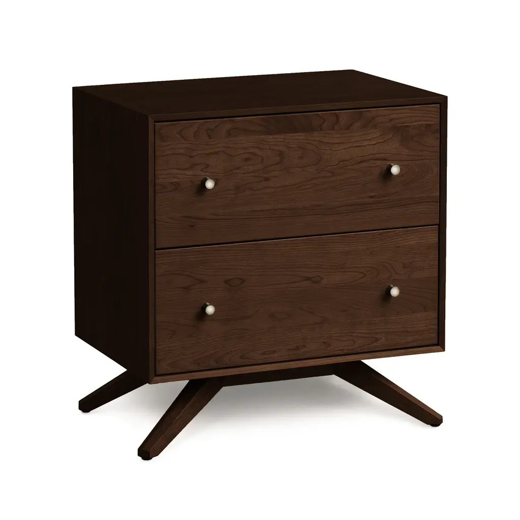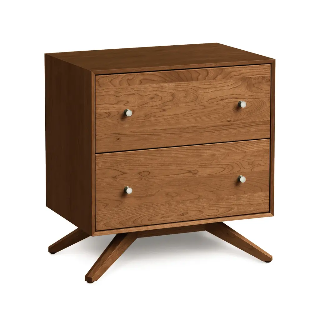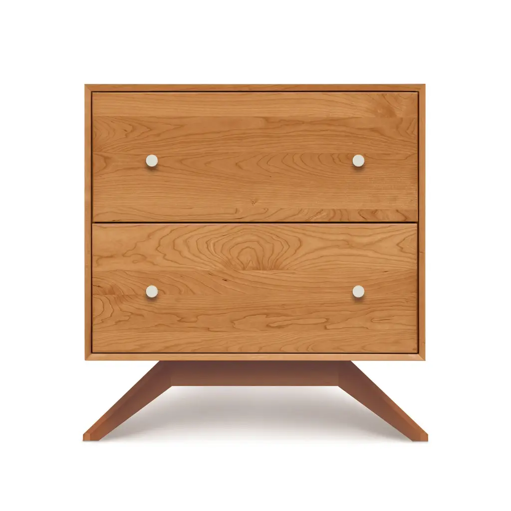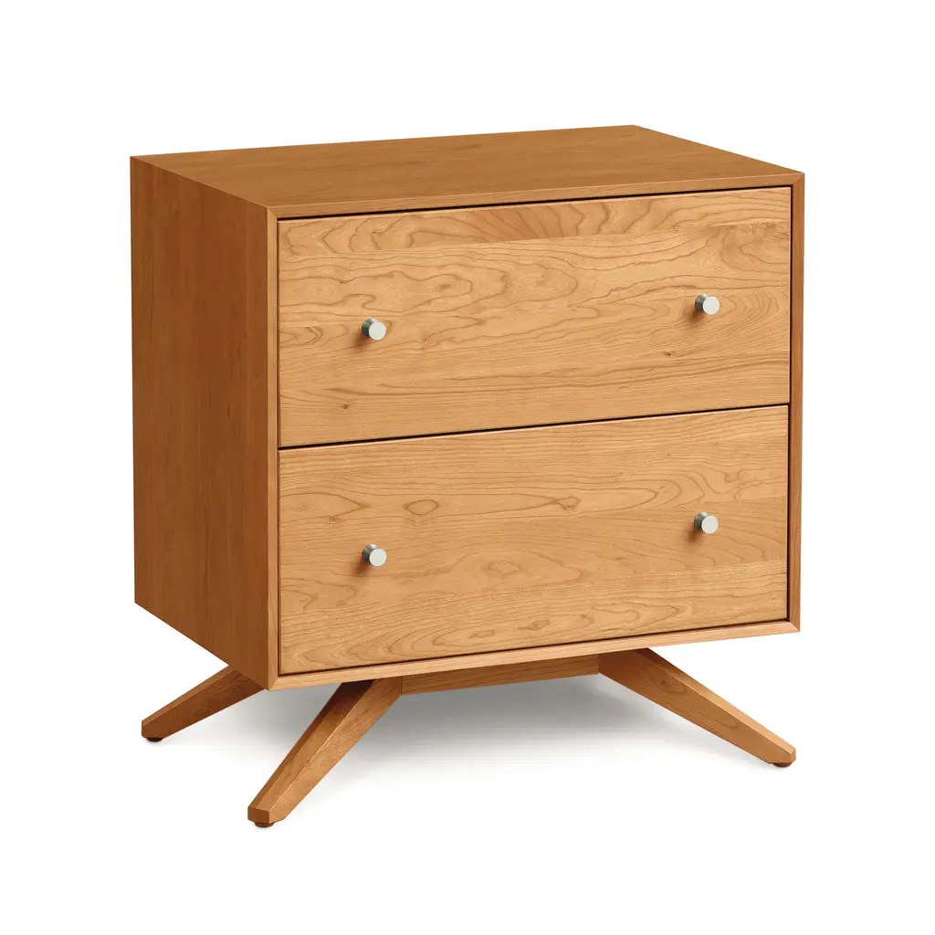Our Astrid 2-Drawer Nightstand showcases a modern design featuring crisp straight corners and lines, and deeply splayed legs. The unusual splayed leg engineering of this designer piece produces dramatic, futuristic cantilevers and is beautifully complemented with 45 degree precision mitered corners.Our Astrid Bedroom Furniture Collection, named after a beautiful Scandinavian goddess, is an engineering feat that defies expectations and inspires a sense of possibility. Skillfully crafted in Vermont by Copeland Furniture, Astrid's clean, simple design creates a symphony of quiet harmony for your high-end contemporary bedroom.Base price represents nightstand in natural cherryShown in natural cherryMatching furniture available in our Astrid Furniture CollectionNatural variations in solid wood and hand applied finishes make each piece unique. Slight grain and finish irregularities tell you that the furniture has been crafted from solid wood and are considered hallmarks of quality.
