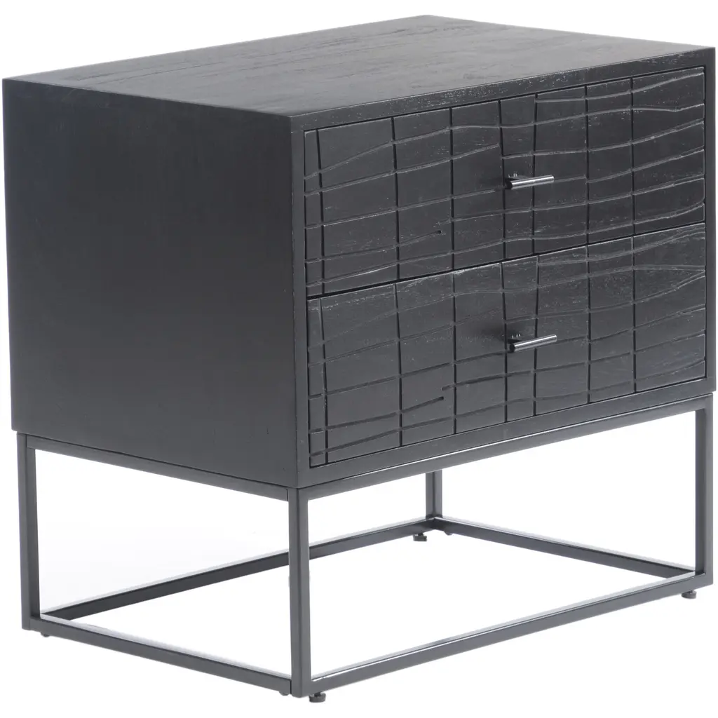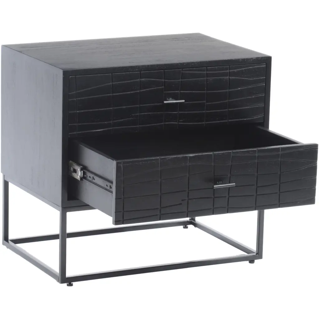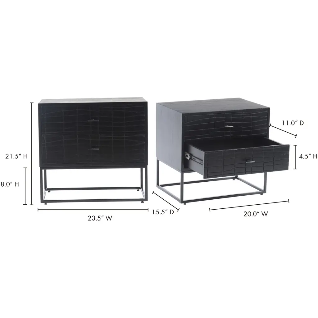 A slick black look. The Atelier nightstand features two sliding drawers with a textured detailing. A cool iron frame supports this minimal stand. The ideal stylish spot for a complementary lamp, candle, or cup of tea.