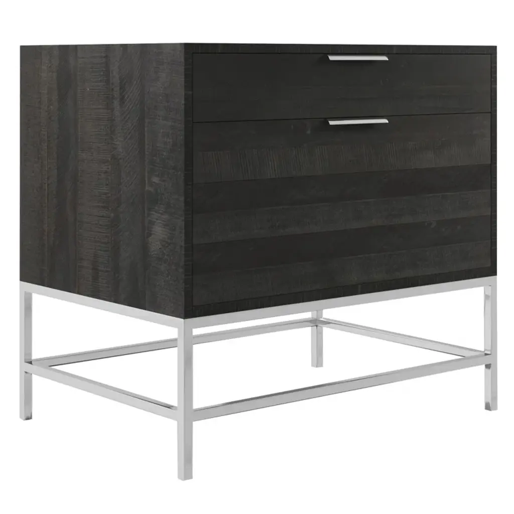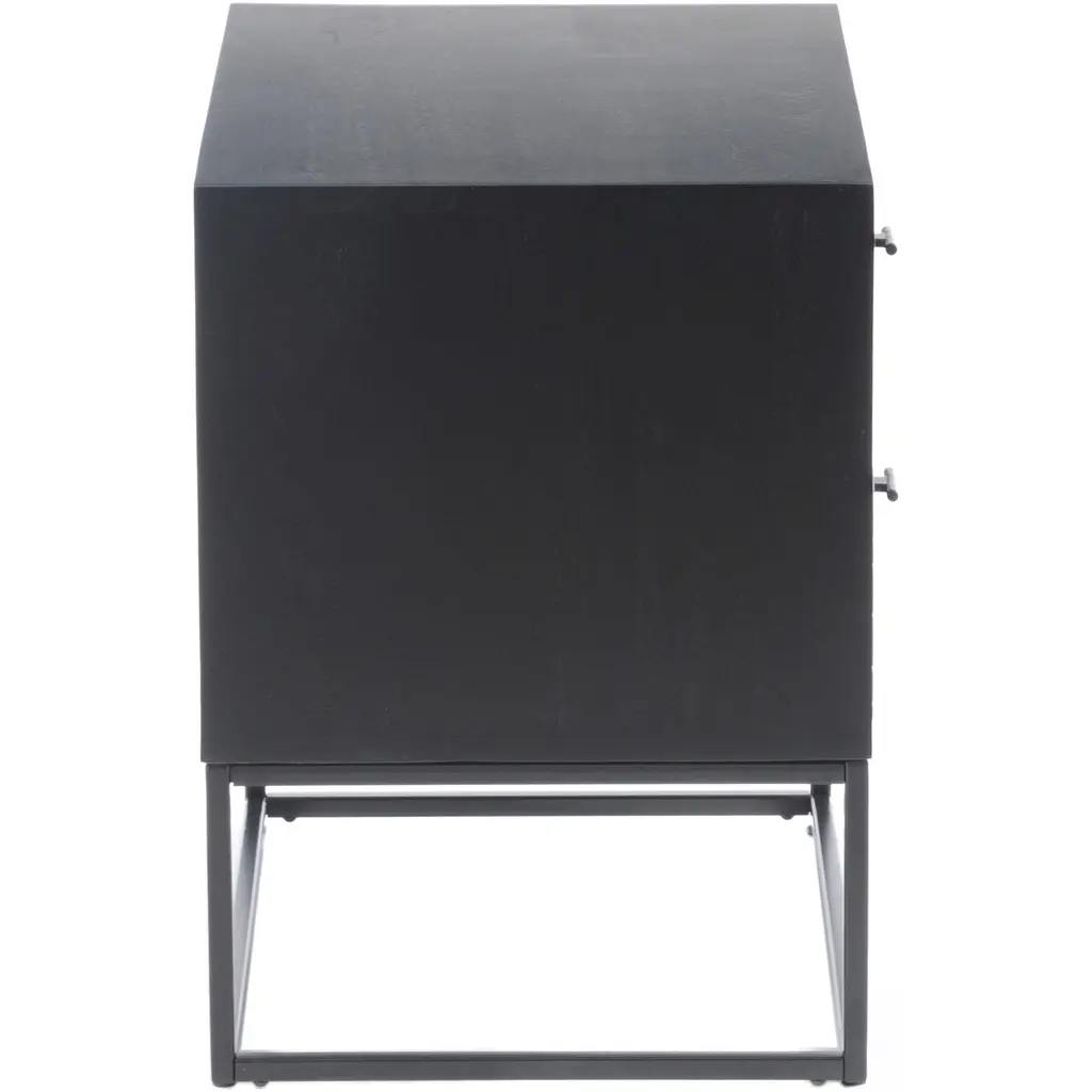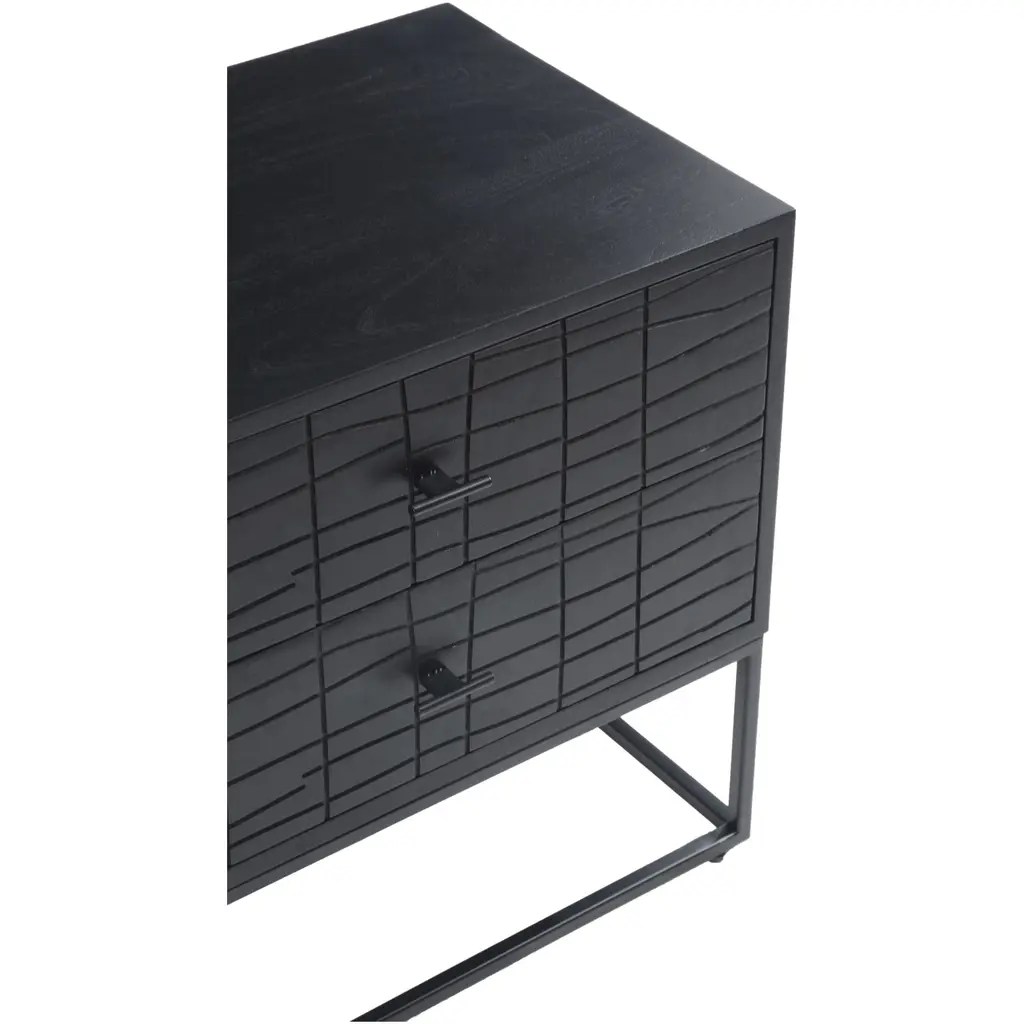A slick black look. The Atelier nightstand features two sliding drawers with a textured detailing. A cool iron frame supports this minimal stand. The ideal stylish spot for a complementary lamp, candle, or cup of tea.