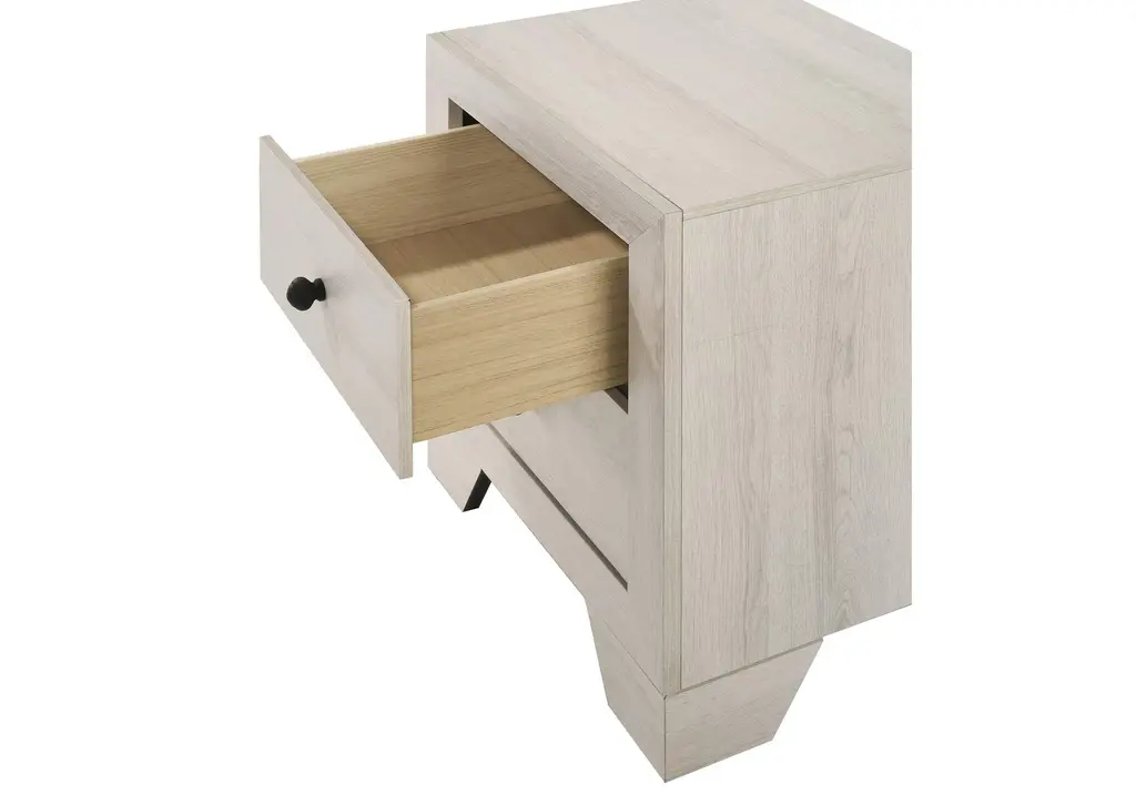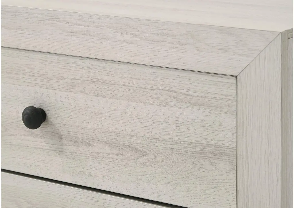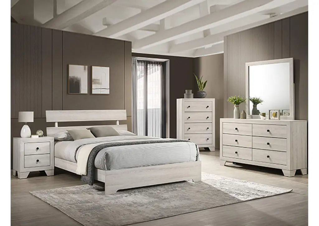 This bedroom collection embodies a rustic, yet contemporary aesthetic with its clean lines and neutral color palette. The set includes a low-profile bed frame, a dresser with a mirror, and a tall chest, all finished in a versatile white wash that easily complements any decor. The sleek metal handles on the drawers add a touch of contemporary flair, while the large mirror reflects light, making the space feel brighter and more open. Weight 46.300 lbs. (20.84kgs.)