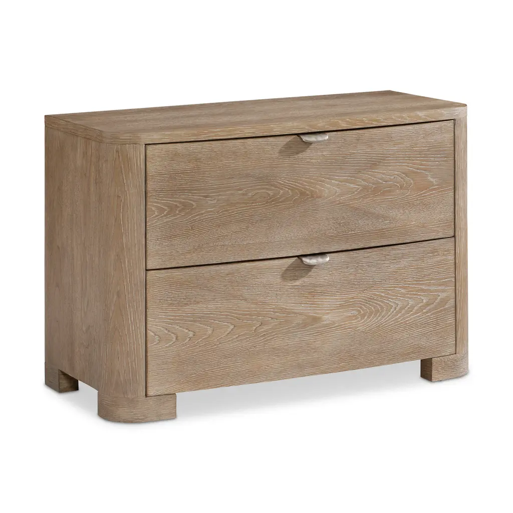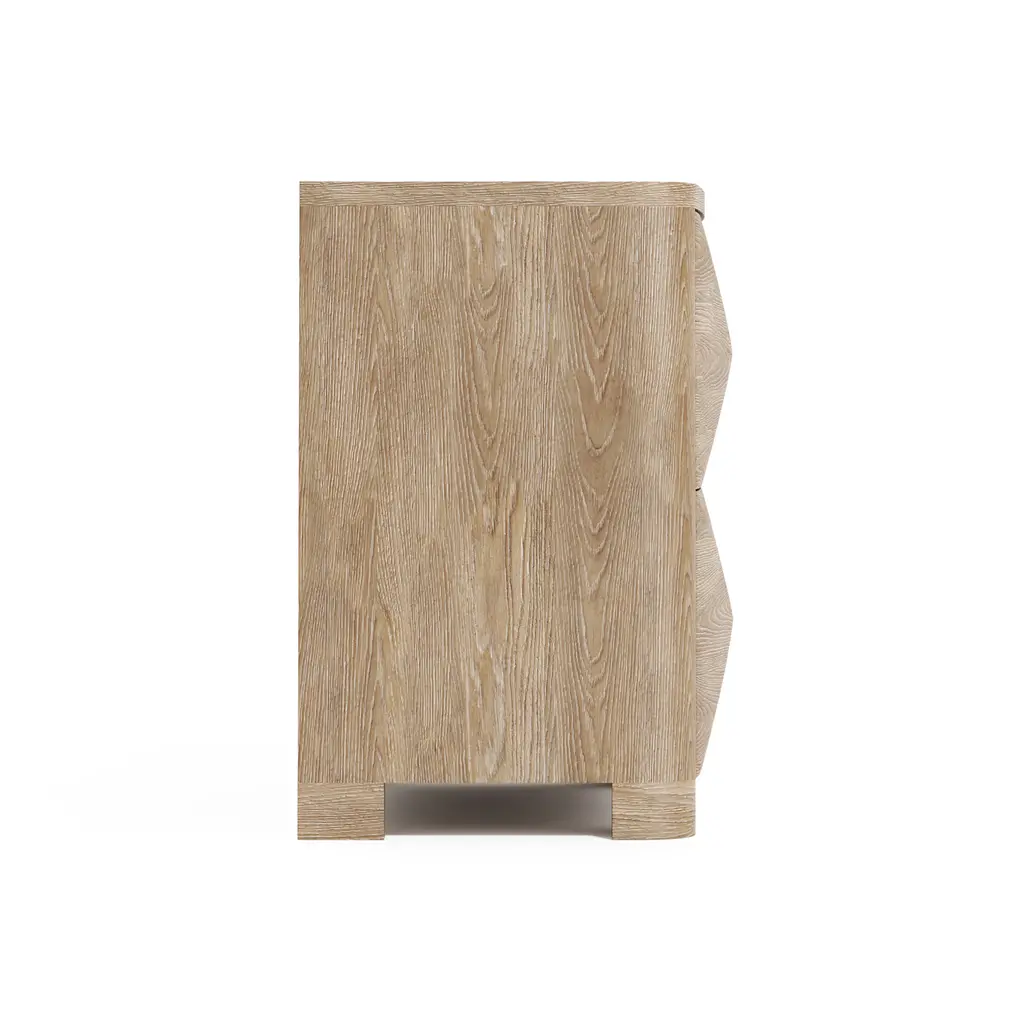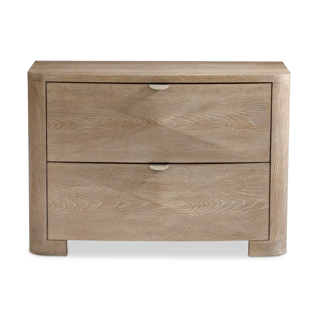 The Aventura Nightstand from Bernhardt captivates with its dimensional pyramid shaping and elegant bow front design. Featuring two drawers with sleek tab pulls, it combines style with practicality through a built-in two-port USB charging system discreetly located on the back. Finished in Marcona, this piece balances chic sophistication with rustic charm, making it a refined addition to any bedroom. Highlights